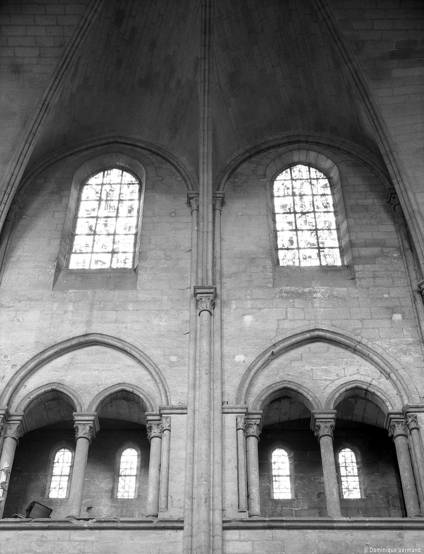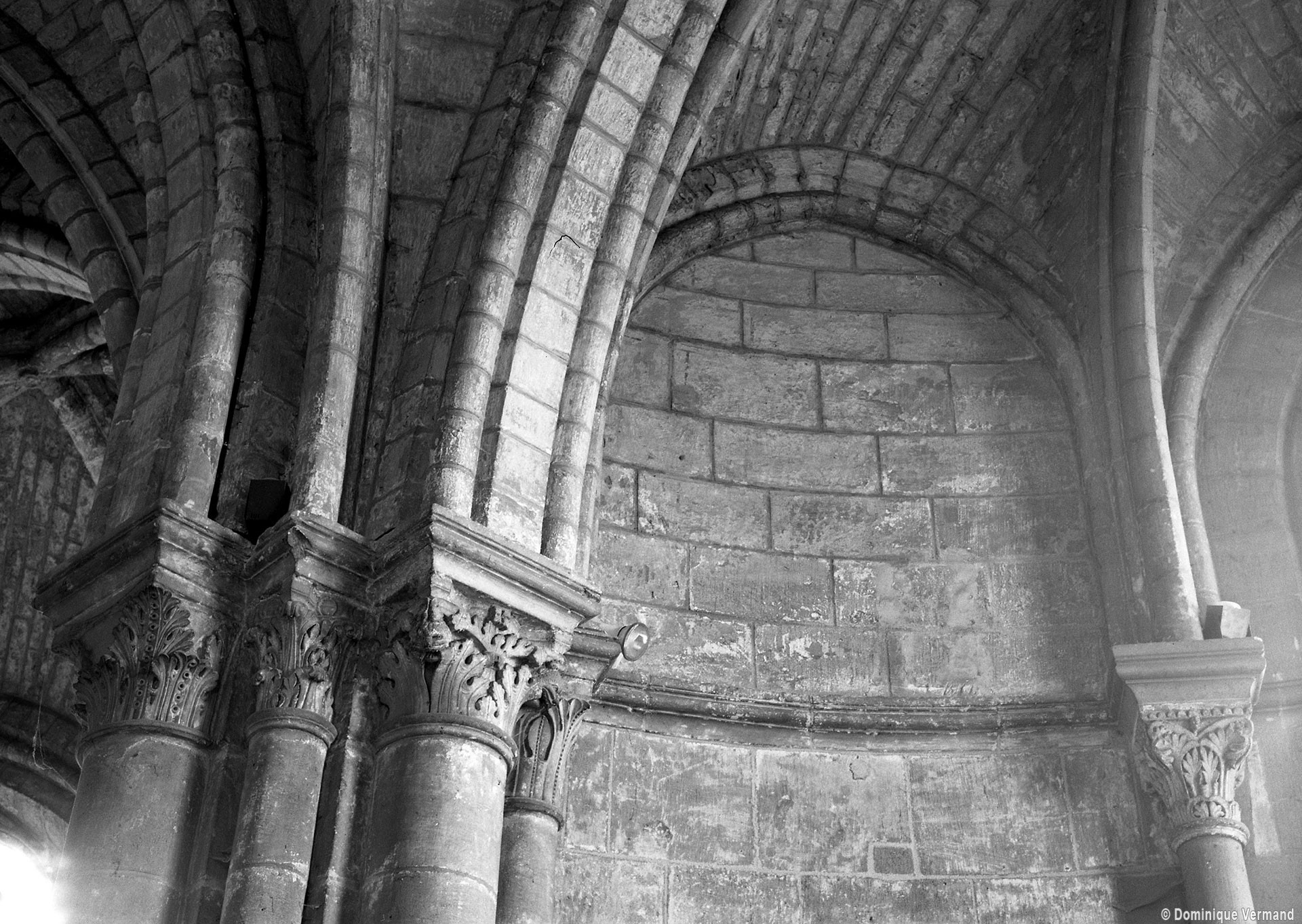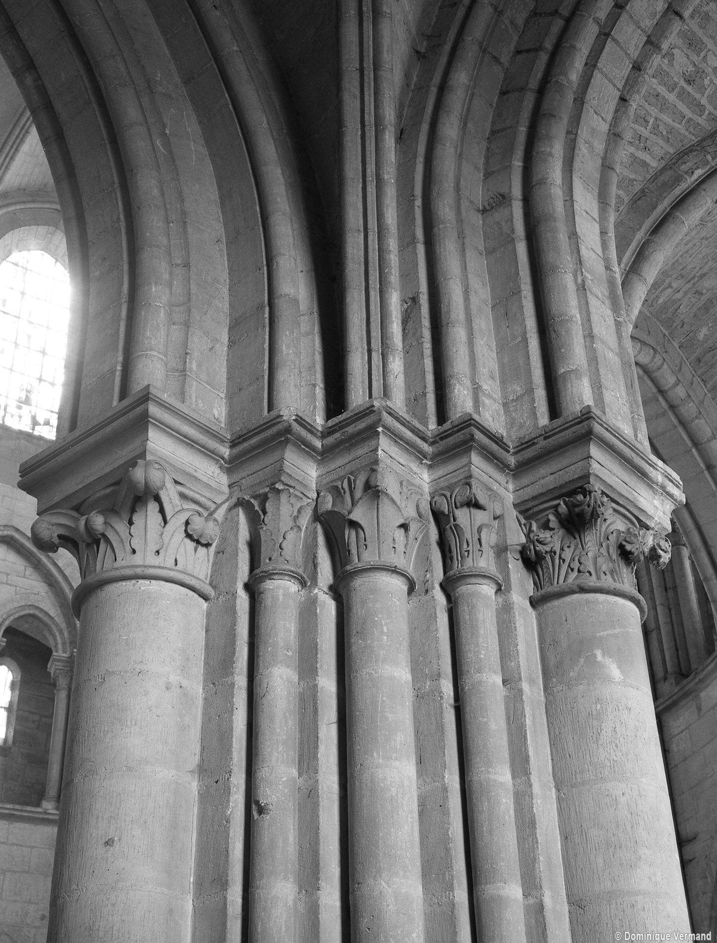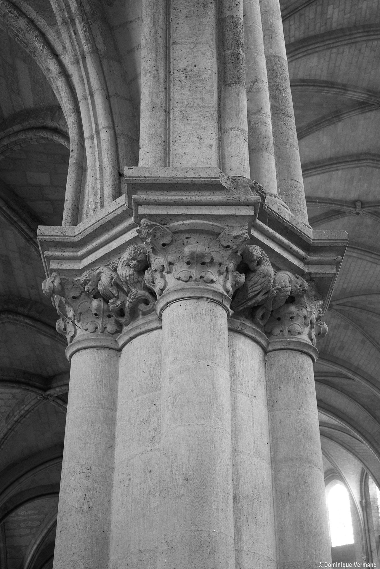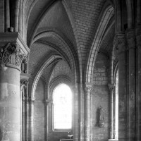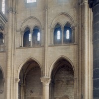Après une interruption, les travaux reprennent avec la construction de l’hémicycle et des travées droites. Si l’alternance des piles (pile “forte” composée et pile “faible” cylindrique) de la travée droite et l’élévation à trois étages – grandes arcades, tribunes (ici non voûtées) et fenêtres hautes – font directement référence à Senlis, il n’en est pas de même du dessin des arcades des tribunes, du traitement de la retombée des voûtes ou du décor plus naturaliste des chapiteaux, qui sont directement repris du choeur de Saint-Germain-des-Prés et de la cathédrale Notre-Dame de Paris, cette dernière alors en cours de construction. D’une manière qu’on pourrait croire symbolique, le rond-point du chœur associe d’ailleurs la pile cylindrique telle qu’on la trouve dans ces deux édifices et la mince colonne monolithique de Saint-Denis et Senlis.