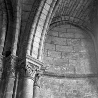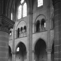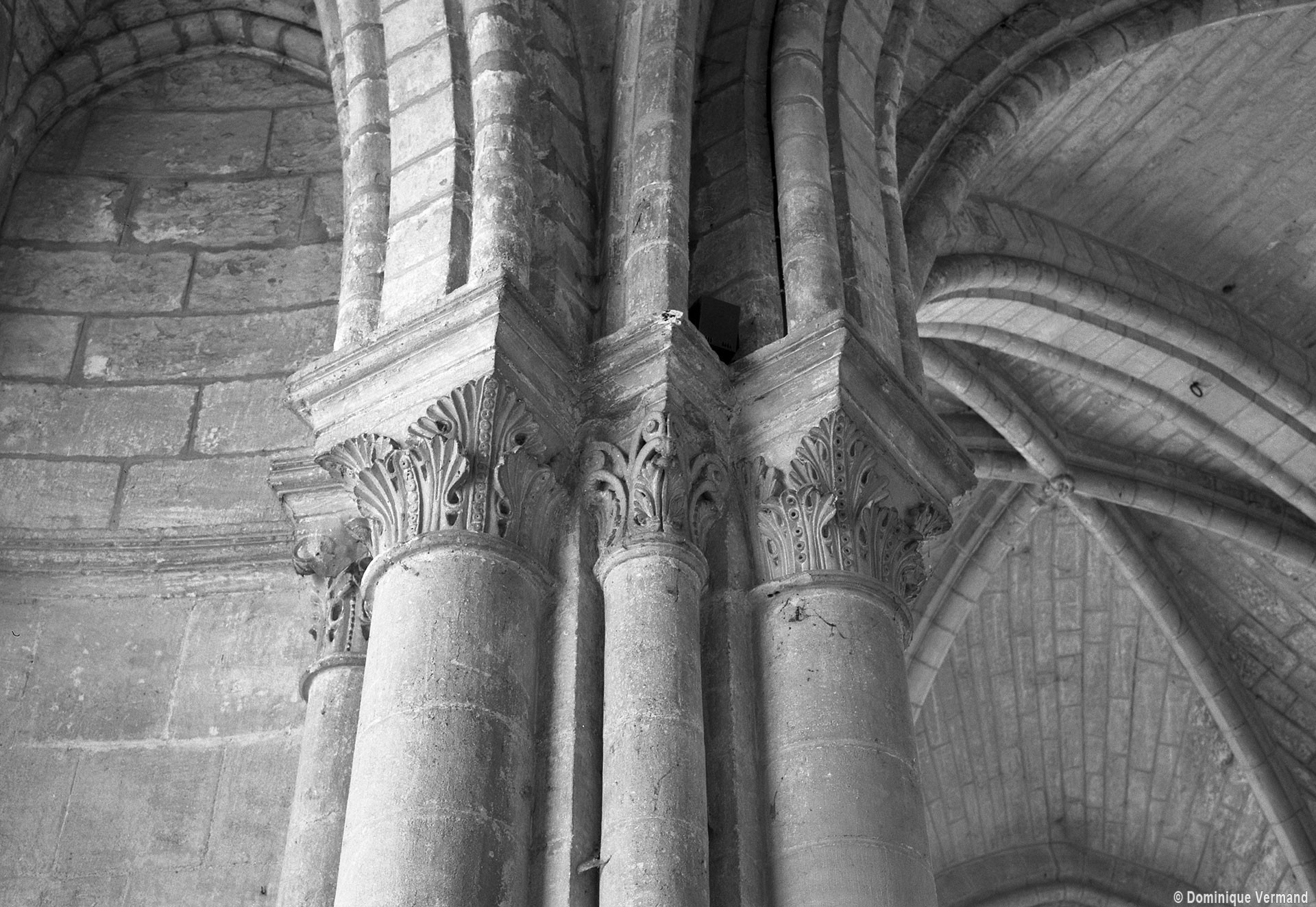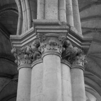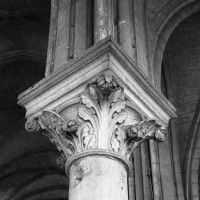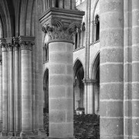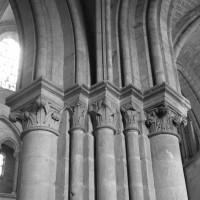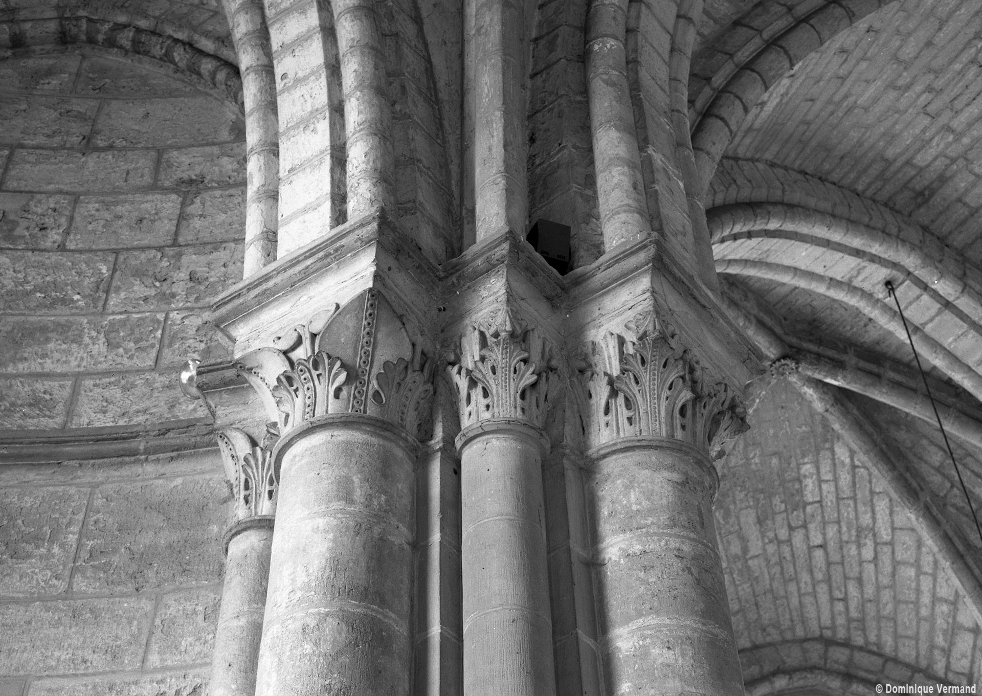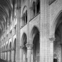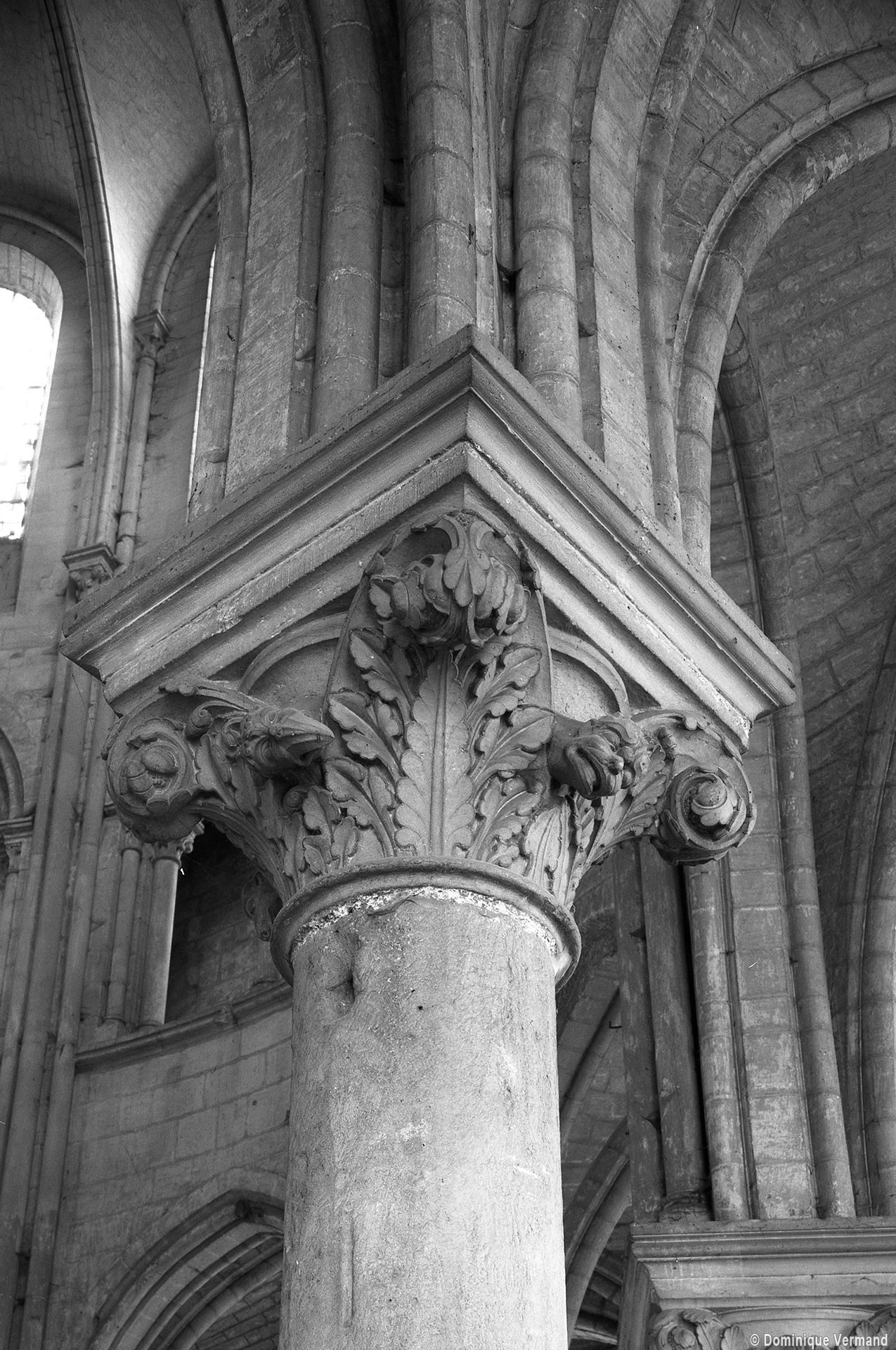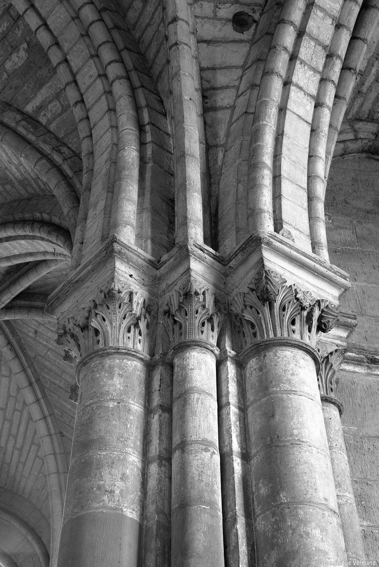 Après une interruption, les travaux reprennent avec la construction de l’hémicycle et des travées droites. Si l’alternance des piles (pile “forte” composée et pile “faible” cylindrique) de la travée droite et l’élévation à trois étages – grandes arcades, tribunes (ici non voûtées) et fenêtres hautes – font directement référence à Senlis, il n’en est pas de même du dessin des arcades des tribunes, du traitement de la retombée des voûtes ou du décor plus naturaliste des chapiteaux, qui sont directement repris du choeur de Saint-Germain-des-Prés et de la cathédrale Notre-Dame de Paris, cette dernière alors en cours de construction. D’une manière qu’on pourrait croire symbolique, le rond-point du chœur associe d’ailleurs la pile cylindrique telle qu’on la trouve dans ces deux édifices et la mince colonne monolithique de Saint-Denis et Senlis.