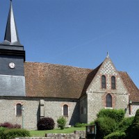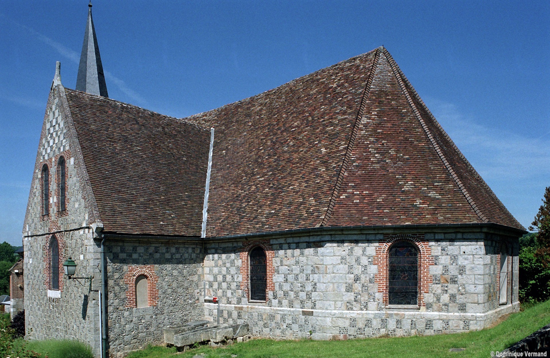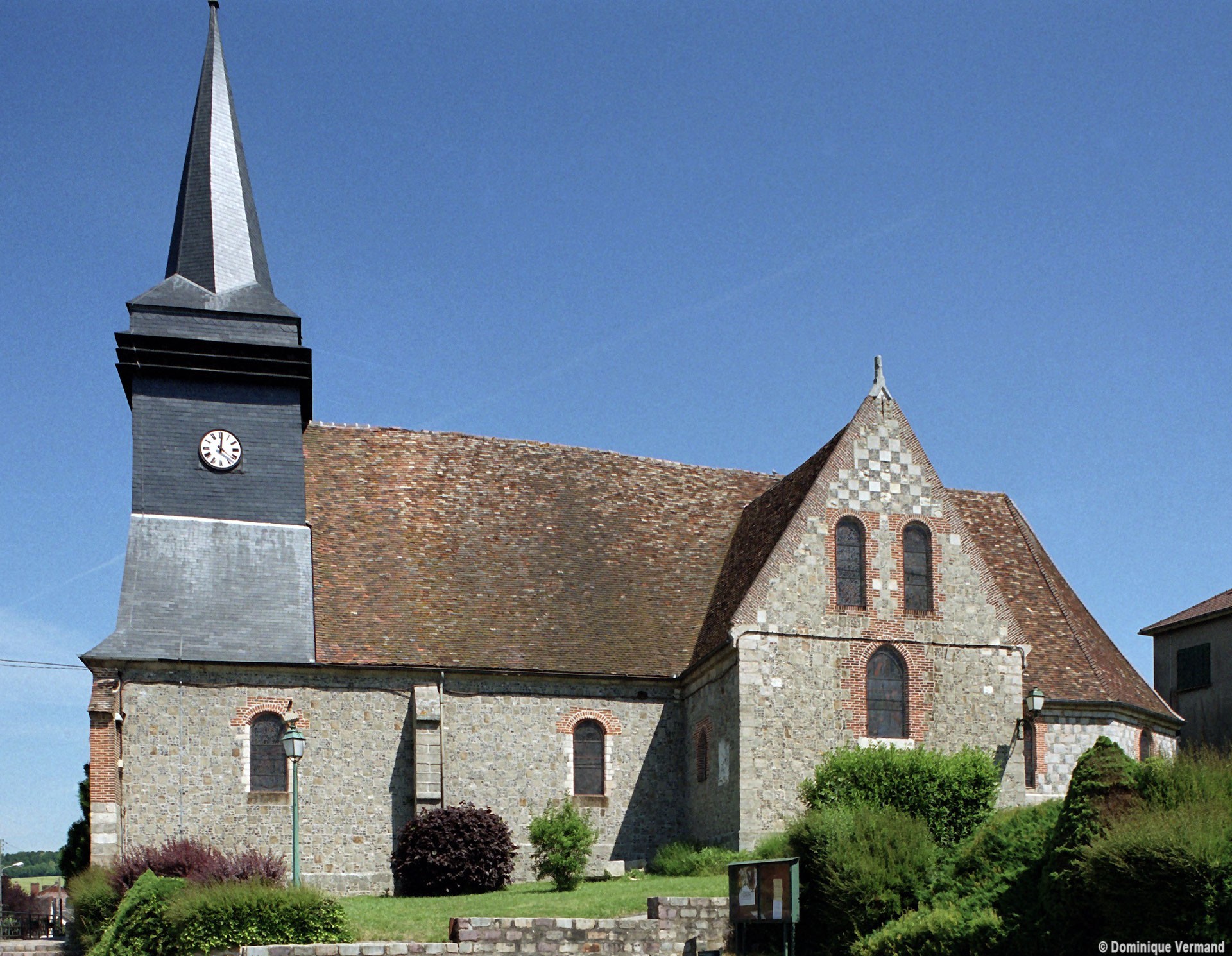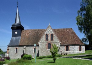 Bâtie au 16ème siècle – Graves mentionne la date de 1549 – l’église Saint-Omer est un édifice relativement homogène dont le plan comprend une nef unique, un transept saillant et un choeur avec abside à trois pans. Le mur nord, bâti en silex et pourvu d’une petite fenêtre en lancette trilobée, est cependant plus ancien et la façade paraît être du 18ème siècle.