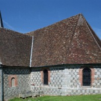 A l’extérieur, l’édifice est remarquable pour ses maçonneries en damier de silex et de grès, qui comptent parmi les plus représentatives d’une technique très répandue dans une région où la pierre calcaire fait défaut. Toutes les fenêtres sont en briques, un matériau facile à appareiller pour les ouvertures. Les pignons du transept sont ajourés chacun par des doubles fenêtres, une disposition qui s’explique par la charpente qui couvre tout l’intérieur de l’édifice.