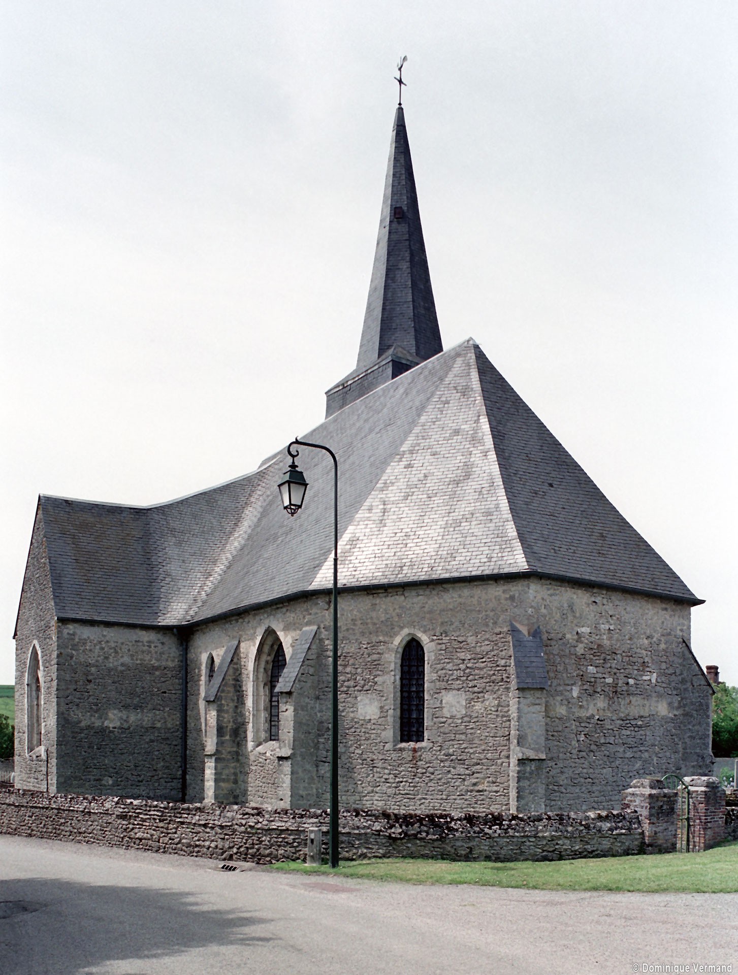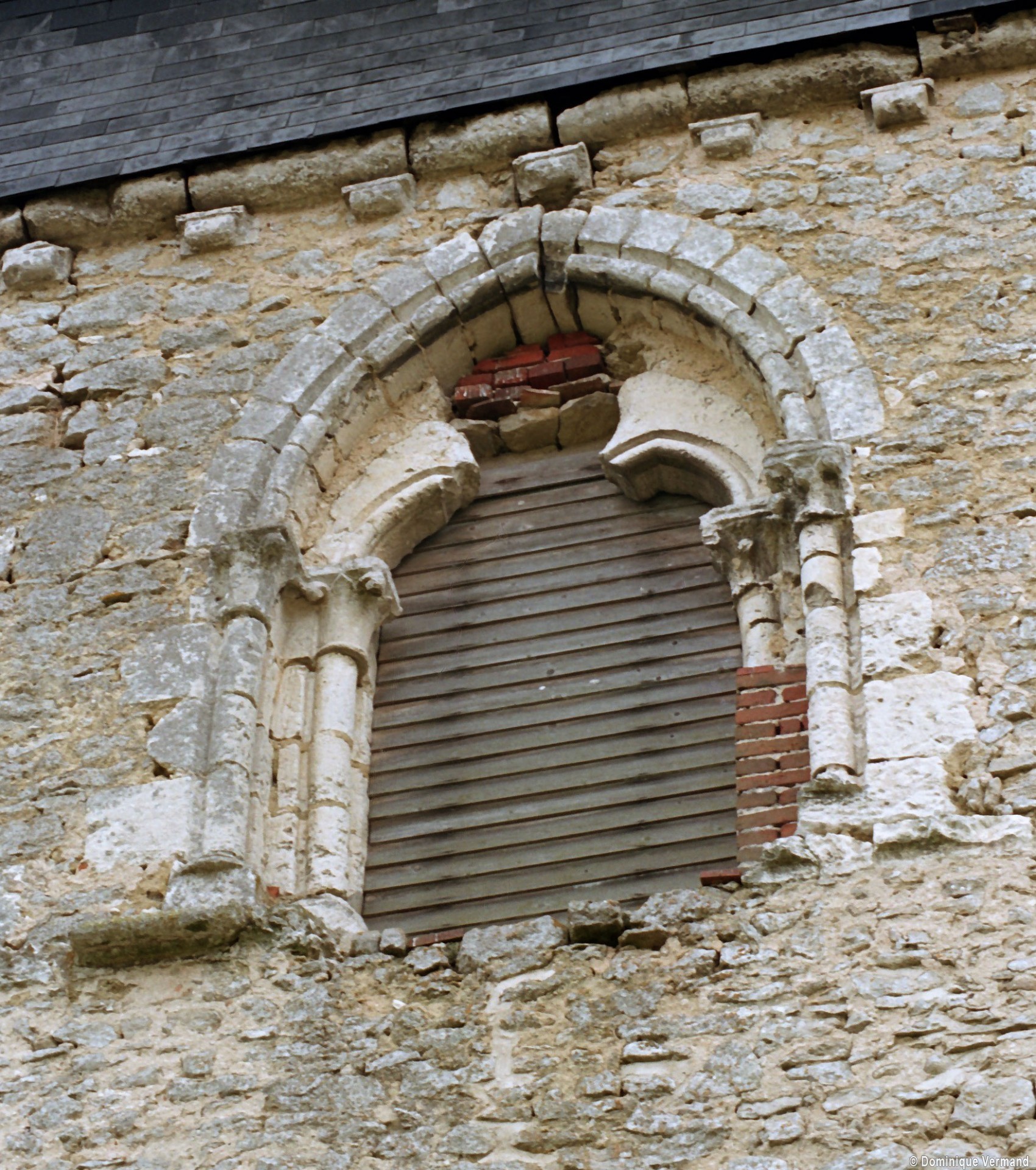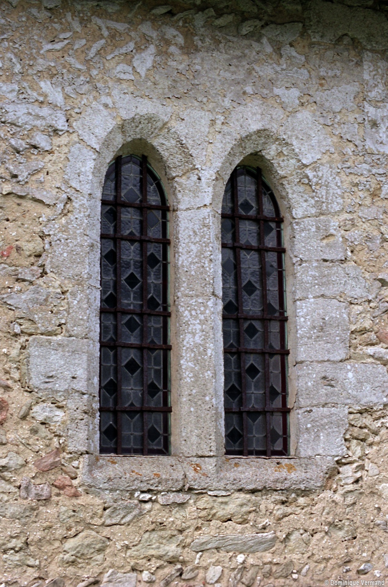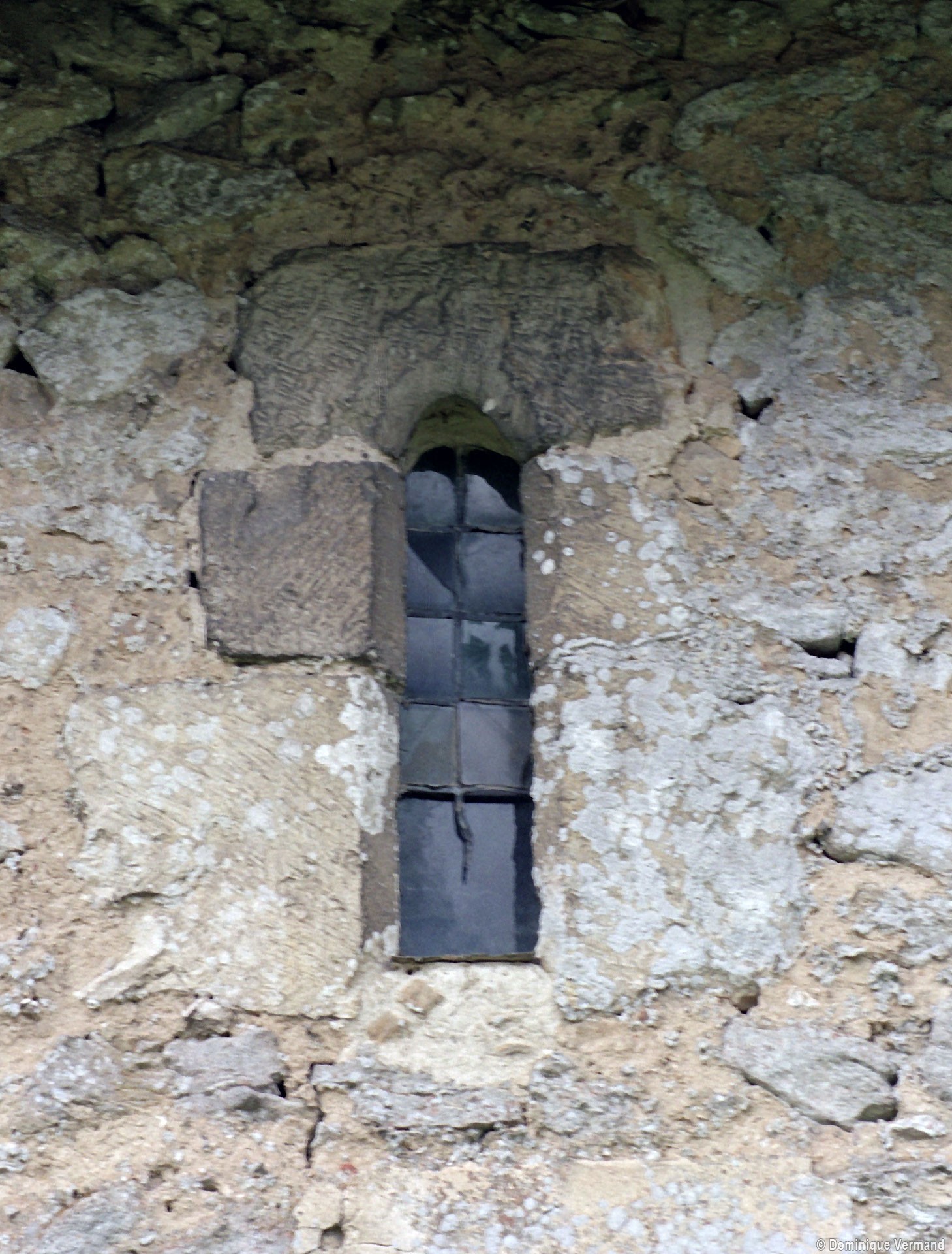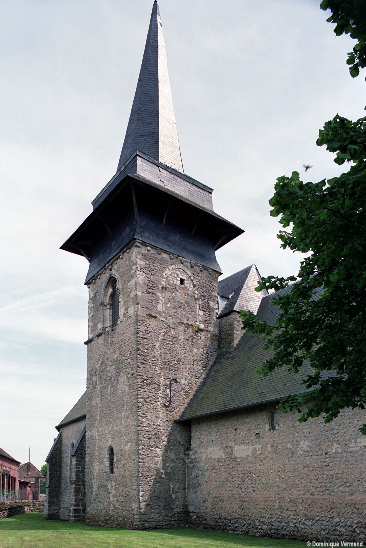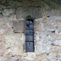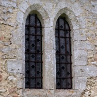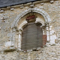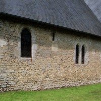 Le plan de l’édifice était complété par un choeur plus étroit -aujourd’hui disparu – sur le flanc nord duquel fut construit, au 13ème siècle, le clocher qui existe toujours. Au-dessus d’un haut soubassement nu, l’unique étage du beffroi était ajouré sur chaque face d’une baie géminée dont une seule, bien que dégradée, s’est conservée au nord. Une fenêtre à double lancette, percée dans le mur sud de la nef, doit également remonter à cette époque.