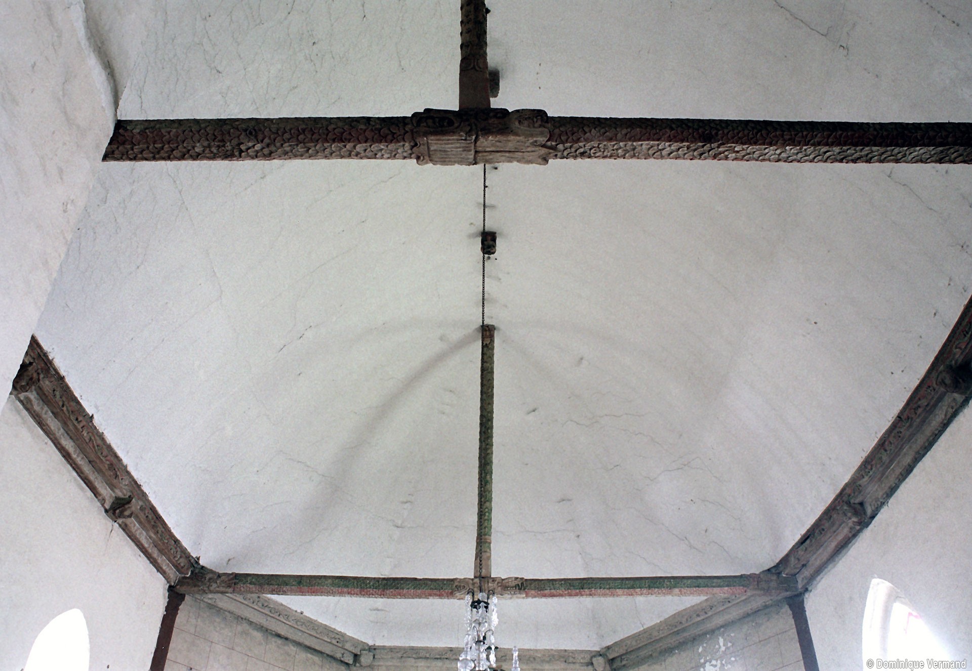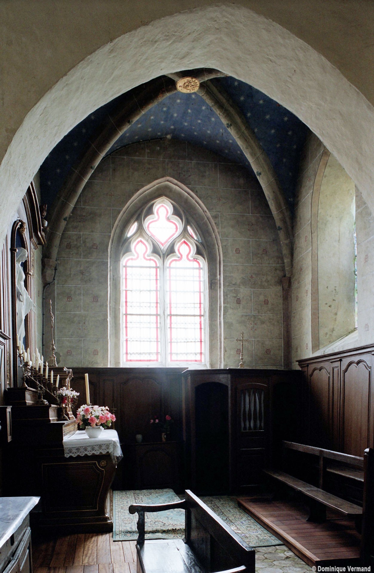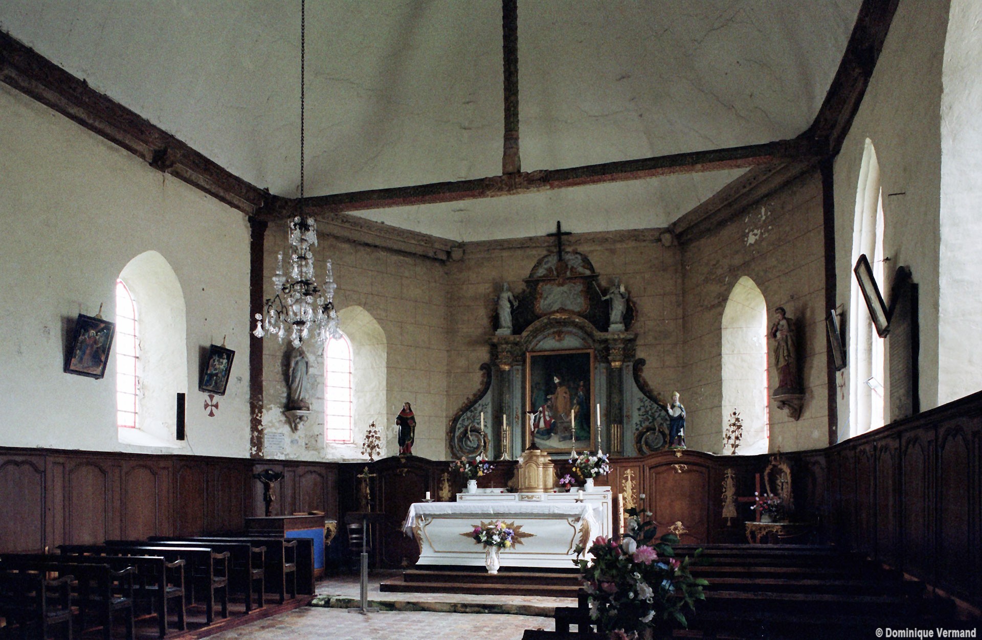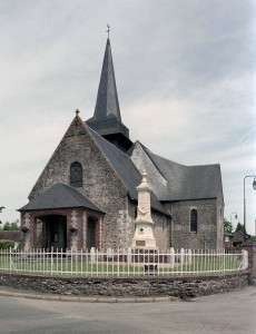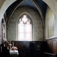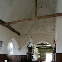 A une date difficile à préciser mais qui peut probablement se situer au 15ème siècle, seront construits le choeur et la chapelle sud. Les fenêtres en forme de simple lancette, le type des contreforts et la voûte de la chapelle – unique voûte en pierre de l’église – ne s’opposent pas, en effet, à une telle datation. Enfin, c’est au 16ème siècle qu’il reviendra, outre le percement de plusieurs grandes fenêtres à la chapelle et au choeur, de doter celui-ci d’une nouvelle charpente. Du type à carène renversée et portée très haut, elle est remarquable par la finesse de ses deux entraits avec poinçons et par la richesse de leur décor : des engoulants en forme de monstres avalent les poutres entièrement sculptées d’écailles. Cette richesse du décor se retrouve sur les sablières et les blochets en forme de masques.