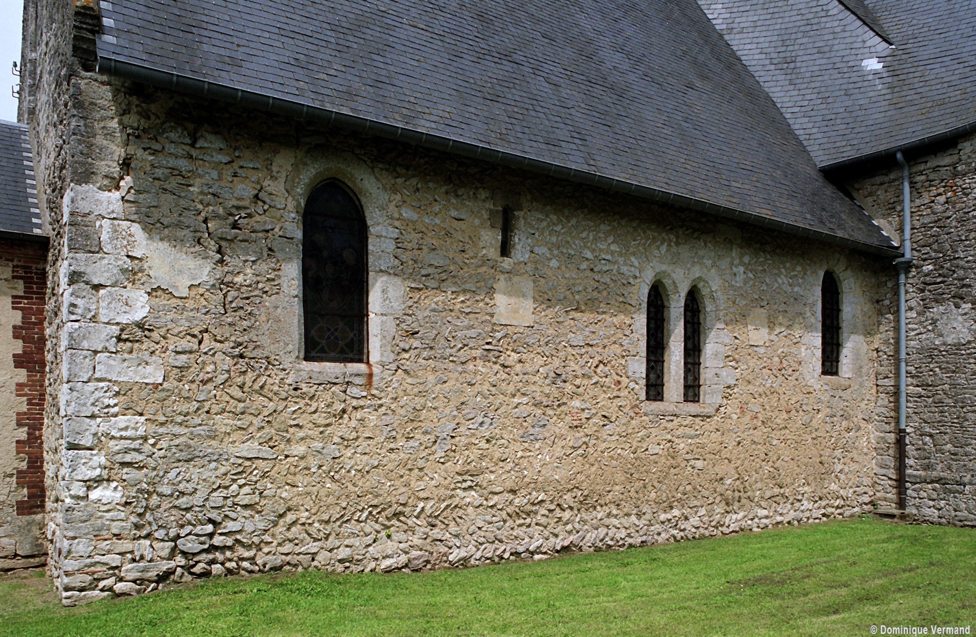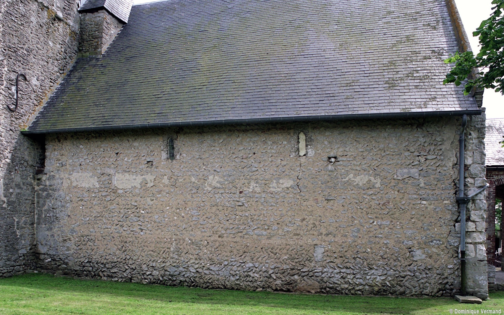 Saint-Quentin est un édifice fort complexe dont seule une analyse minutieuse permet de dégager les différentes étapes de construction. Bâtie au 11ème siècle, la nef est la partie la plus ancienne et constitue l’un des exemples les plus suggestifs qui se puissent trouver d’un appareillage en arêtes de poisson, une technique qui disparaît dès le début du 12ème siècle. Suivant un usage assez courant à l’époque, il n’y a pas de contreforts et les fenêtres sont des minuscules ouvertures dont l’archivolte est constituée par une pierre simplement échancrée. Vierge de tout remaniement, le mur nord est une bonne illustration d’un mode de bâtir alors fort répandu pour les modestes églises de campagne.