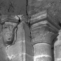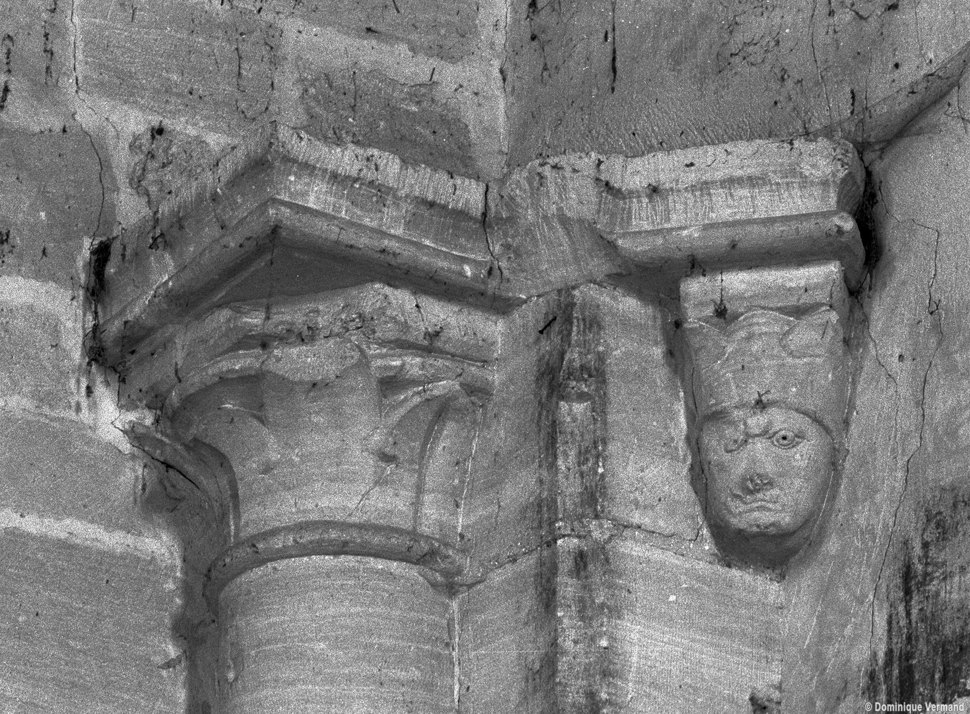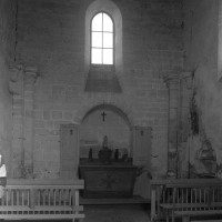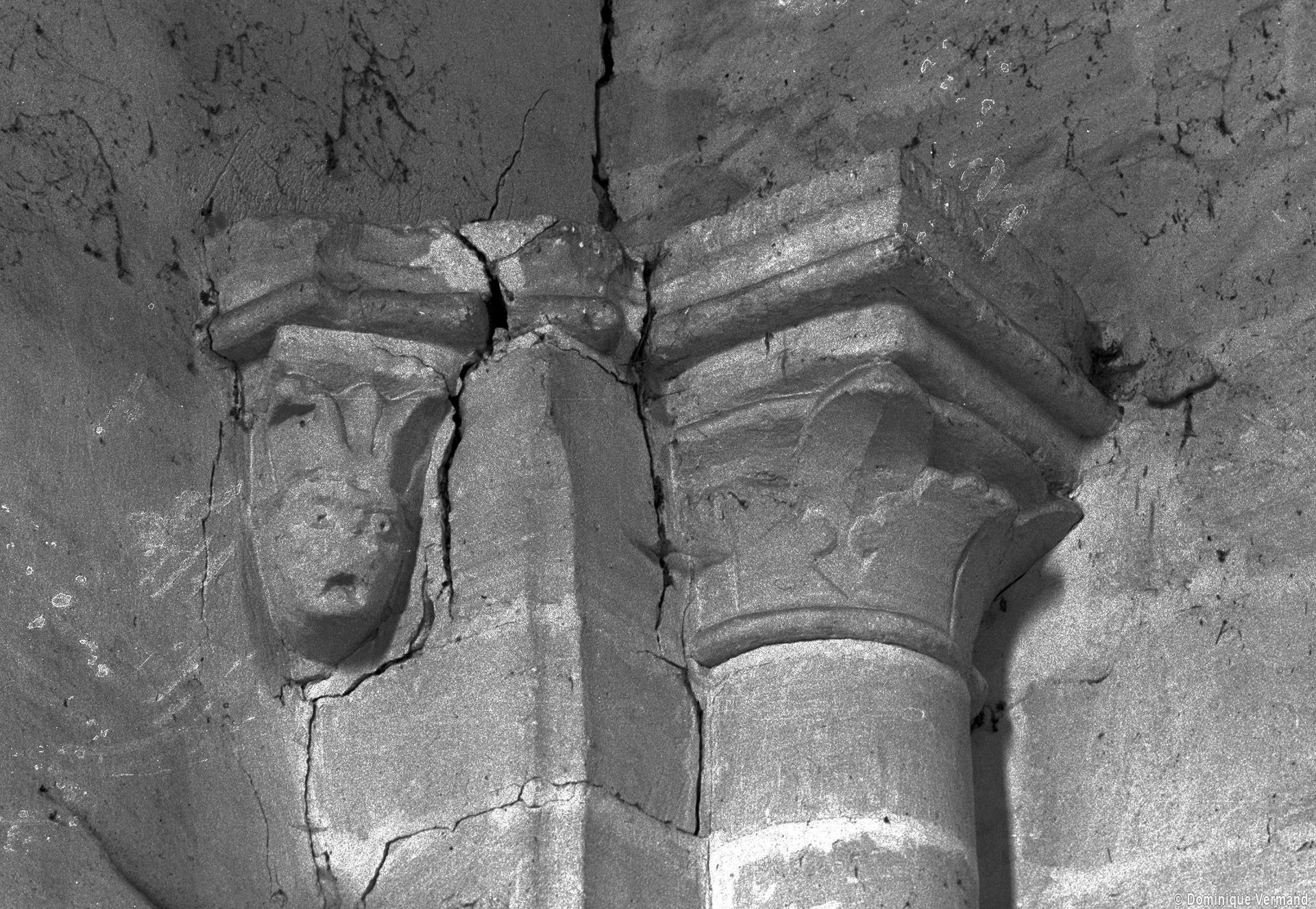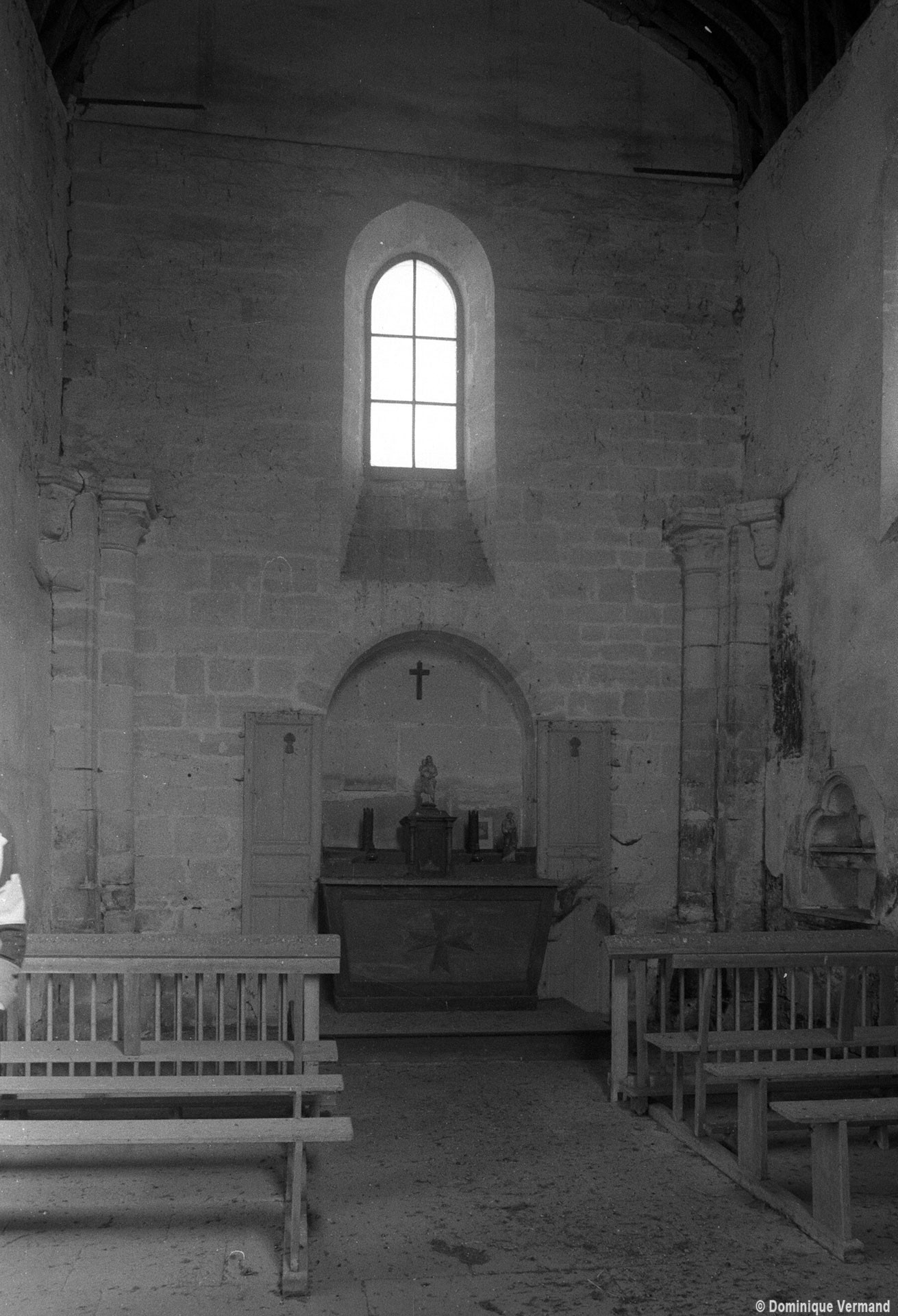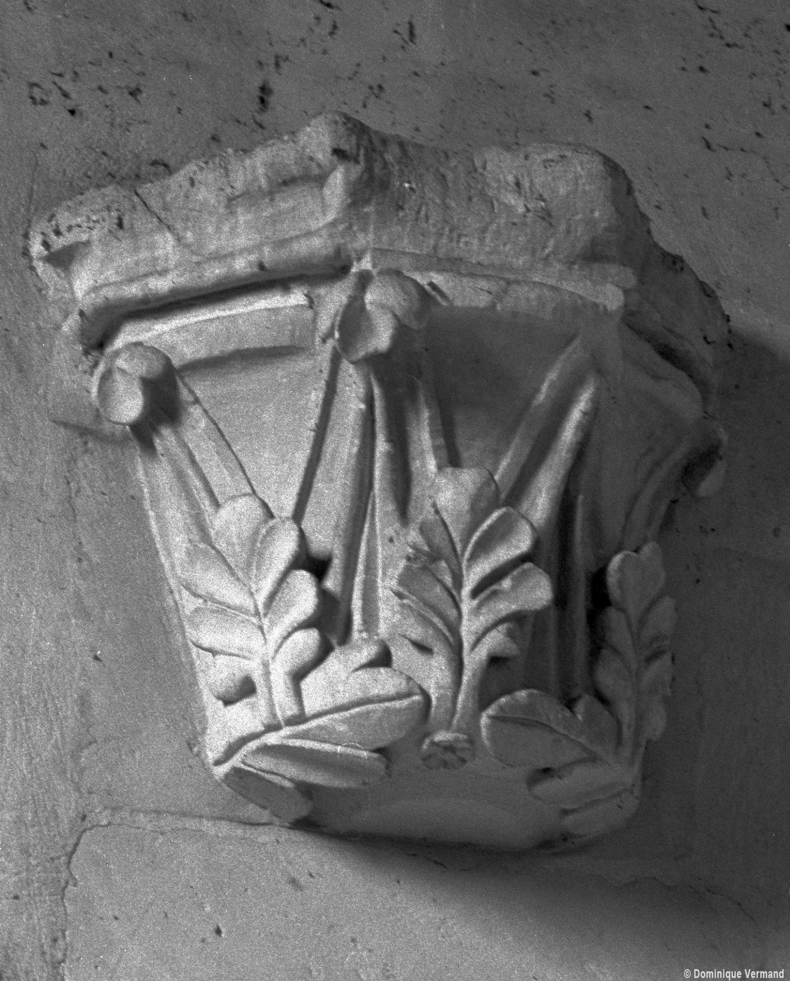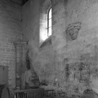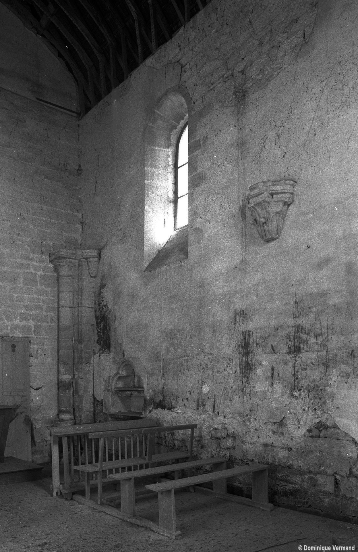 A l’intérieur, les deux travées subsistantes, correspondant à l’ancienne nef, étaient voûtées d’ogives retombant sur des culs-de-lampe. A l’est, les deux demi-colonnes sur dosseret devaient recevoir le doubleau de l’arc triomphal introduisant au choeur aujourd’hui disparu. On pourra comparer cette petite construction à la chapelle mieux conservée – mais il est vrai très restaurée – du Tillet (1997, modifié 2017).