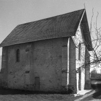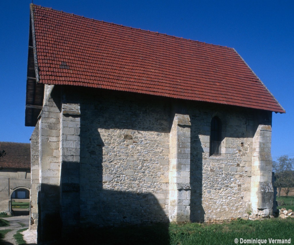 Des arrachements de maçonneries dans le prolongement du mur gouttereau méridional prouvent qu’aux deux travées actuelles – correspondant à l’ancienne nef et matérialisées à l’extérieur par l’implantation des contreforts – , venaient s’en ajouter au moins une troisième – le choeur – et que le mur actuel du chevet est moderne. L’accès se fait par une petite porte s’ouvrant au nord de la première travée, dont le linteau monolithique, reposant sur deux consoles, est sculpté d’un trilobe.