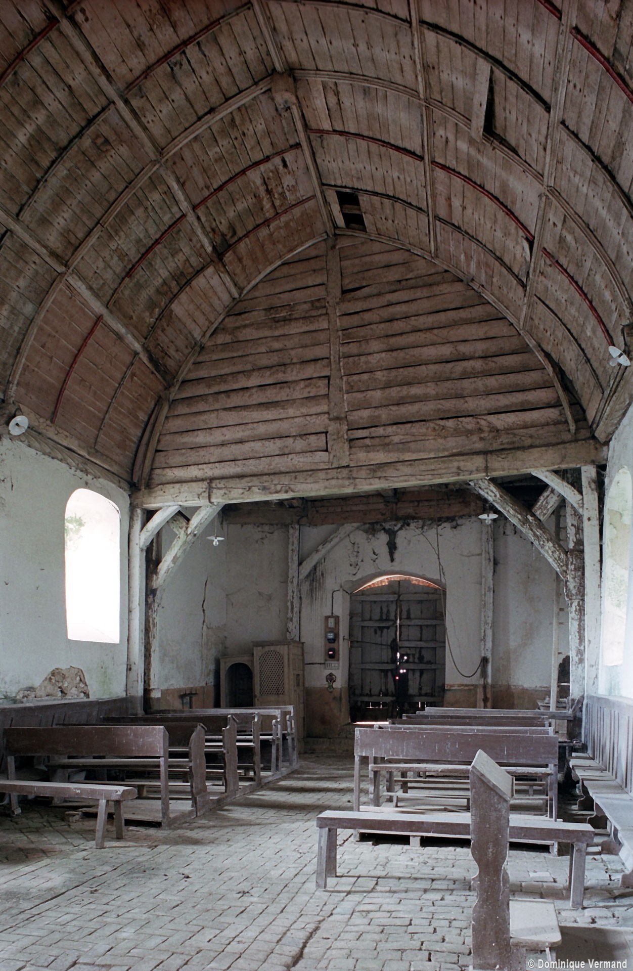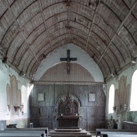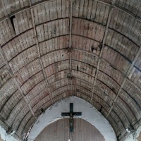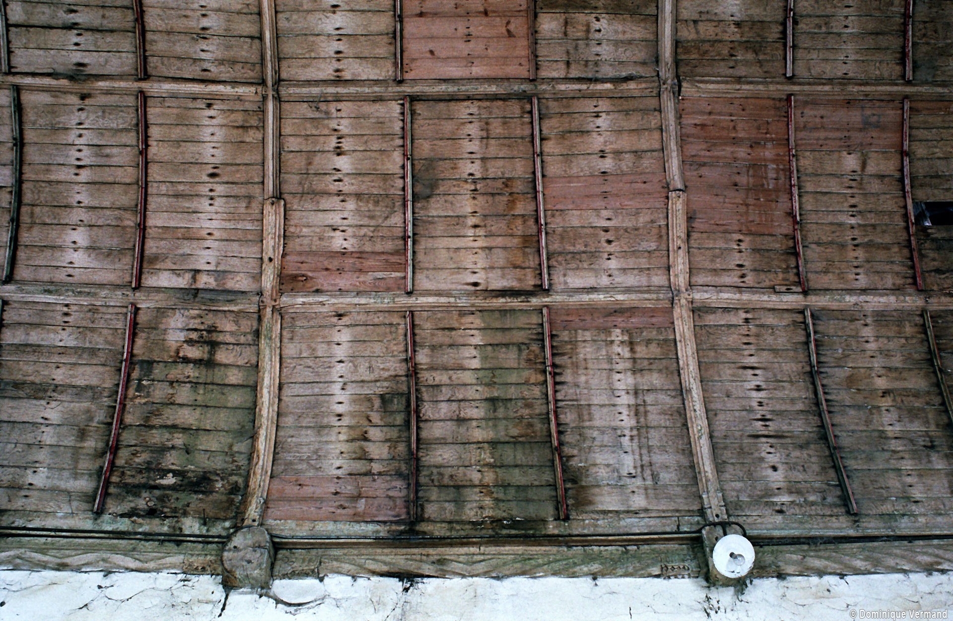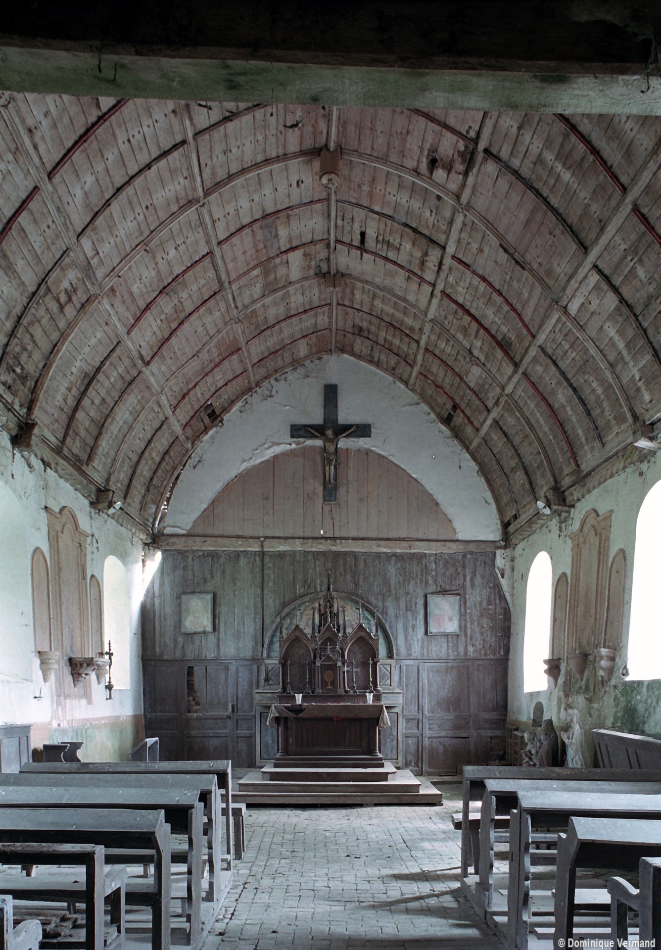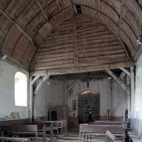 La modestie de l’architecture est compensée par la belle charpente en carène du 16ème siècle, vierge de toutes restaurations. Ses dimensions réduites n’ont pas nécessité le montage d’entraits avec poinçons. Des clefs sculptées ornent la ligne de faîte et l’ensemble est reçu sur des sablières ornées d’une torsade. Les blochets, qui étaient décorés vraisemblablement de masques ou de têtes humaines, ont été malheureusement sectionnés (2007).