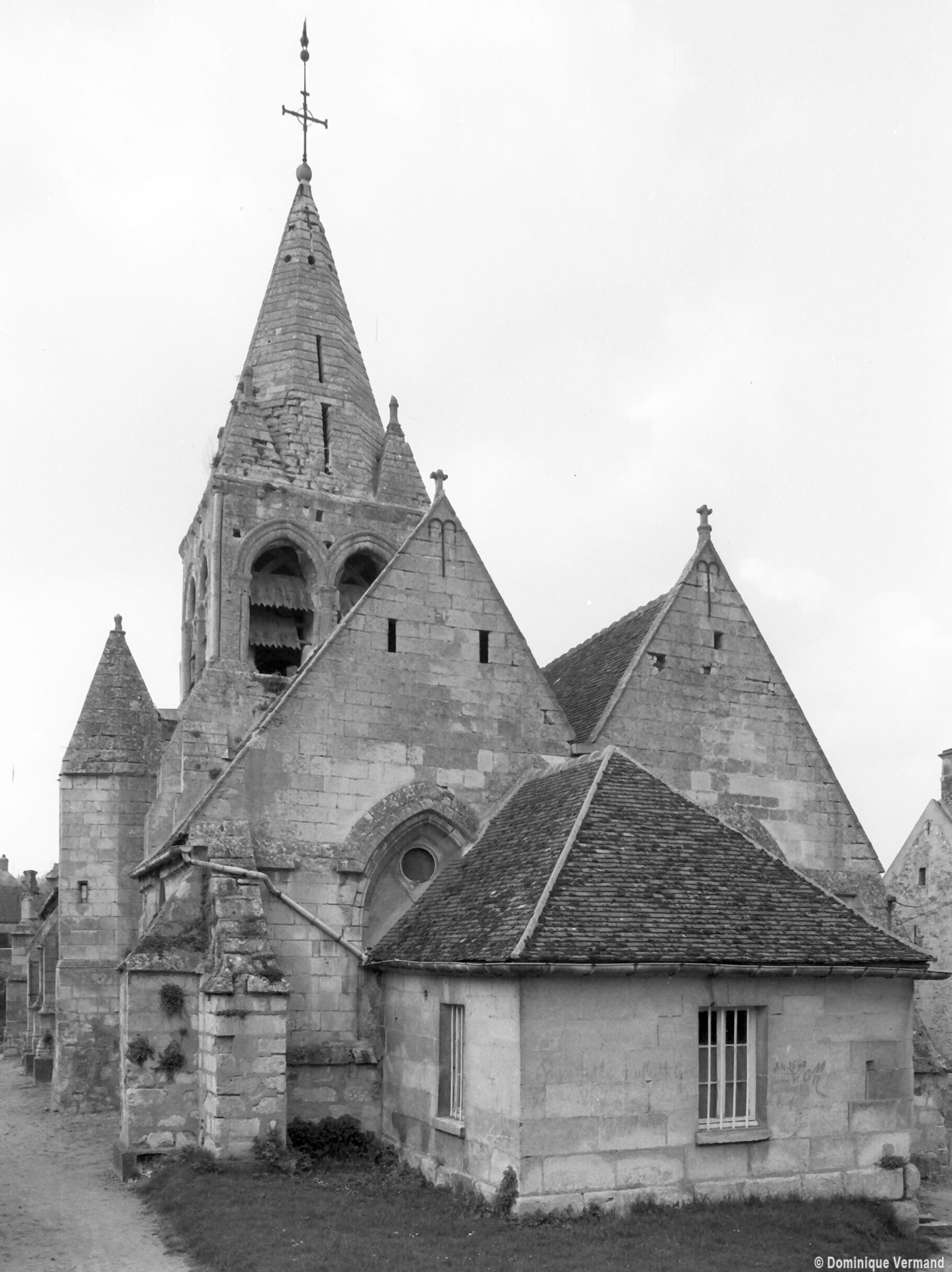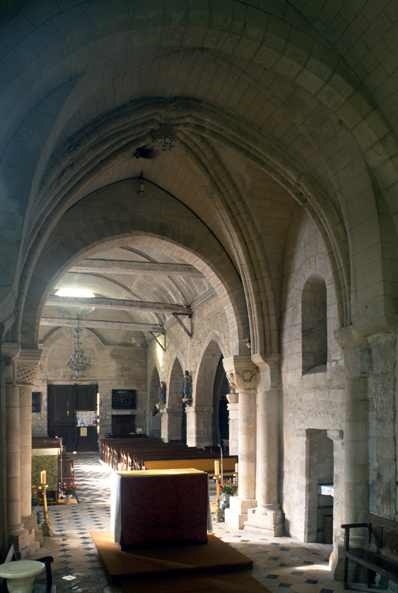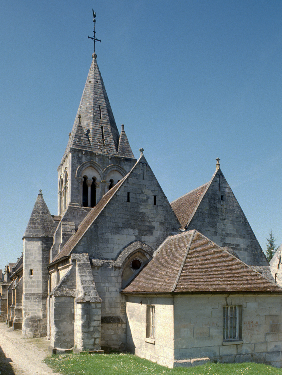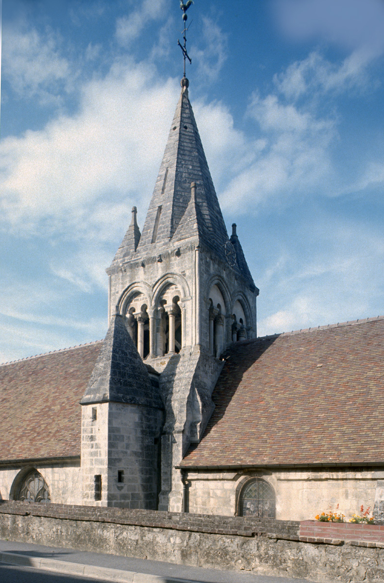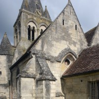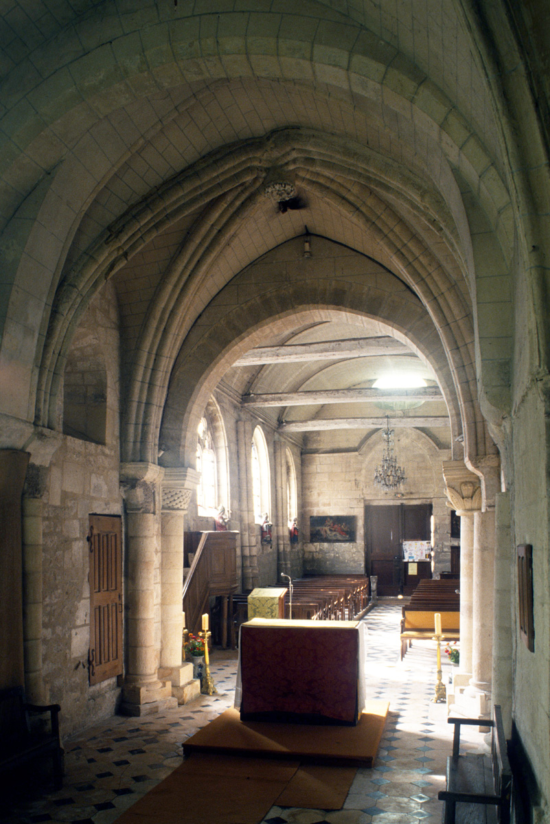 L’église du début du 12ème siècle comprenait, comme à Saint-Vaast-de-Longmont, une nef unique, une travée de choeur portant le clocher et une abside en hémicycle aujourd’hui disparue. A peine achevée, la travée du clocher était voûtée d’ogives comme le prouvent les colonnes relancées dans les maçonneries portant la tour. Les voûtains ont été refaits – ils étaient autrefois très inclinés – mais les ogives sont bonnes et la maladresse avec laquelle elles ont été appareillées comme leur largeur considérable incitent à dater cette voûte des années 1120, ce que confirment les deux chapiteaux conservés, dont un se retrouve d’ailleurs très semblable dans le choeur contemporain de Morienval.