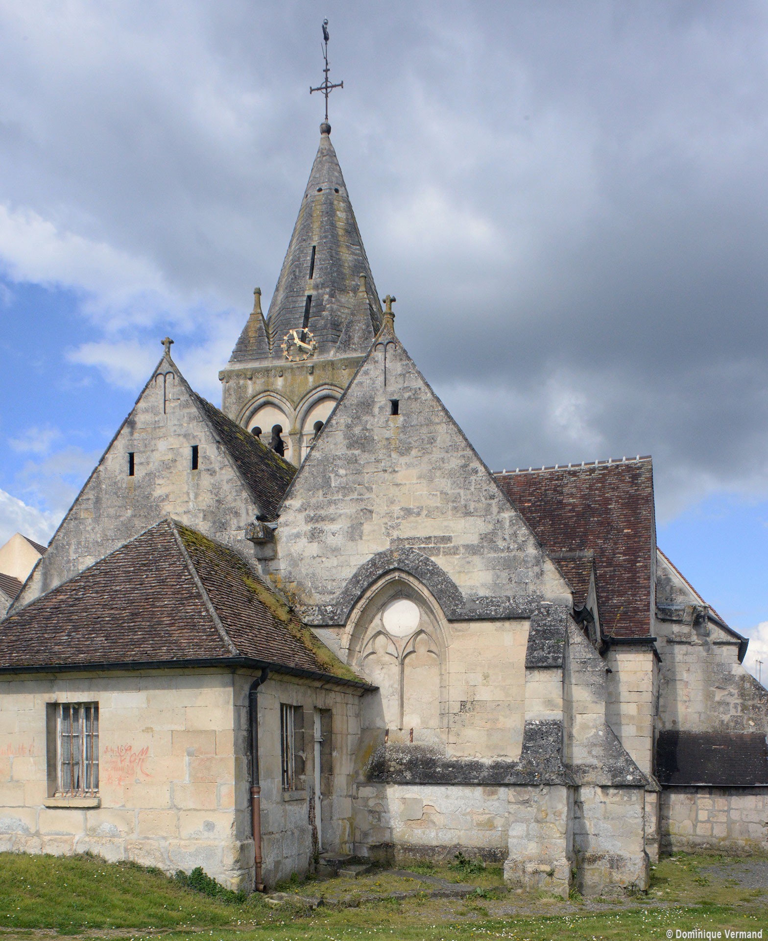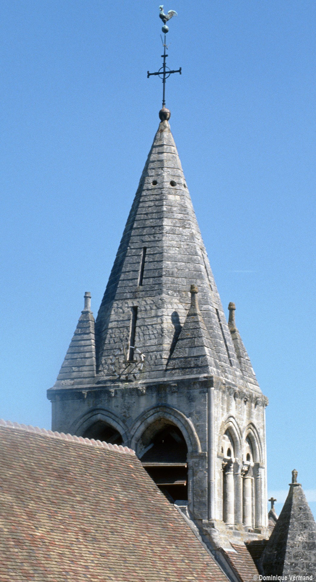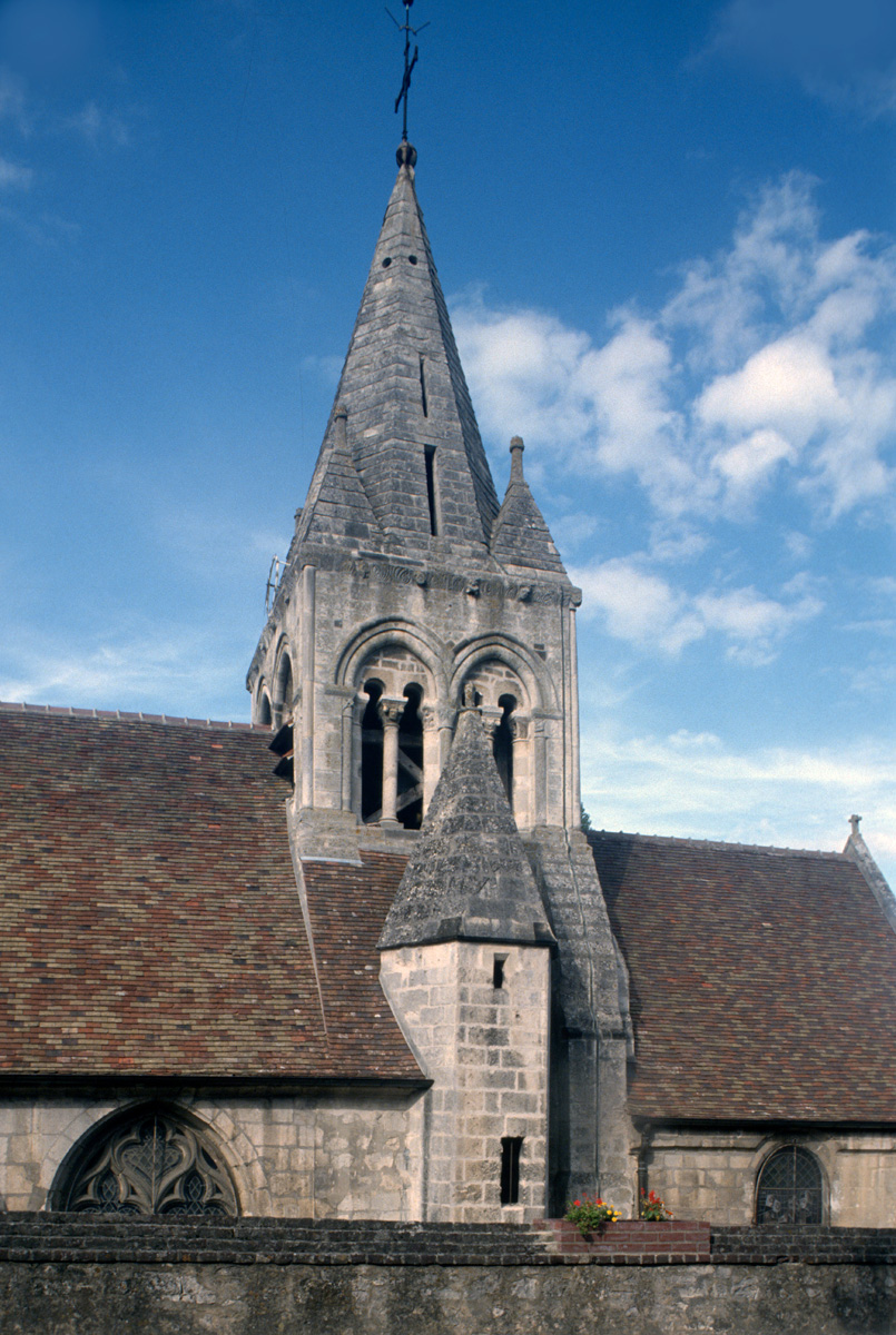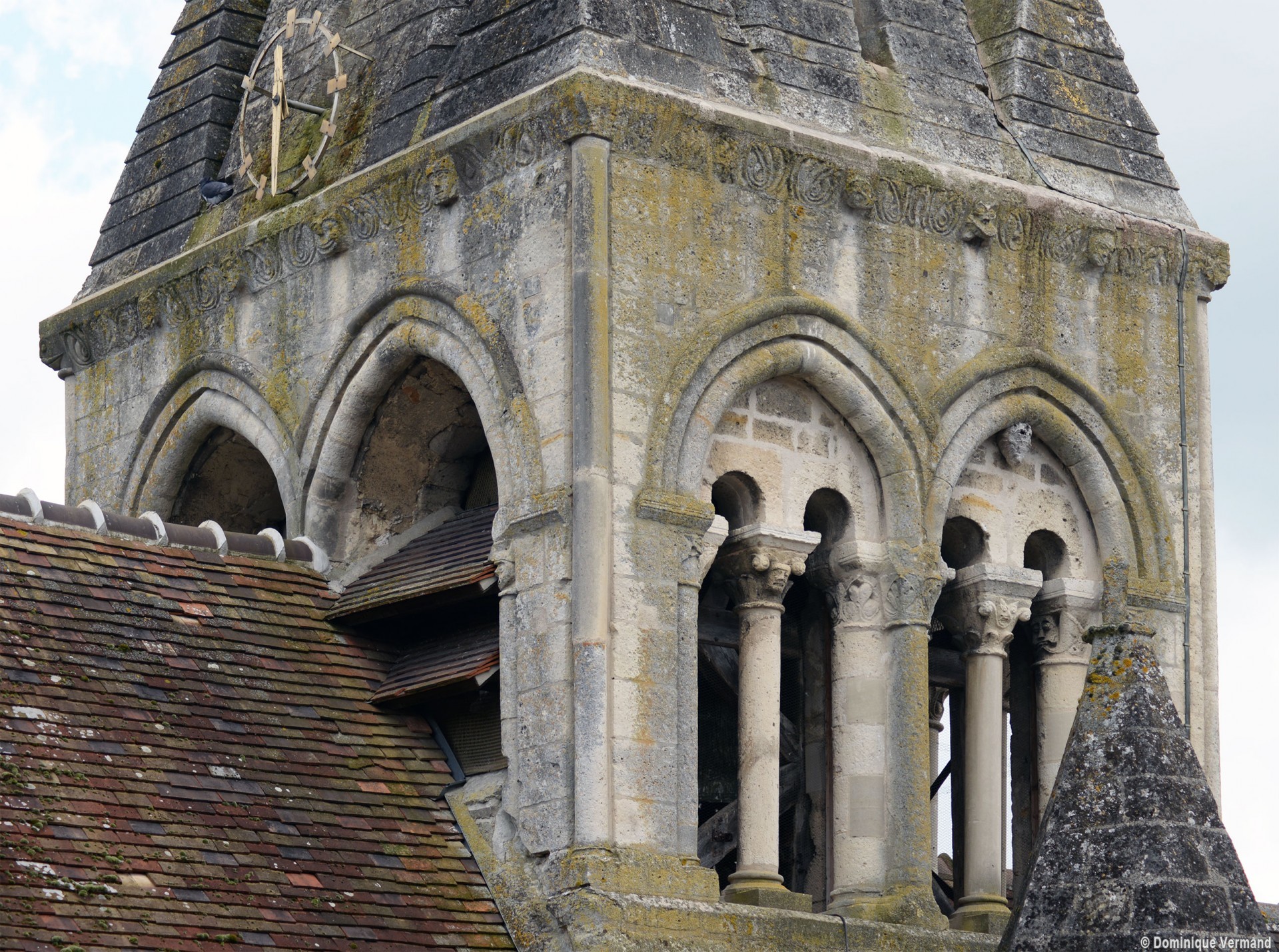 L’église du début du 12ème siècle comprenait, comme à Saint-Vaast-de-Longmont, une nef unique, une travée de choeur portant le clocher et une abside en hémicycle aujourd’hui disparue. A peine achevée, la travée du clocher était voûtée d’ogives comme le prouvent les colonnes relancées dans les maçonneries portant la tour. Les voûtains ont été refaits – ils étaient autrefois très inclinés – mais les ogives sont bonnes et la maladresse avec laquelle elles ont été appareillées comme leur largeur considérable incitent à dater cette voûte des années 1120, ce que confirment les deux chapiteaux conservés, dont un se retrouve d’ailleurs très semblable dans le choeur contemporain de Morienval.