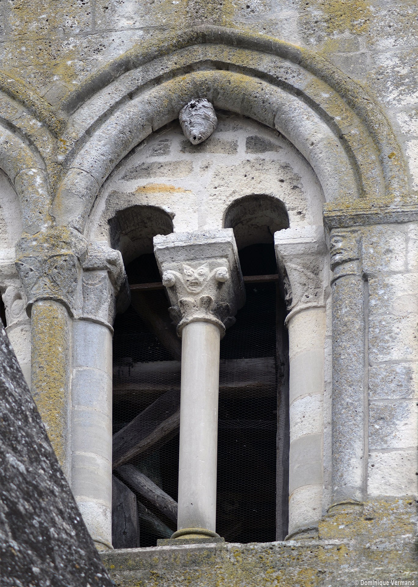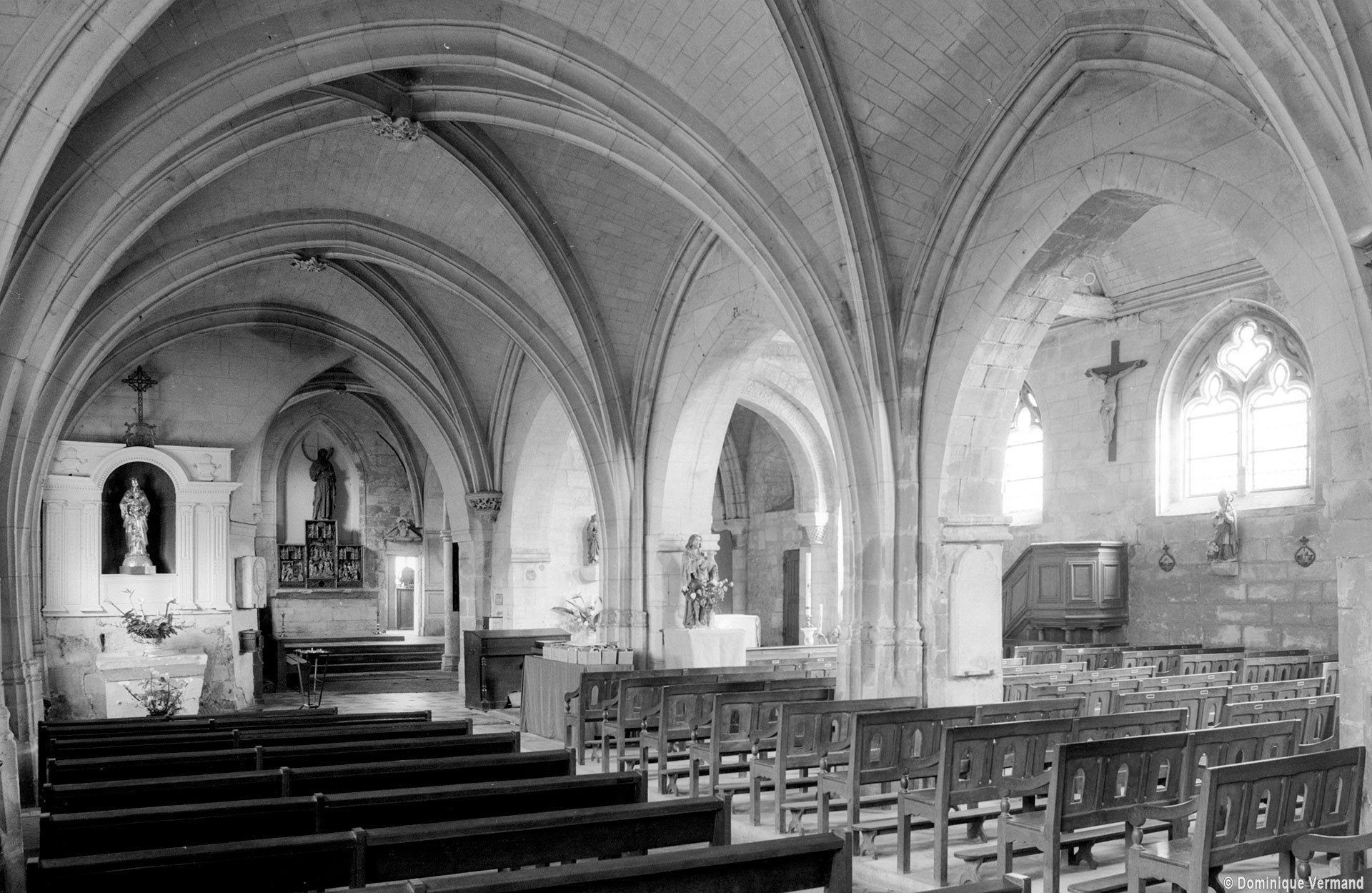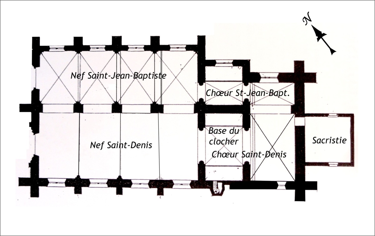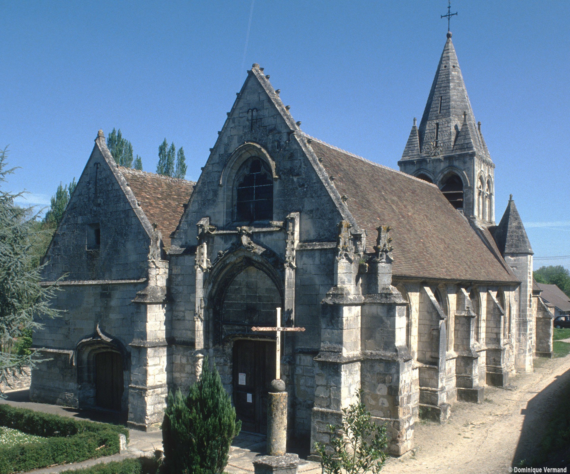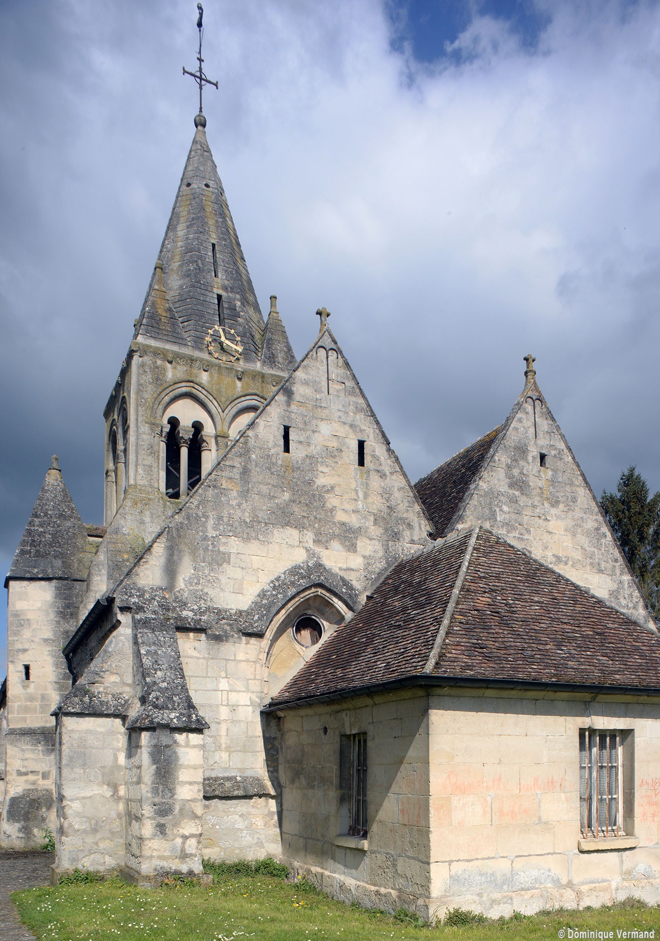 L’église du début du 12ème siècle comprenait, comme à Saint-Vaast-de-Longmont, une nef unique, une travée de choeur portant le clocher et une abside en hémicycle aujourd’hui disparue. A peine achevée, la travée du clocher était voûtée d’ogives comme le prouvent les colonnes relancées dans les maçonneries portant la tour. Les voûtains ont été refaits – ils étaient autrefois très inclinés – mais les ogives sont bonnes et la maladresse avec laquelle elles ont été appareillées comme leur largeur considérable incitent à dater cette voûte des années 1120, ce que confirment les deux chapiteaux conservés, dont un se retrouve d’ailleurs très semblable dans le choeur contemporain de Morienval.