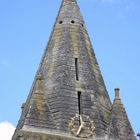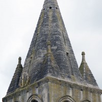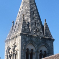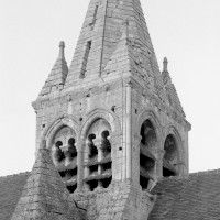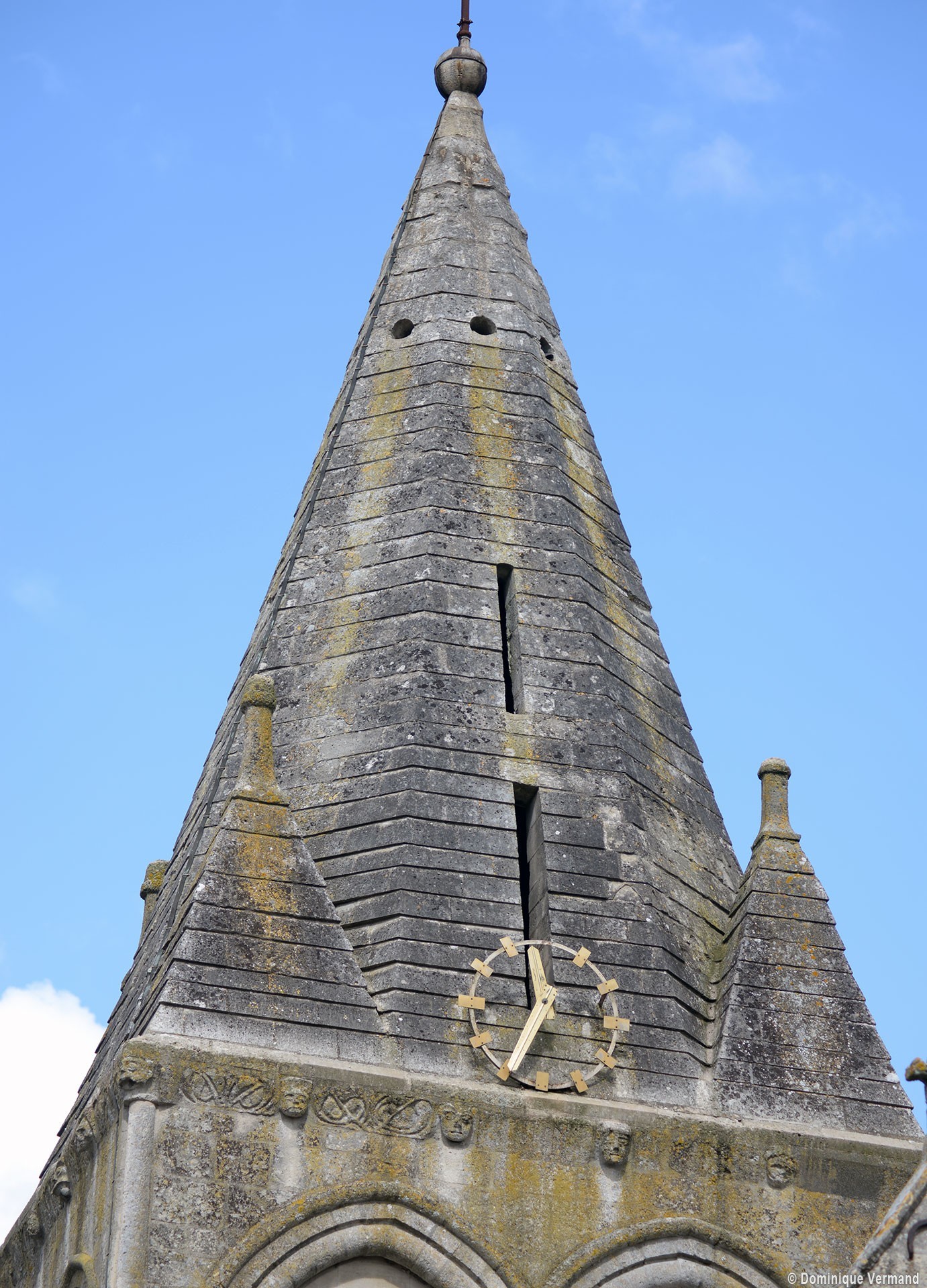 Le clocher ne comporte qu’un étage de baies géminées brisées recoupées par des colonnettes et recevant des arcs secondaires en plein cintre. Bien que trapue, la flèche en pierre cantonnée de petites pyramides est inspirée de celle de Saint-Vaast-de-Longmont.