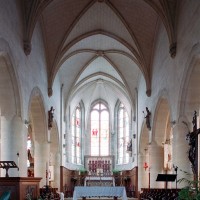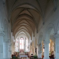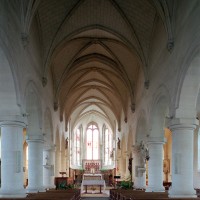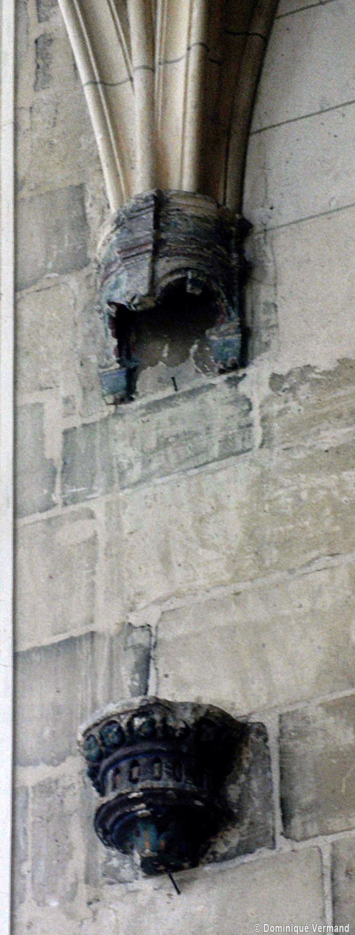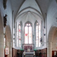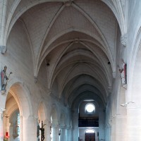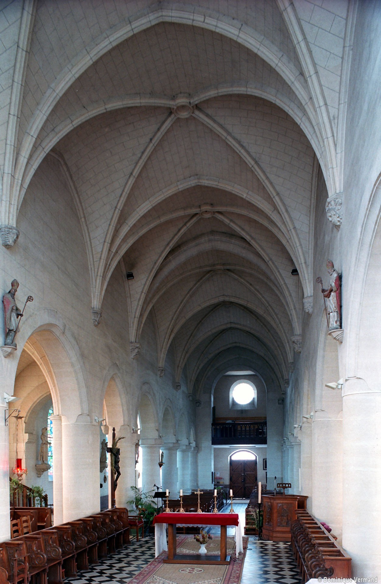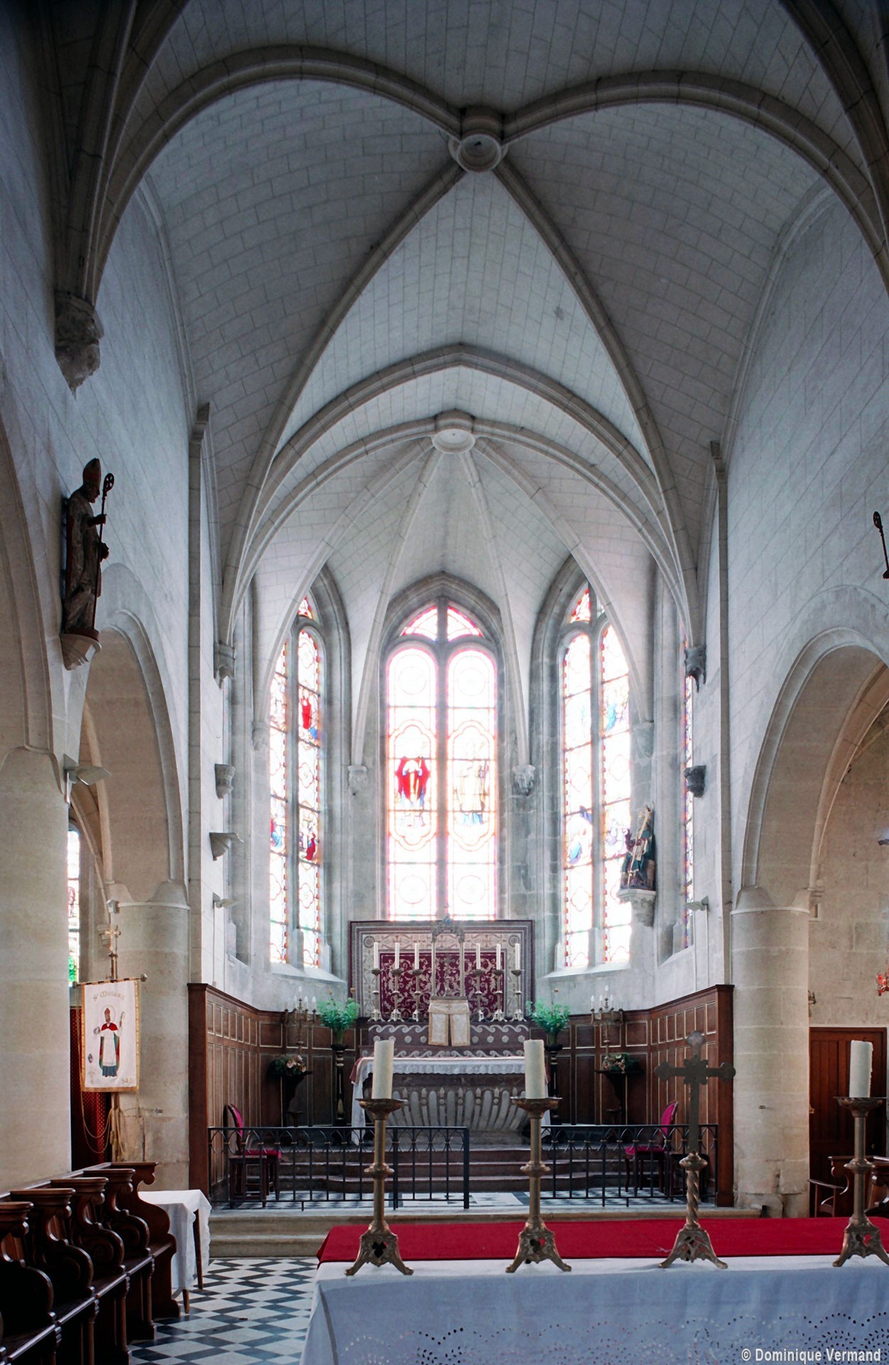 L’abside reste l’élément le mieux caractérisé. Elle est éclairée par de hautes fenêtres associant les formes brisées et en plein cintre et ses voûtes étaient reçues sur un dispositif associant un culot, une statue et un dais. L’un a été remonté au sud et, par son style, appartient à la Renaissance. Couvert de voûtes d’ogives, le vaisseau central de l’édifice a toujours été aveugle, la lumière parvenant par les fenêtres des bas-côtés selon un parti fréquent à l’époque.