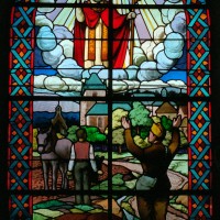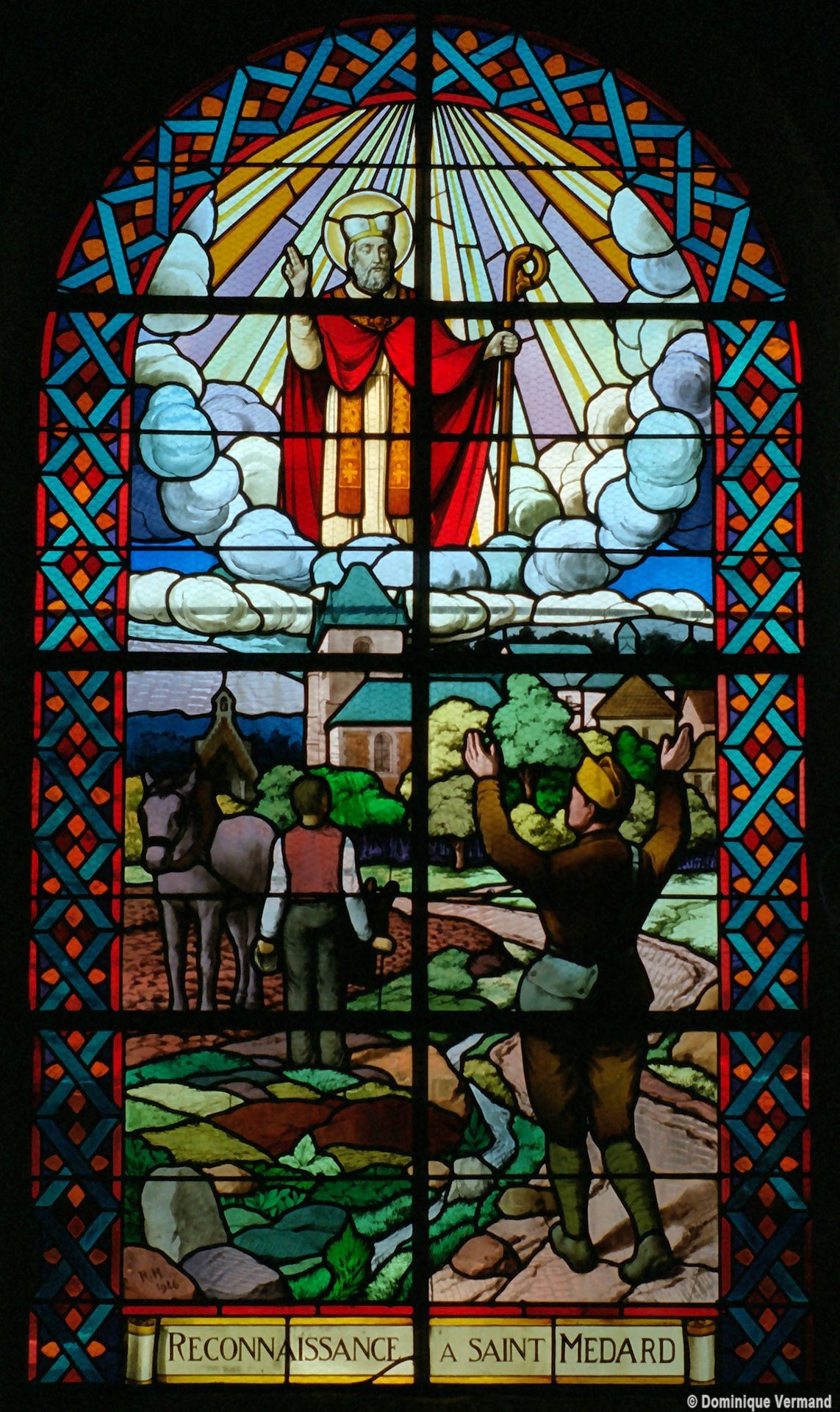 Un très suggestif vitrail a été offert à l’église en 1946 : de retour après la guerre, un soldat témoigne sa reconnaissance à saint Médard d’avoir, cette fois, épargné son village… (2008).