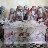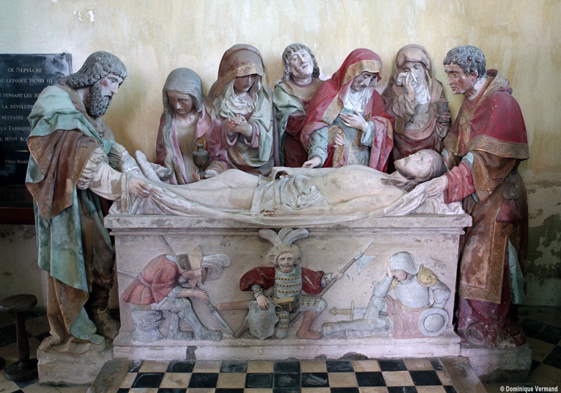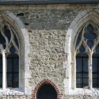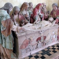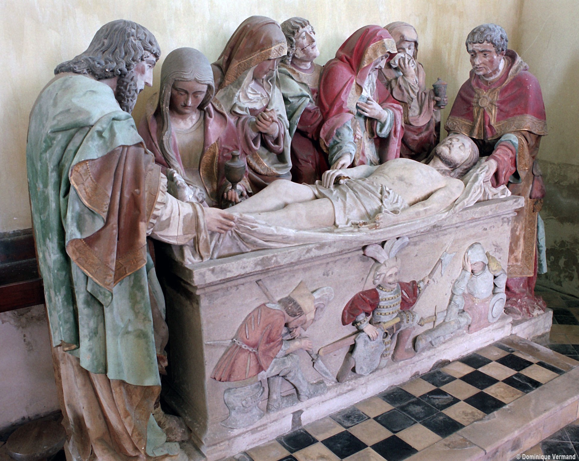 Enfin, c’est au 16ème siècle qu’une chapelle est bâtie à l’angle de la nef et du croisillon sud : les deux fenêtres au magnifique remplage flamboyant de tracé très aigu ne laissent aucun doute à ce sujet. Dans le croisillon nord se trouve une Mise au Tombeau du 16ème siècle, très lourdement restaurée en 1886. Au revers de la façade, un impressionnant Saint-Martin à cheval rappelle le vocable de l’église (2007).