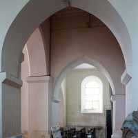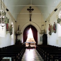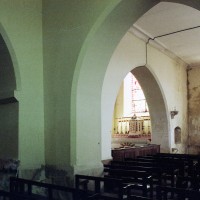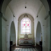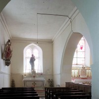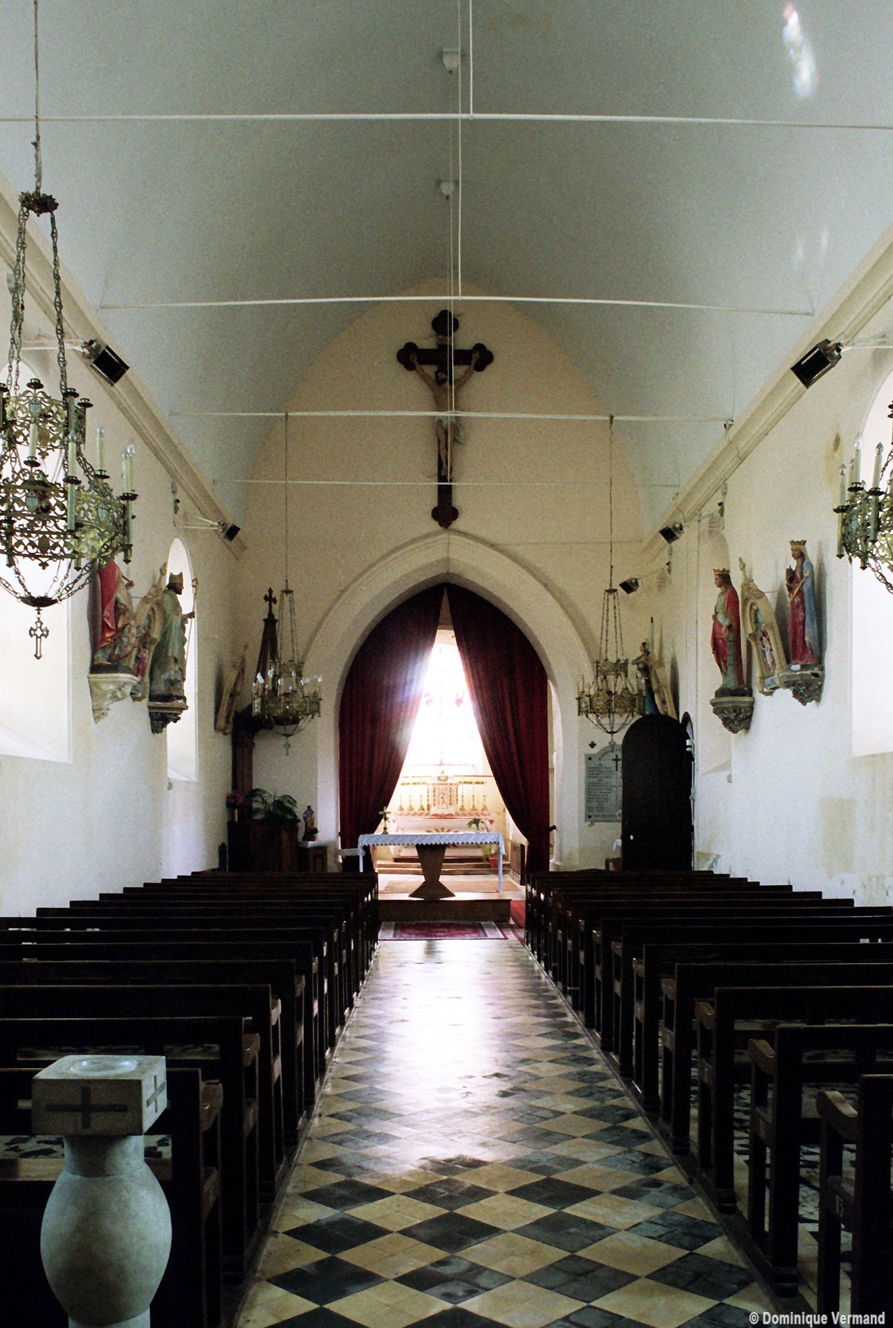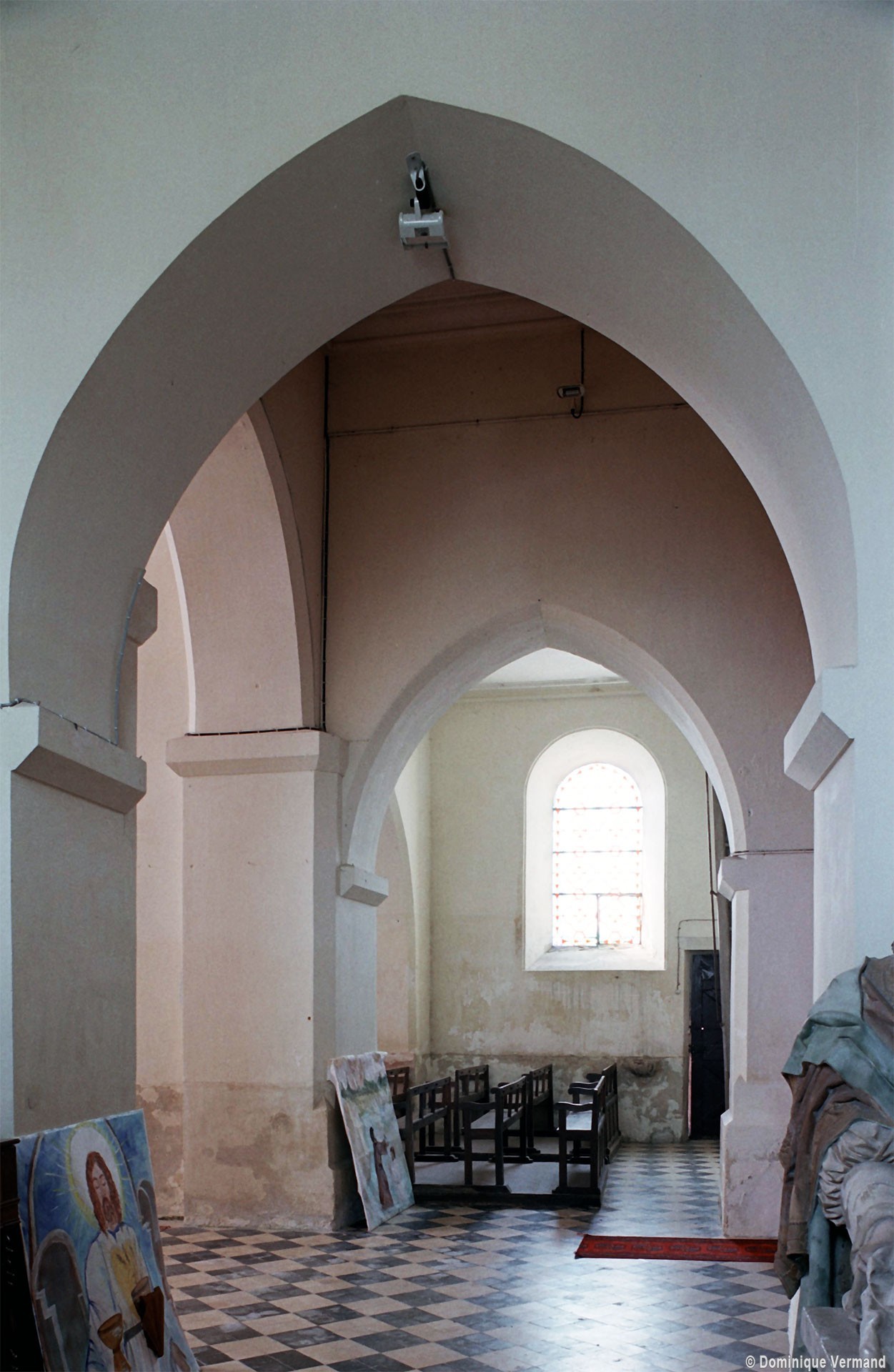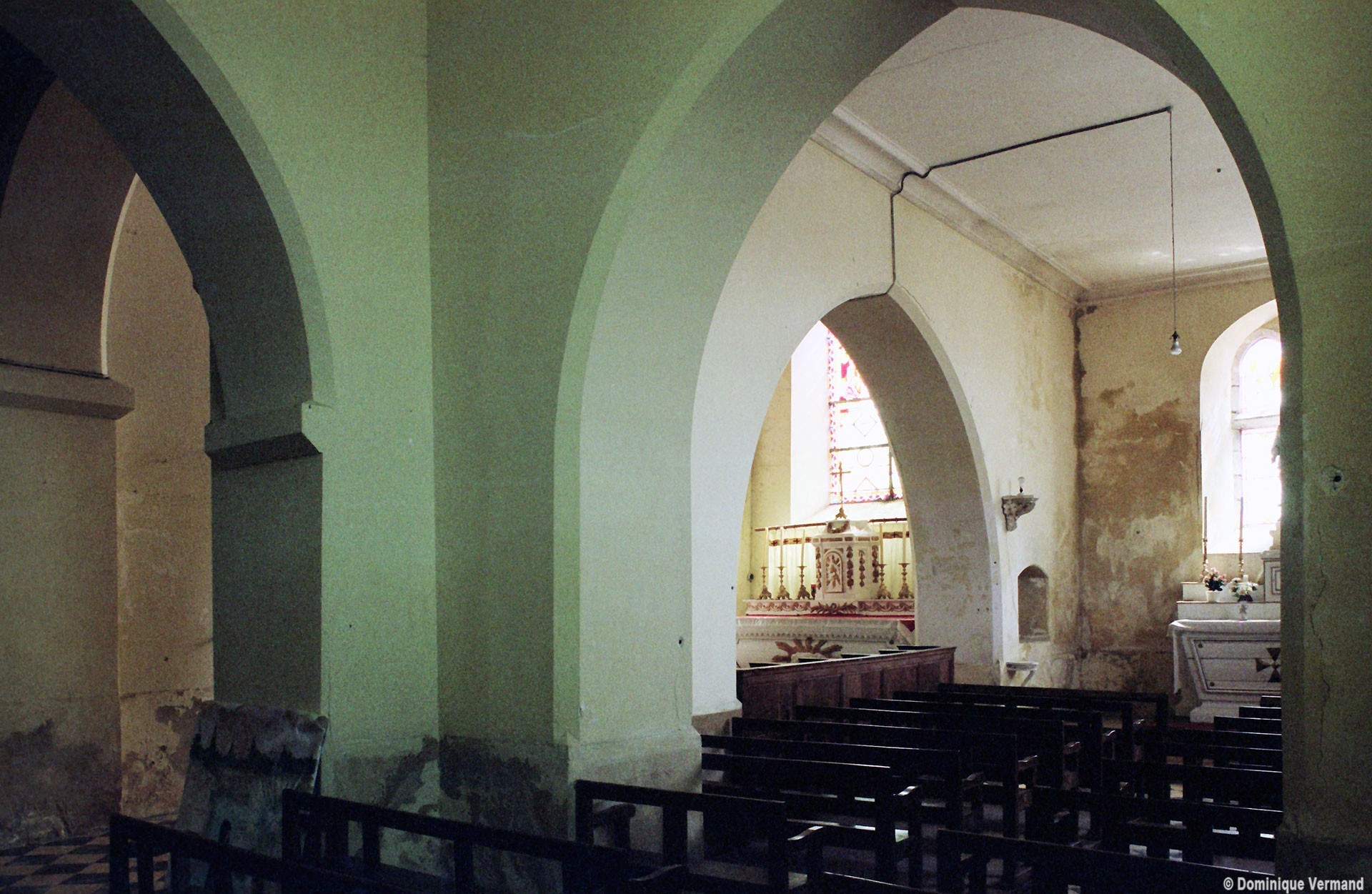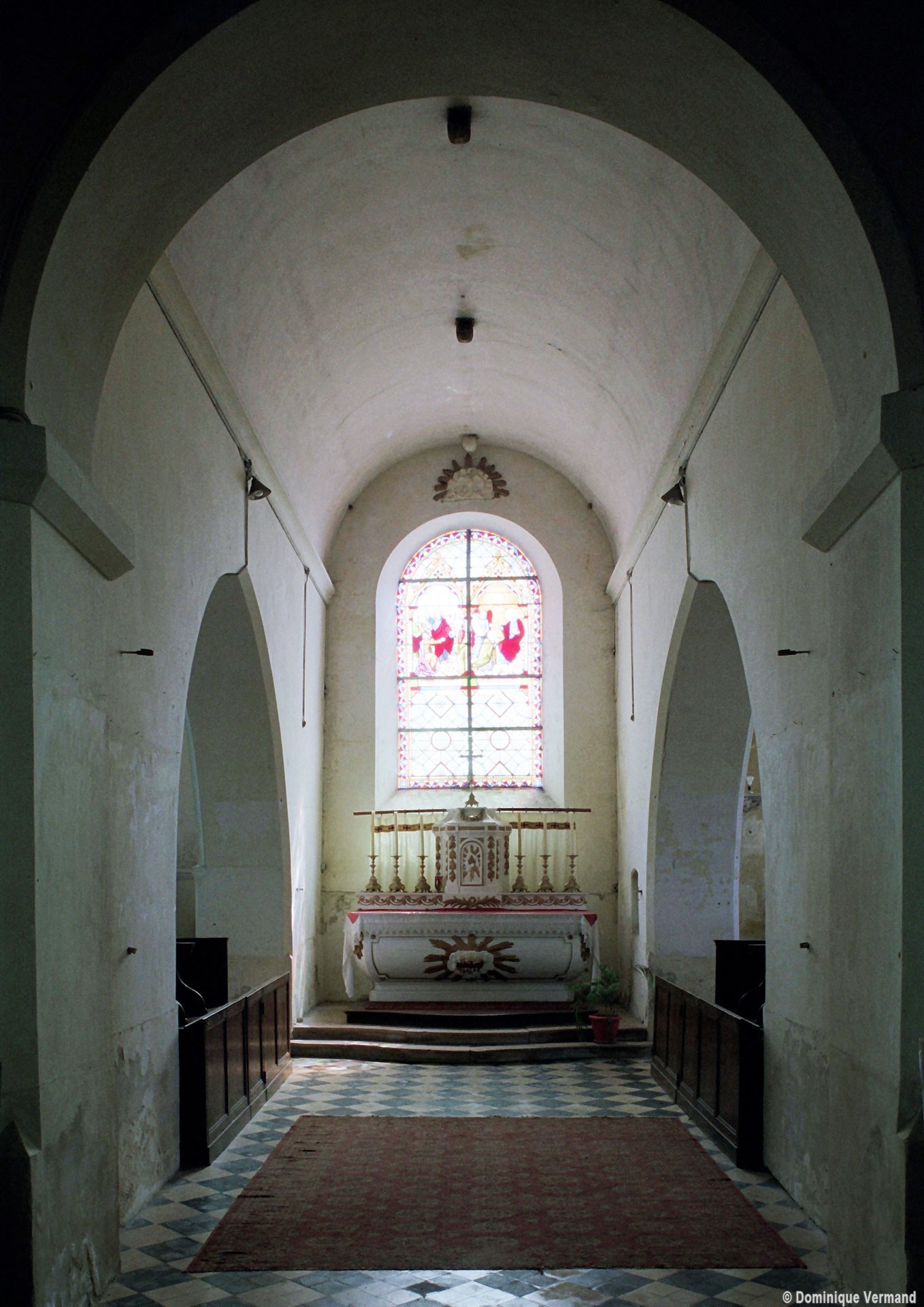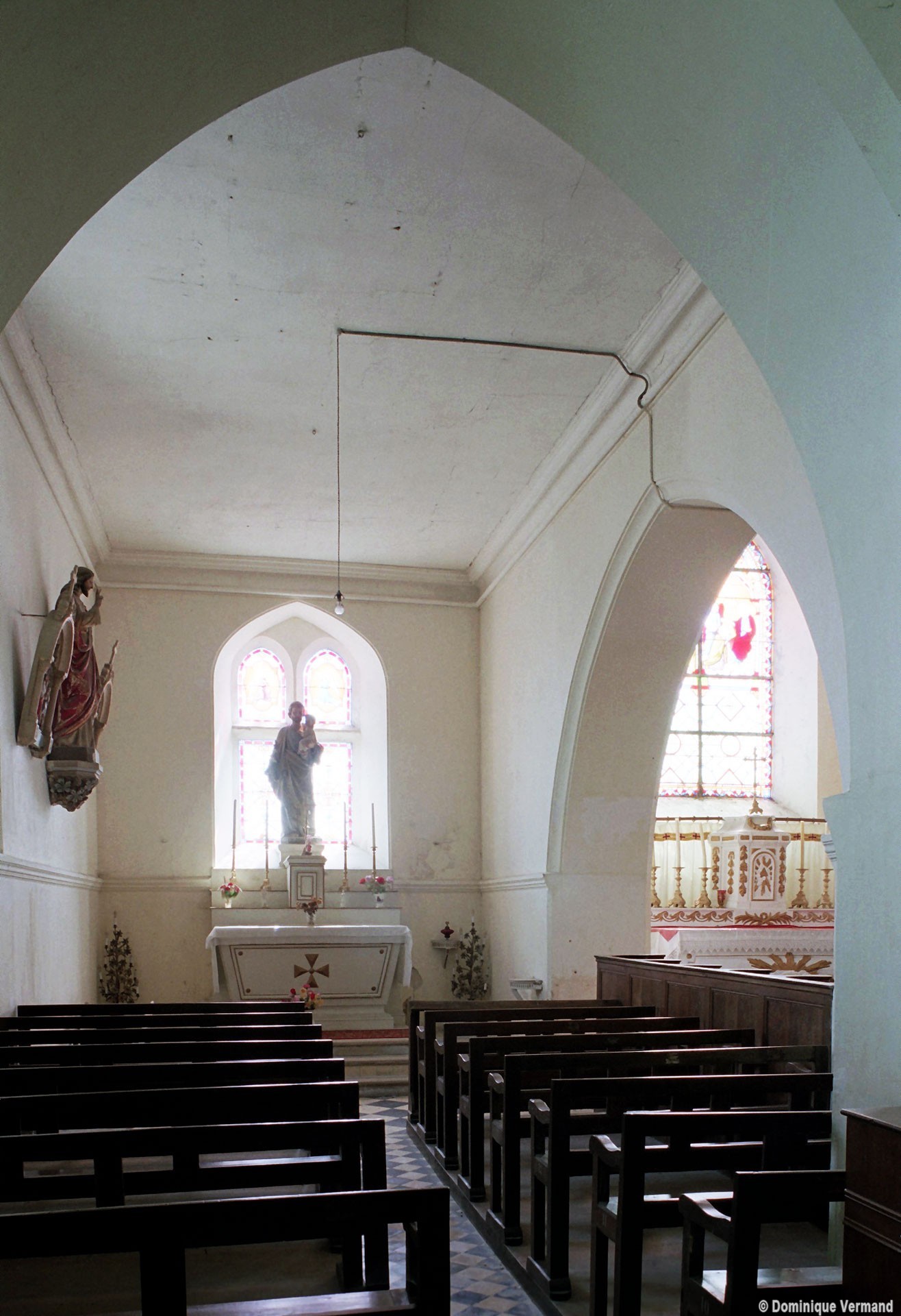 La nef unique, bien que très modifiée, est la partie la plus ancienne comme le prouve une petite fenêtre en plein cintre conservée au sud. A l’est, se développent un transept saillant et un choeur profond flanqué de deux chapelles de même longueur. Compte tenu de l’état actuel de l’édifice, il est impossible d’établir une chronologie sûre : il n’y a pas de contreforts, les fenêtres sont presque toutes du 19ème siècle et l’intérieur n’offre à considérer que des arcades brisées – une, vers le choeur, est en plein cintre – retombant sur des tailloirs, le tout recouvert d’un enduit uniforme.