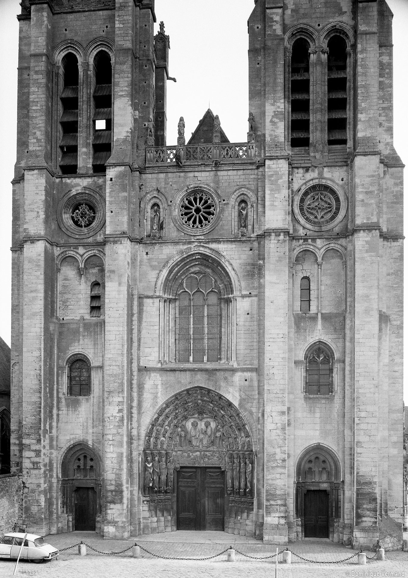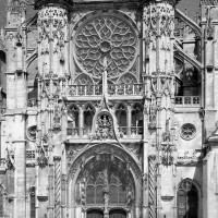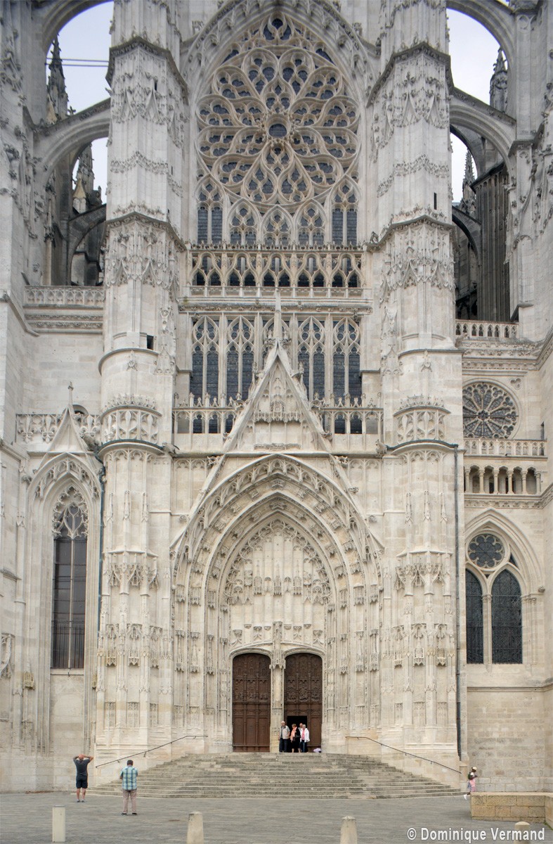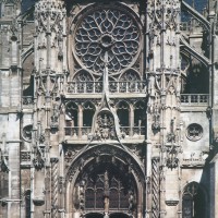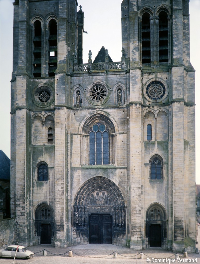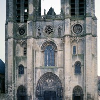Dominée par la haute flèche gothique et rythmée par quatre puissants contreforts, la façade harmonique (à deux tours symétriques) offre un visage assez austère, presque militaire, qui ne met que mieux en valeur le portail central, chef d’oeuvre de la première sculpture gothique qui doit sa célébrité à des raisons à la fois iconographiques et stylistiques.