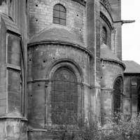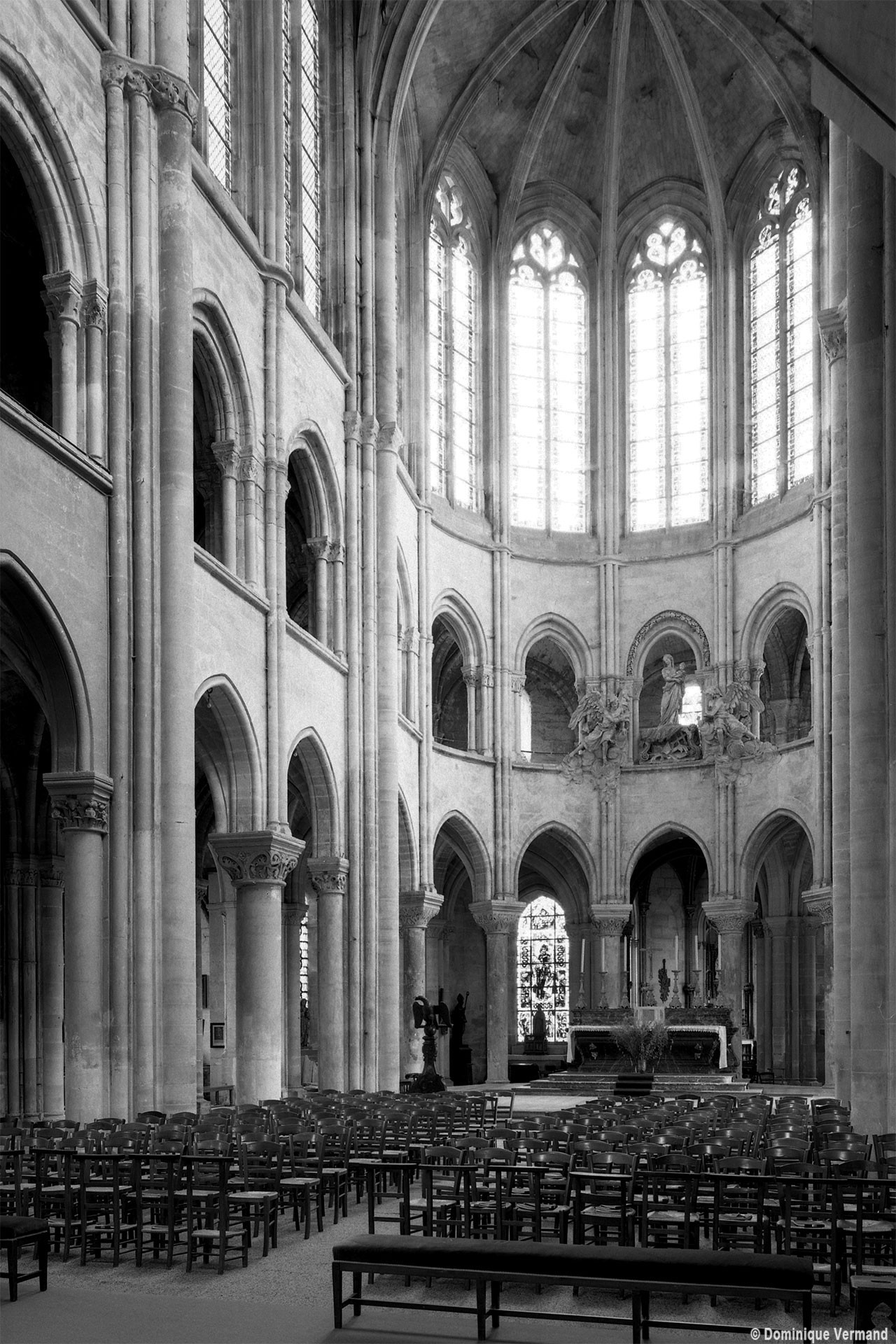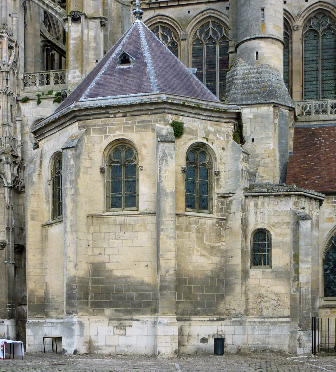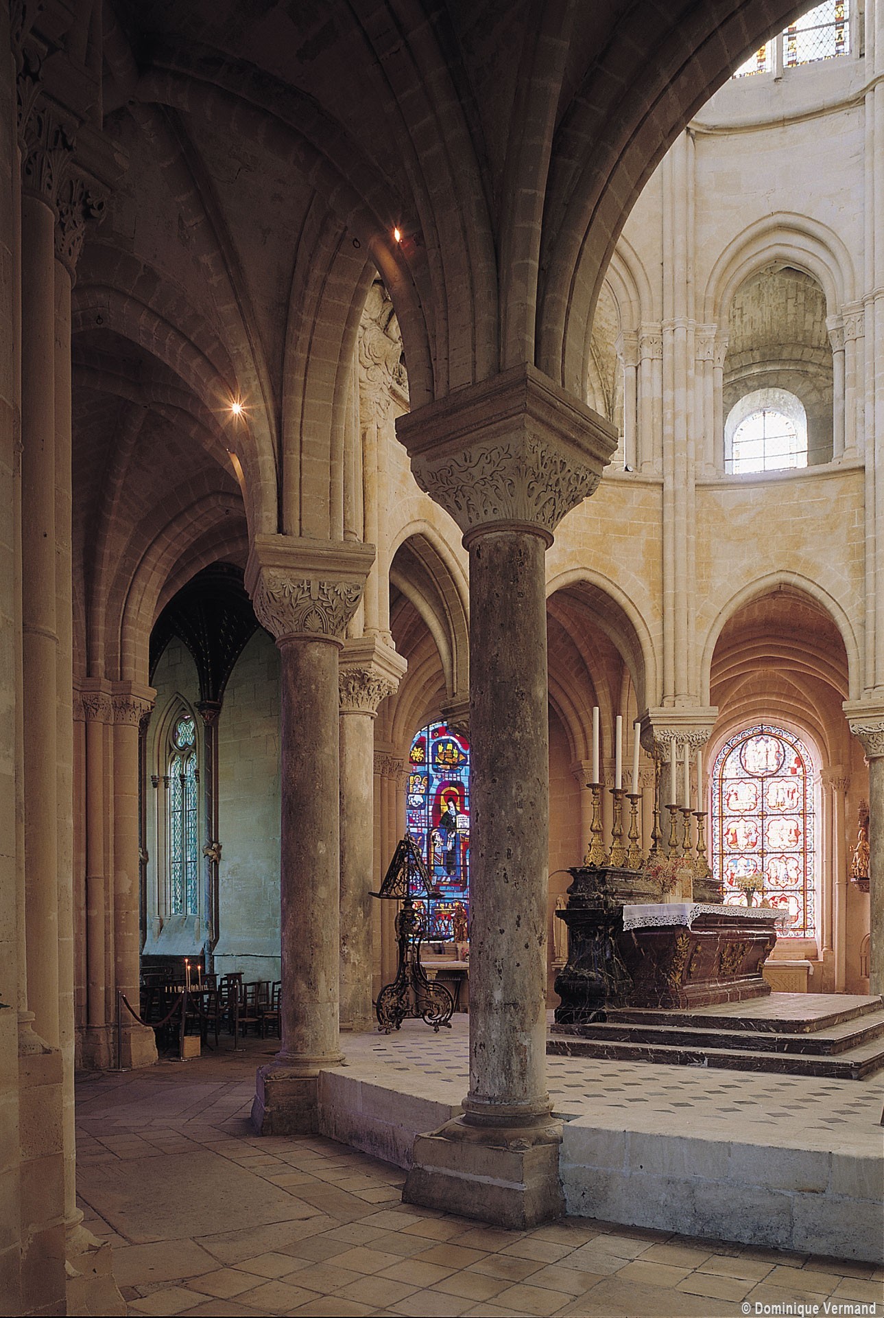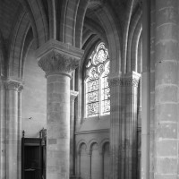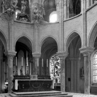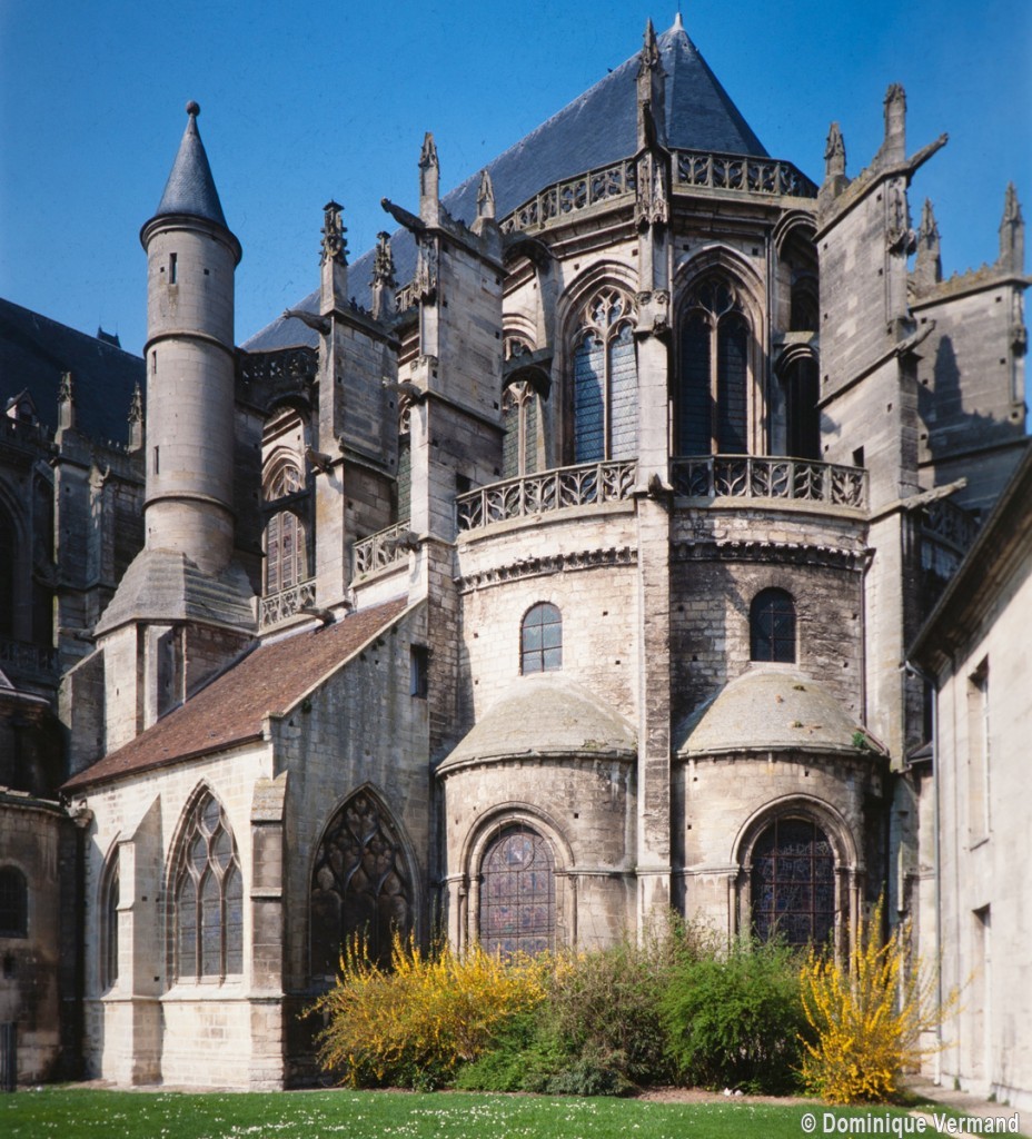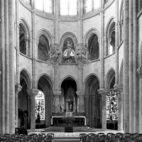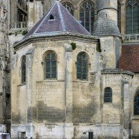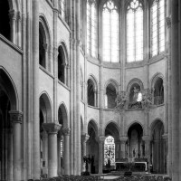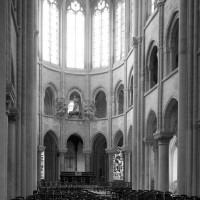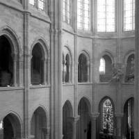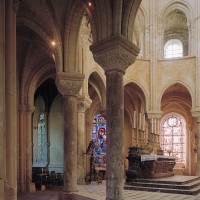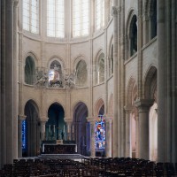 L’abside, de plan outrepassé, communique avec le déambulatoire par des arcades brisées retombant sur de minces colonnes monolithiques qui sont vraisemblablement un remploi gallo-romain. L’élévation se caractérise par la présence de tribunes voûtées, fréquentes dans l’architecture gothique du 12ème siècle. Avec une hauteur sous voûte de 18 m à l’origine contre 23,50 m aujourd’hui, l’étage supérieur ne comportait que de petites fenêtres en plein cintre. Parfaitement conservés dans leur état du 12ème siècle, les bas-côté du choeur et le déambulatoire avec ses chapelles rayonnantes contiguës s’inspirent directement – profils des arcs et des ogives, chapiteaux à feuilles d’acanthe, mise en oeuvre des éléments architecturaux…- du choeur de Saint-Denis (1140-1144), premier manifeste du nouveau style gothique.
