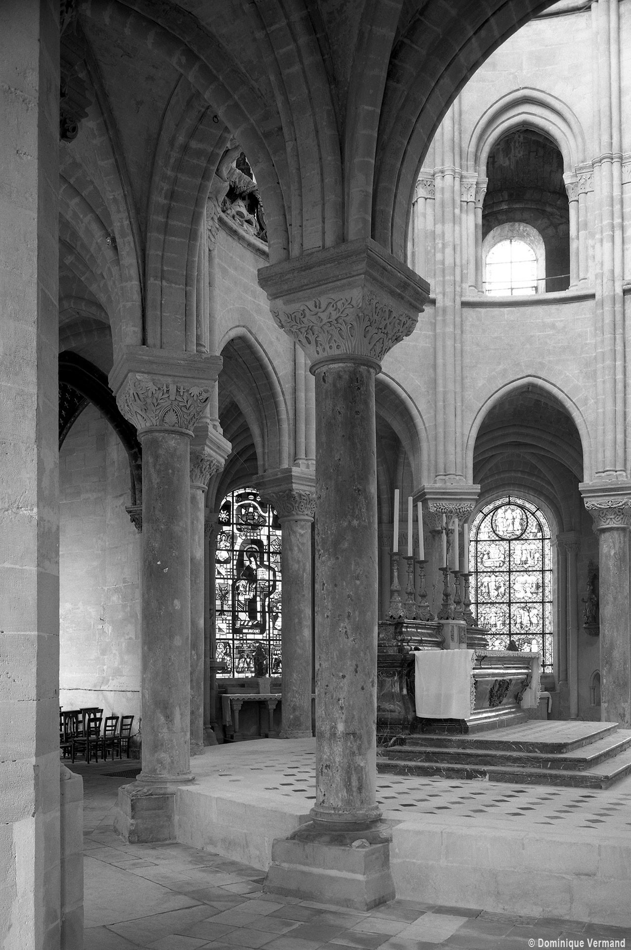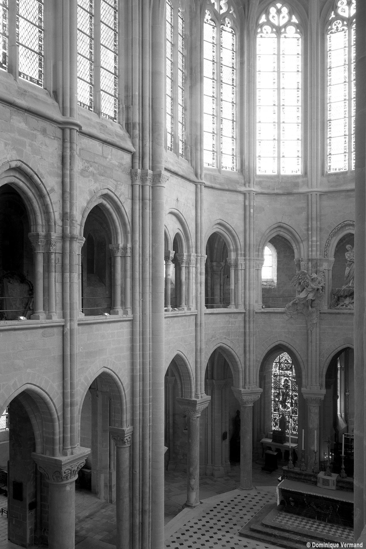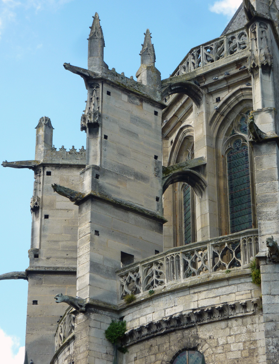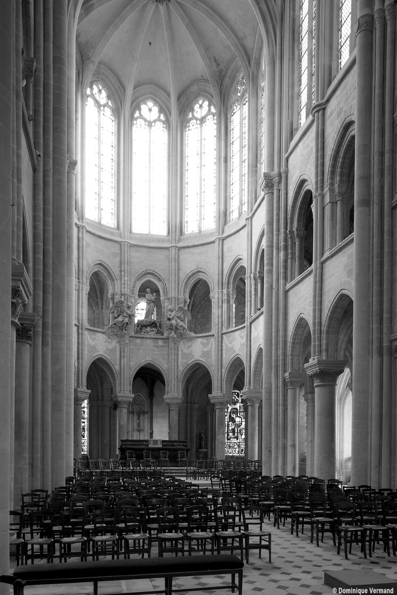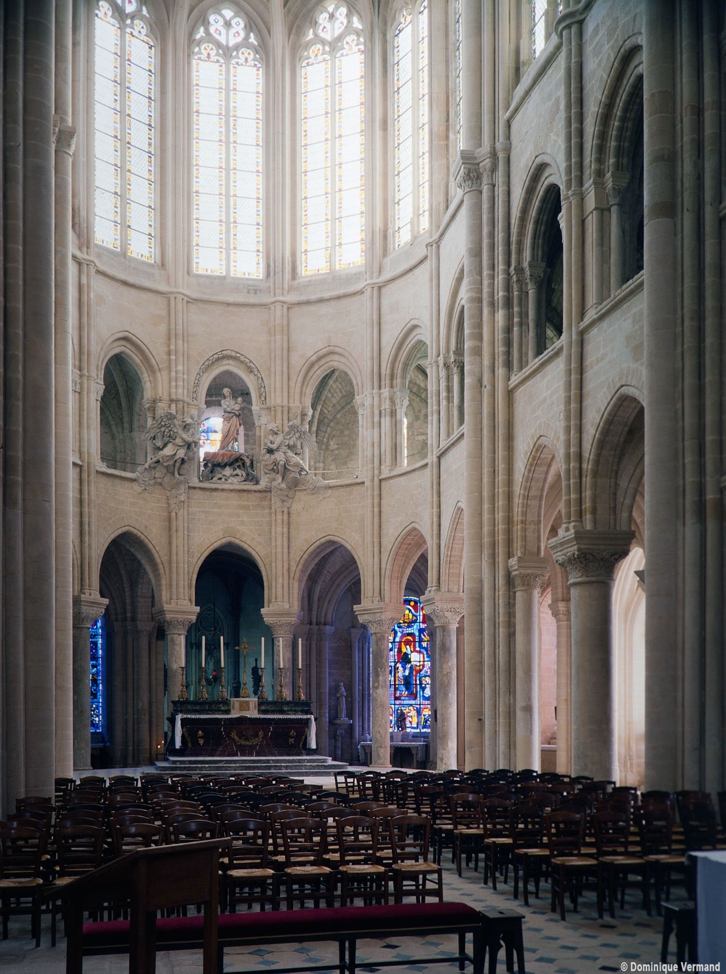 L’abside, de plan outrepassé, communique avec le déambulatoire par des arcades brisées retombant sur de minces colonnes monolithiques qui sont vraisemblablement un remploi gallo-romain. L’élévation se caractérise par la présence de tribunes voûtées, fréquentes dans l’architecture gothique du 12ème siècle. Avec une hauteur sous voûte de 18 m à l’origine contre 23,50 m aujourd’hui, l’étage supérieur ne comportait que de petites fenêtres en plein cintre. Parfaitement conservés dans leur état du 12ème siècle, les bas-côté du choeur et le déambulatoire avec ses chapelles rayonnantes contiguës s’inspirent directement – profils des arcs et des ogives, chapiteaux à feuilles d’acanthe, mise en oeuvre des éléments architecturaux…- du choeur de Saint-Denis (1140-1144), premier manifeste du nouveau style gothique.