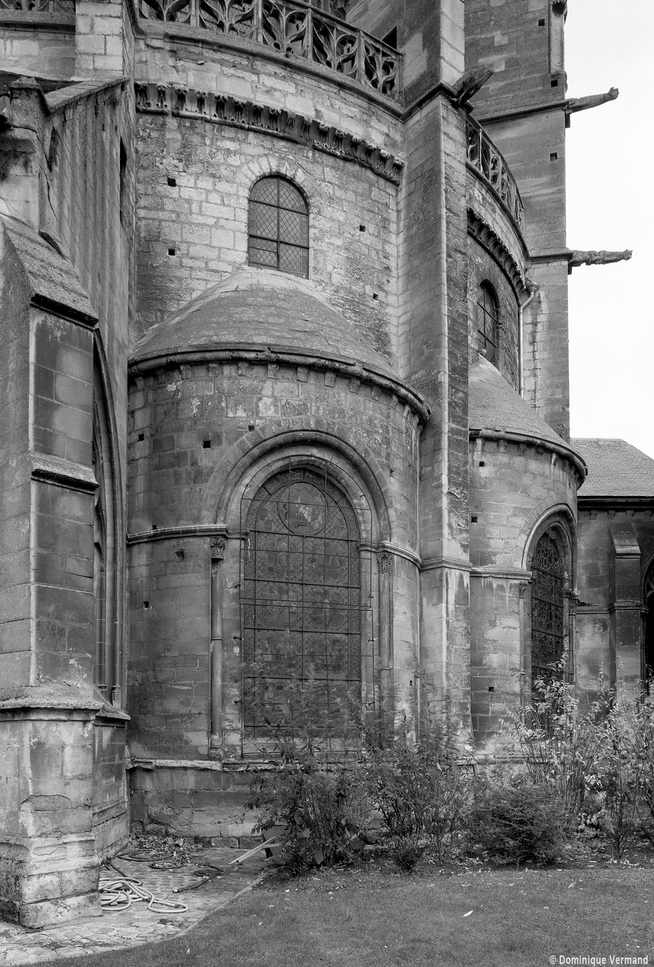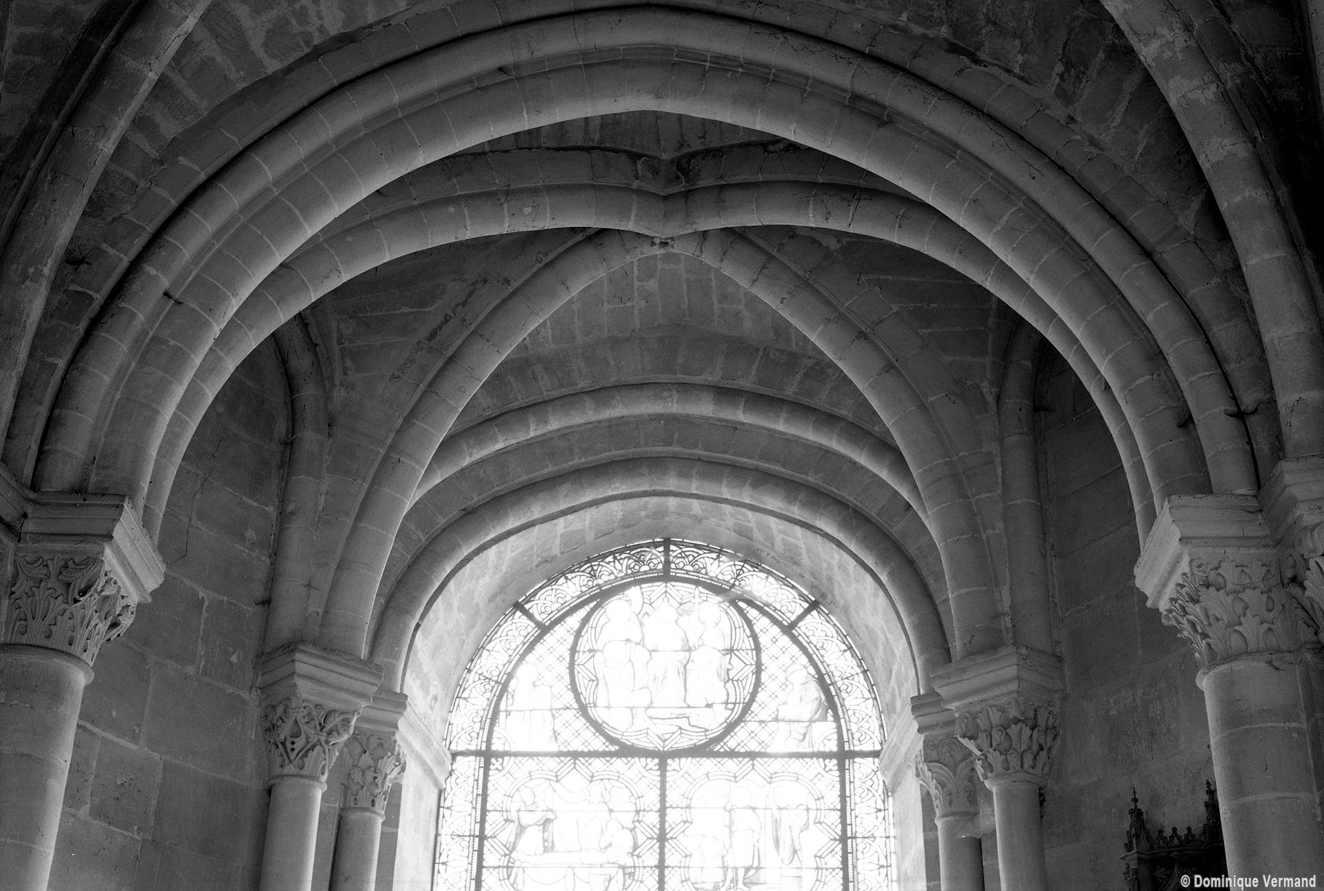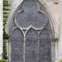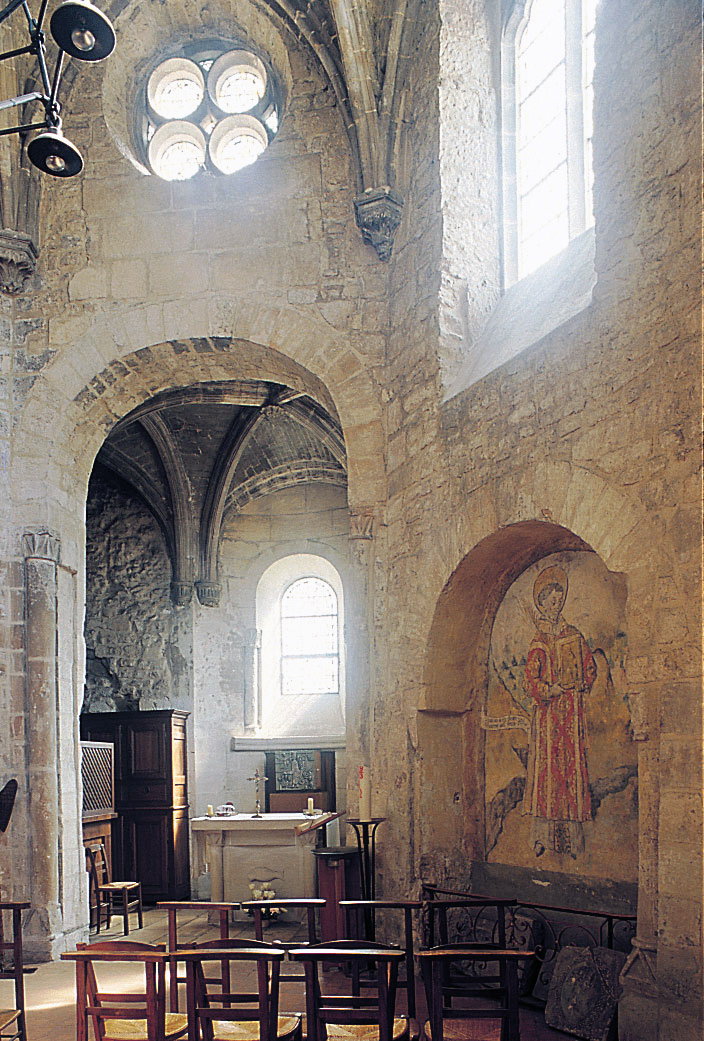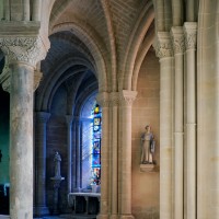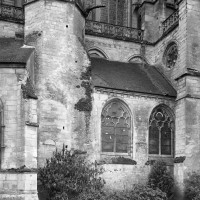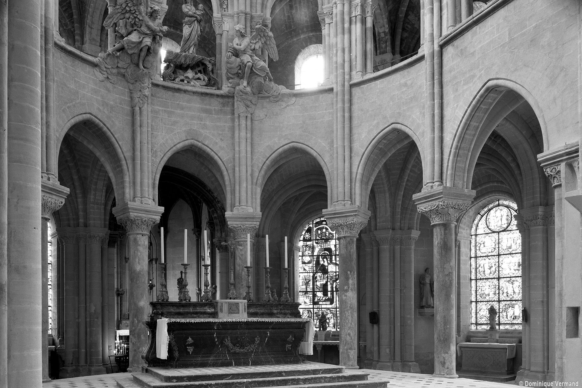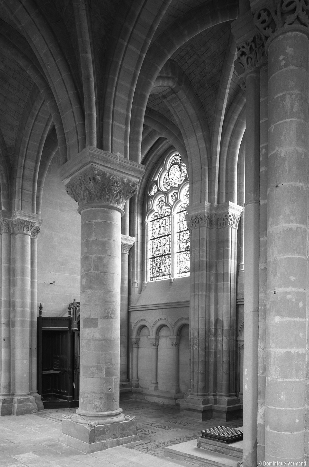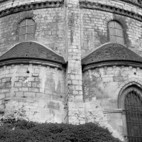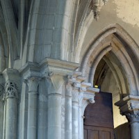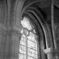 L’abside, de plan outrepassé, communique avec le déambulatoire par des arcades brisées retombant sur de minces colonnes monolithiques qui sont vraisemblablement un remploi gallo-romain. L’élévation se caractérise par la présence de tribunes voûtées, fréquentes dans l’architecture gothique du 12ème siècle. Avec une hauteur sous voûte de 18 m à l’origine contre 23,50 m aujourd’hui, l’étage supérieur ne comportait que de petites fenêtres en plein cintre. Parfaitement conservés dans leur état du 12ème siècle, les bas-côté du choeur et le déambulatoire avec ses chapelles rayonnantes contiguës s’inspirent directement – profils des arcs et des ogives, chapiteaux à feuilles d’acanthe, mise en oeuvre des éléments architecturaux…- du choeur de Saint-Denis (1140-1144), premier manifeste du nouveau style gothique.