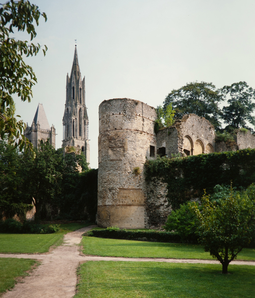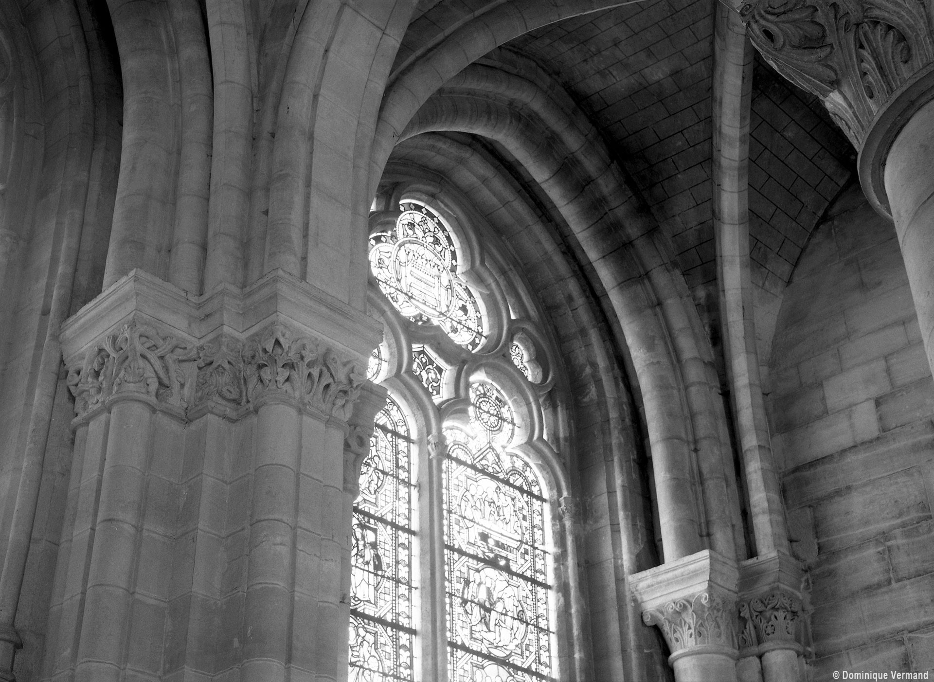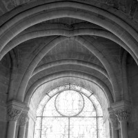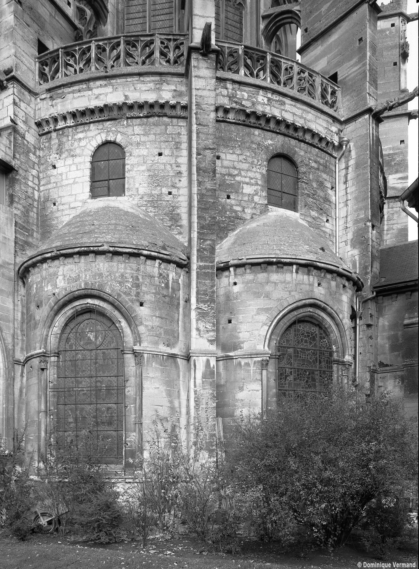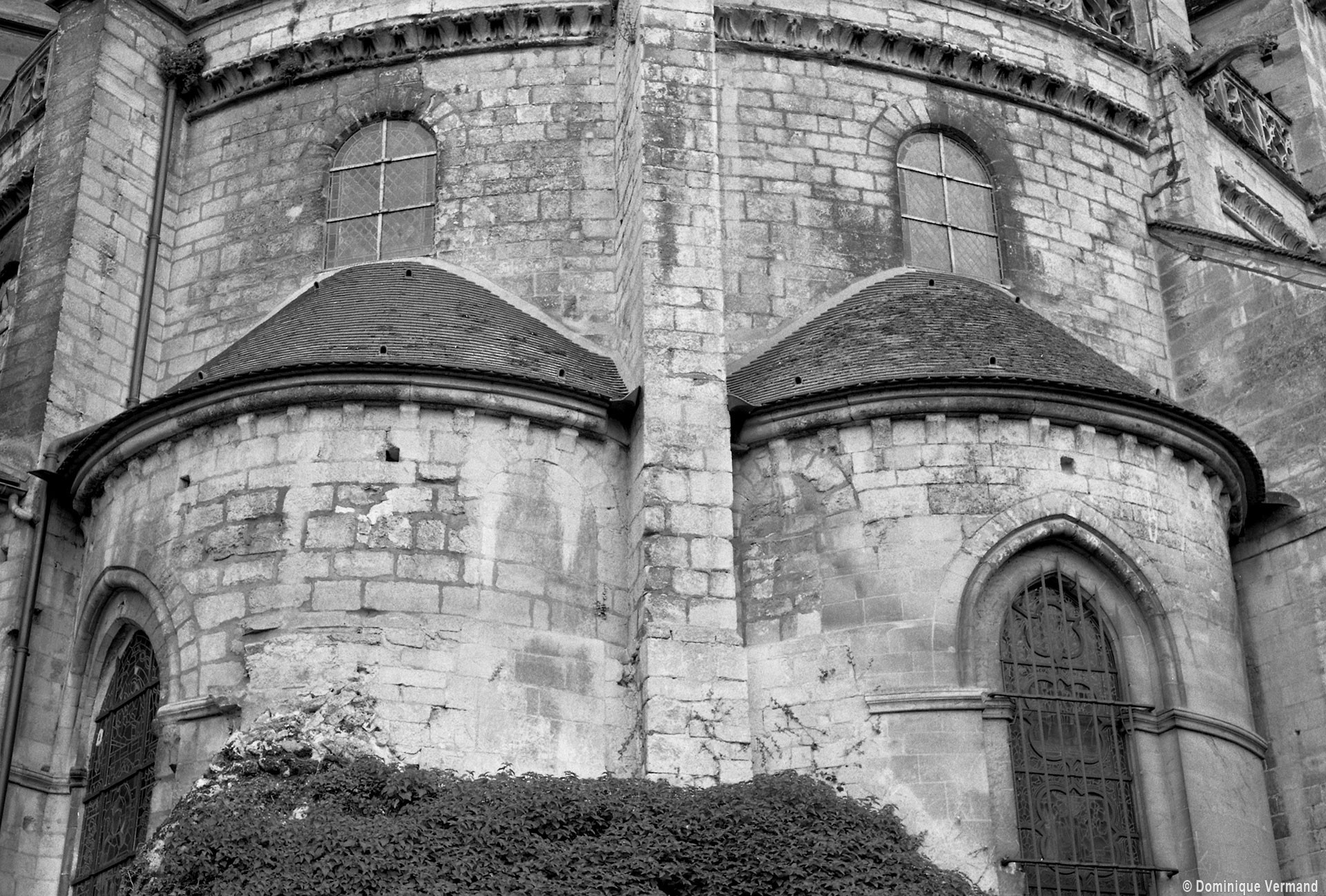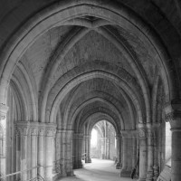 L’abside, de plan outrepassé, communique avec le déambulatoire par des arcades brisées retombant sur de minces colonnes monolithiques qui sont vraisemblablement un remploi gallo-romain. L’élévation se caractérise par la présence de tribunes voûtées, fréquentes dans l’architecture gothique du 12ème siècle. Avec une hauteur sous voûte de 18 m à l’origine contre 23,50 m aujourd’hui, l’étage supérieur ne comportait que de petites fenêtres en plein cintre. Parfaitement conservés dans leur état du 12ème siècle, les bas-côté du choeur et le déambulatoire avec ses chapelles rayonnantes contiguës s’inspirent directement – profils des arcs et des ogives, chapiteaux à feuilles d’acanthe, mise en oeuvre des éléments architecturaux…- du choeur de Saint-Denis (1140-1144), premier manifeste du nouveau style gothique.