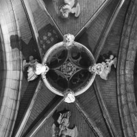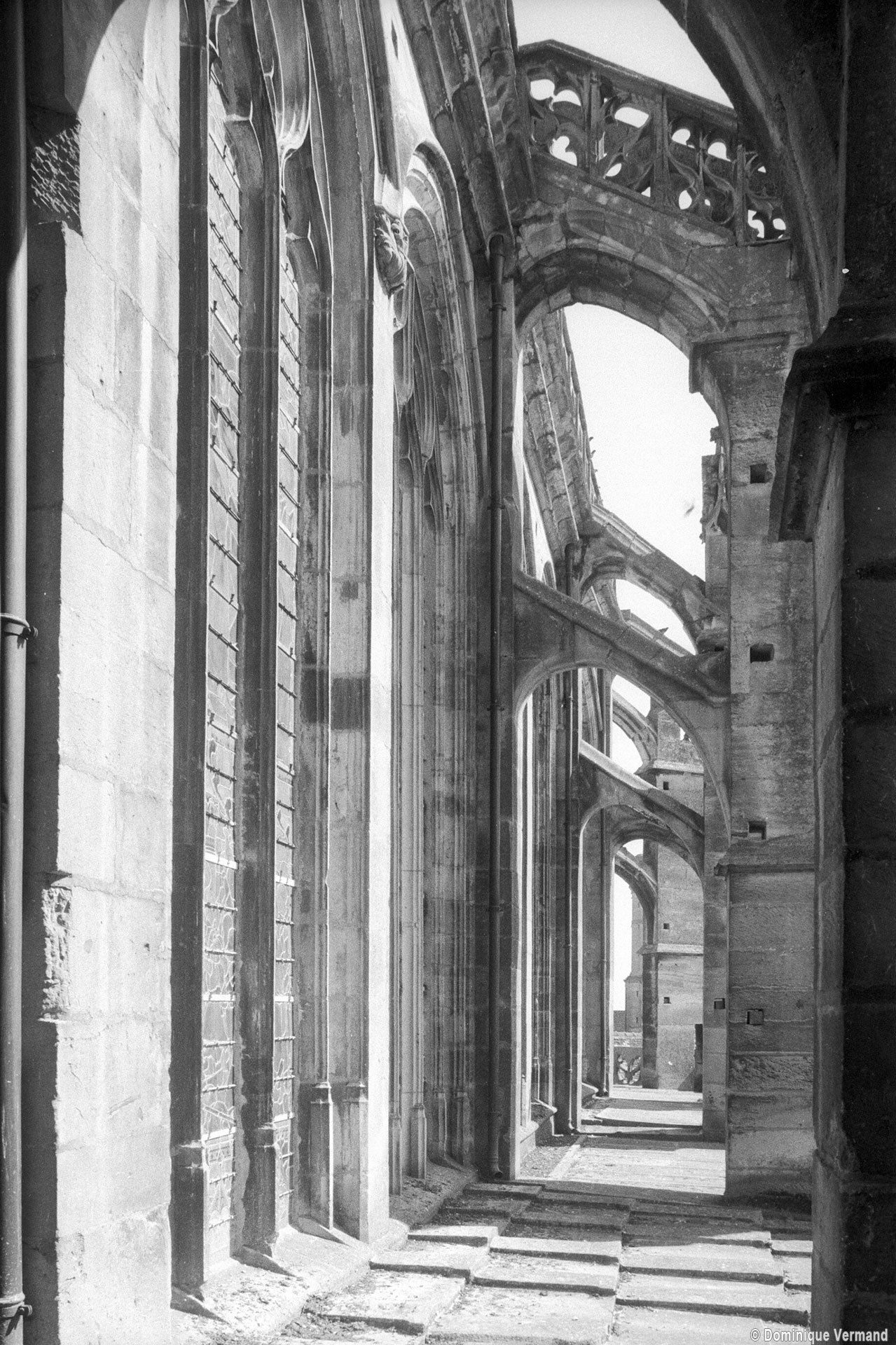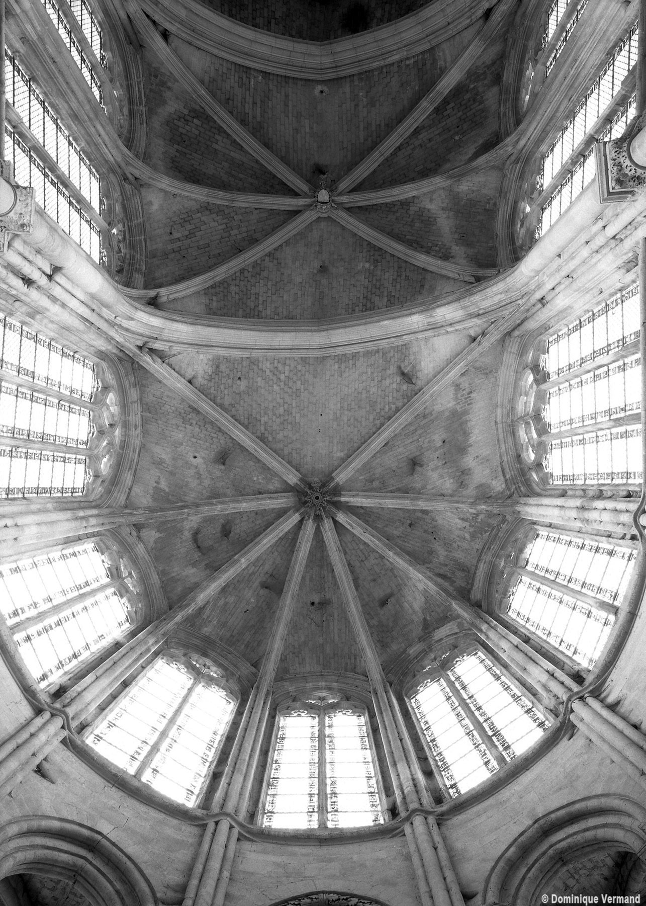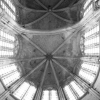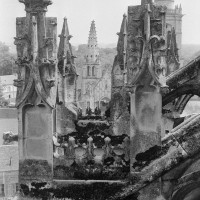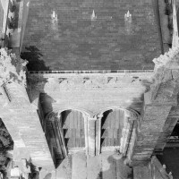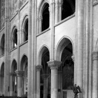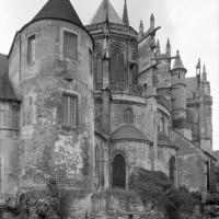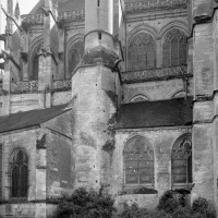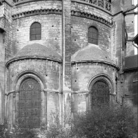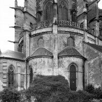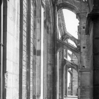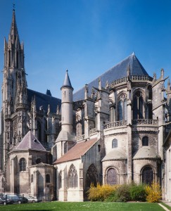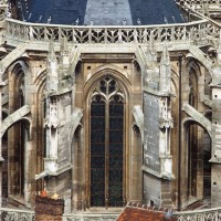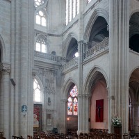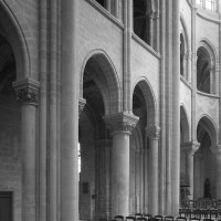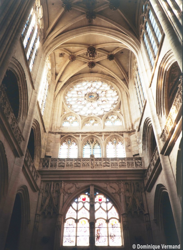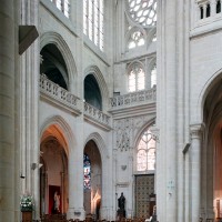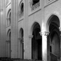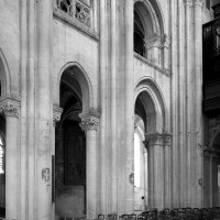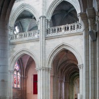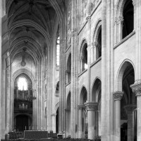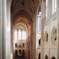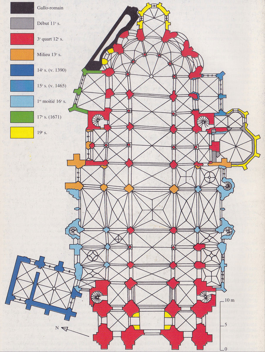 Le premier consiste à supprimer le transept, ajouté au milieu du 13ème siècle puis profondément remanié au 16ème. Le second nécessite de substituer à l’étage actuel des fenêtres hautes, du 16ème siècle, un étage beaucoup moins élevé, tel qu’il existe encore à la travée du grand orgue où la voûte du 12ème siècle s’est seule conservée. Ainsi restituée, la cathédrale du 12ème siècle comprenait simplement une nef avec bas-côtés suivie directement d’un choeur à déambulatoire avec chapelles rayonnantes.