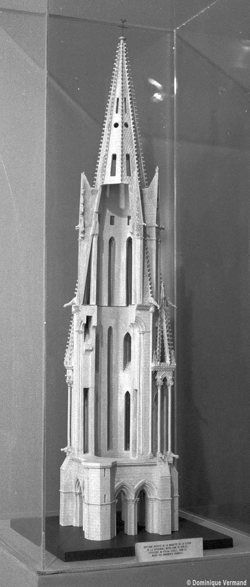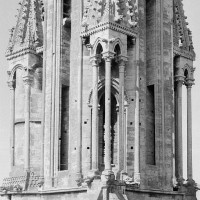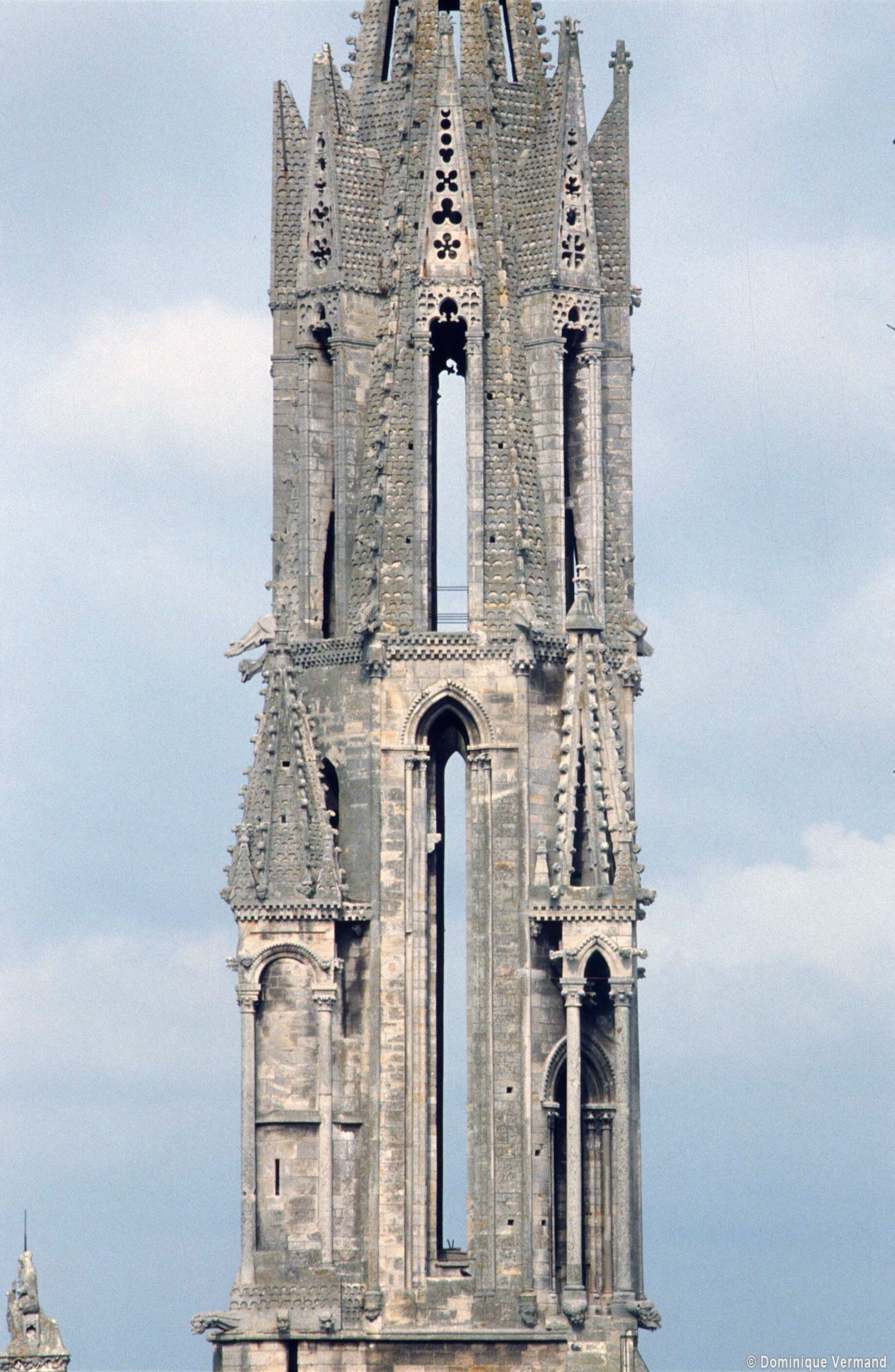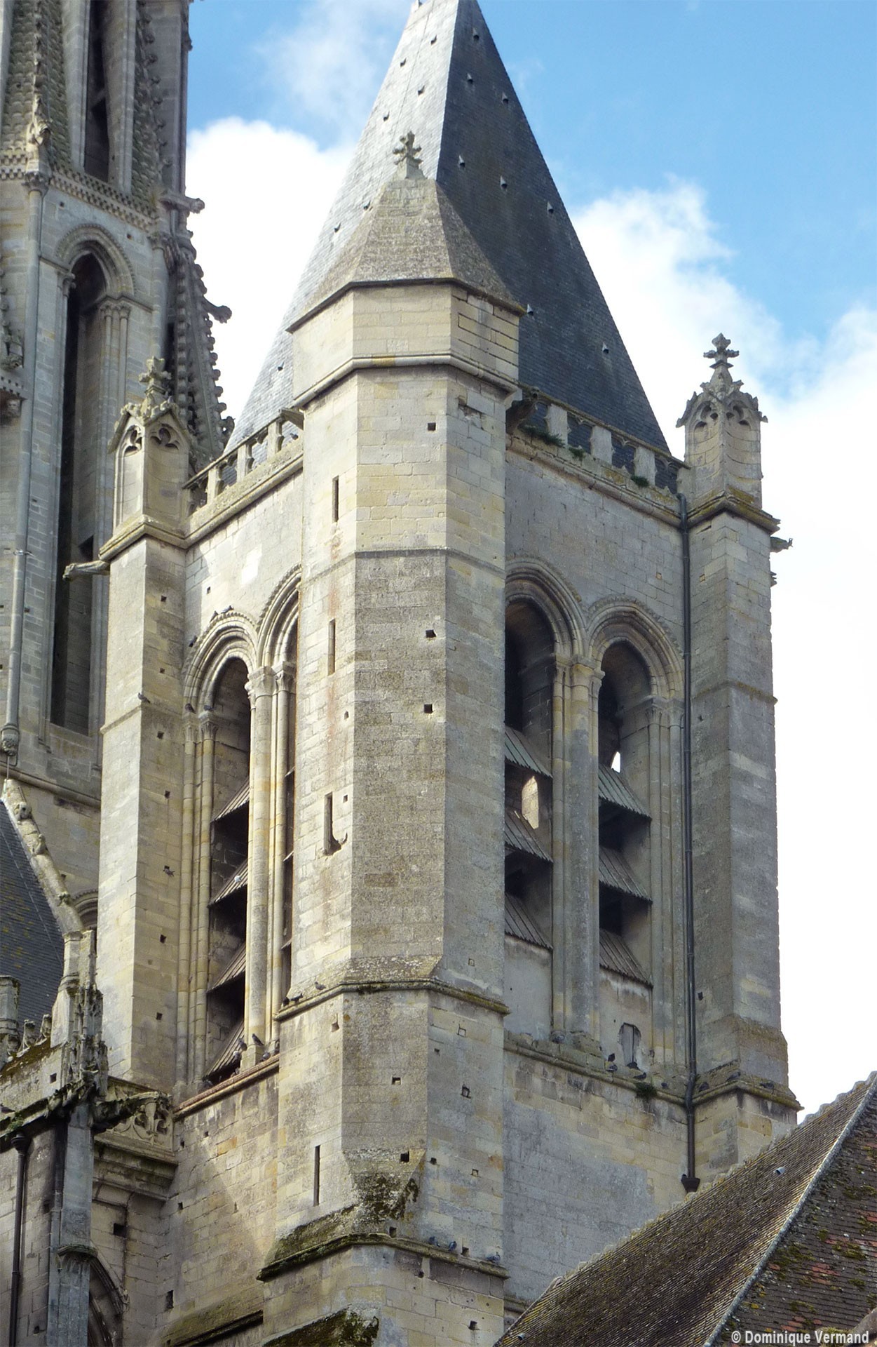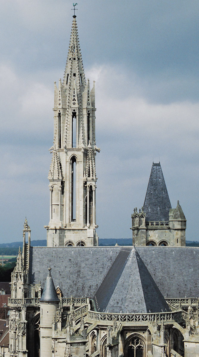 D’une hauteur de 78 mètres au-dessus du sol, elle superpose deux étages. Le premier, prolongement de la tour du 12ème siècle, est un octogone largement ajouré de baies élancées et flanqué aux angles de pinacles reposant sur de hautes et minces colonnettes. Le second étage, qui forme la flèche proprement dite, est une pyramide à huit pans ajourée d’autant de hautes lucarnes surmontées d’un gâble aigu qui la ceinture telle une couronne de pierre. L’originalité et la qualité esthétique de la flèche de Senlis tiennent à l’absence totale de rupture d’un étage par rapport à l’autre, permettant ainsi la progression de la silhouette vers des formes de plus en plus aiguës. Amorcé avec les contreforts de la façade et la tour du 12ème siècle, puis continué par l’étage octogonal, le mouvement vertical s’affirme encore fortement au niveau de la pyramide grâce aux gâbles hauts et serrés qui la ceinturent. A l’inverse, la forme pyramidale de l’étage supérieur est annoncée dès l’étage octogonal avec les pinacles qui coiffent les dais assis sur les angles de la tour.