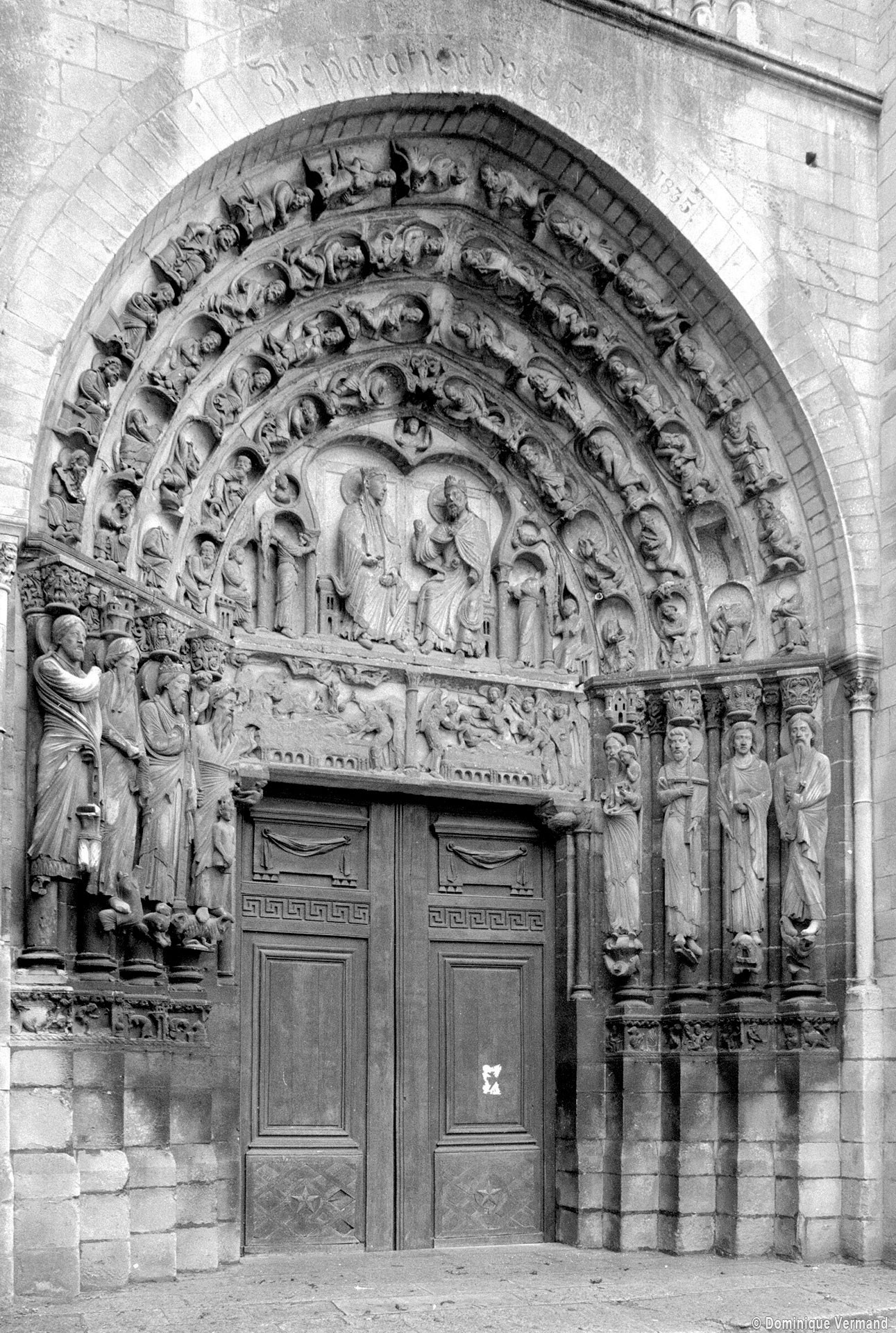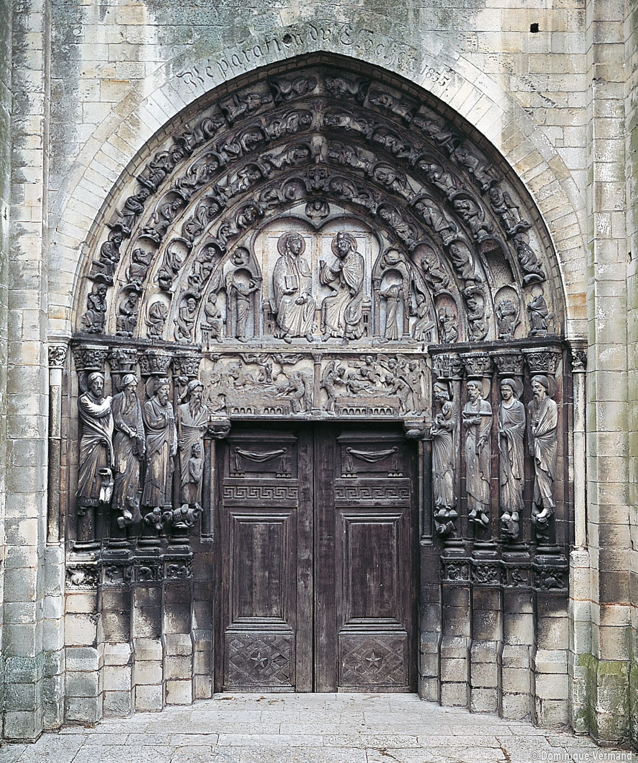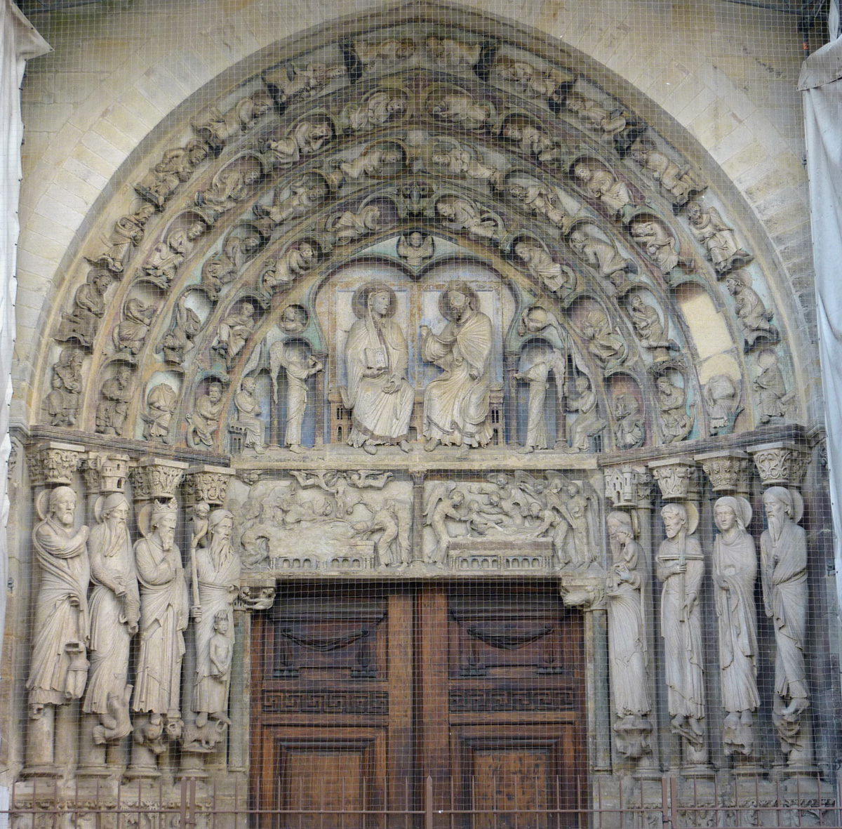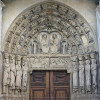 Stylistiques parce qu’il marque l’aboutissement des recherches menées sur les chantiers parisiens des années 1140 et voit s’y épanouir un style extraordinaire de vie et de fraîcheur, véritable “moment” de la sculpture gothique appelé à briller d’un éclat aussi vif que bref. La lecture de son imagerie est claire : les voussures composent un arbre de Jessé abritant les prophètes et ancêtres de la Vierge; les grandes statues d’ébrasement, au nombre de huit, représentent les sacrificateurs de l’Ancienne Loi et les annonceurs de la Passion du Christ; à leurs pieds, un calendrier illustre les occupations des mois; les deux panneaux du linteau montrent la Dormition et l’Assomption de Marie; le tympan est réservé à la scène principale, d’où découle toute l’iconographie du portail : la présence de la Vierge en majesté auprès de son Fils.