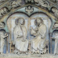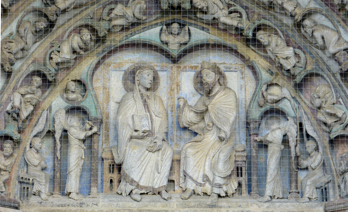 Iconographiques parce que, pour la première fois dans l’histoire de la sculpture monumentale (nous sommes au début des années 1150), c’est à Senlis que l’on trouve représenté le thème du Couronnement de la Vierge, qui deviendra l’une des plus belles parures des façades des grandes cathédrales gothiques (Laon, Chartres, Paris, Bourges, Reims…).