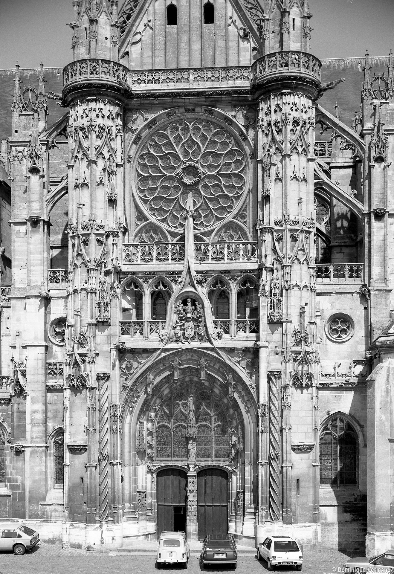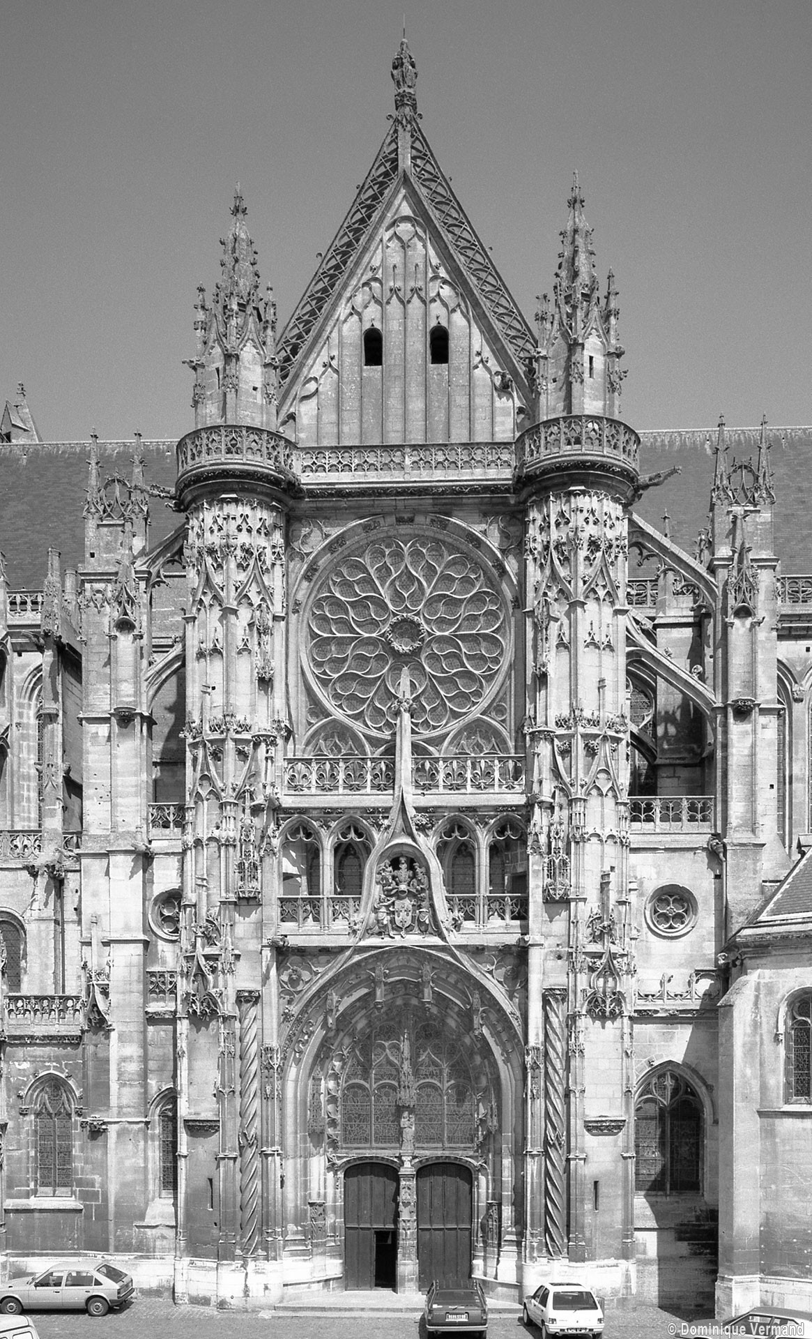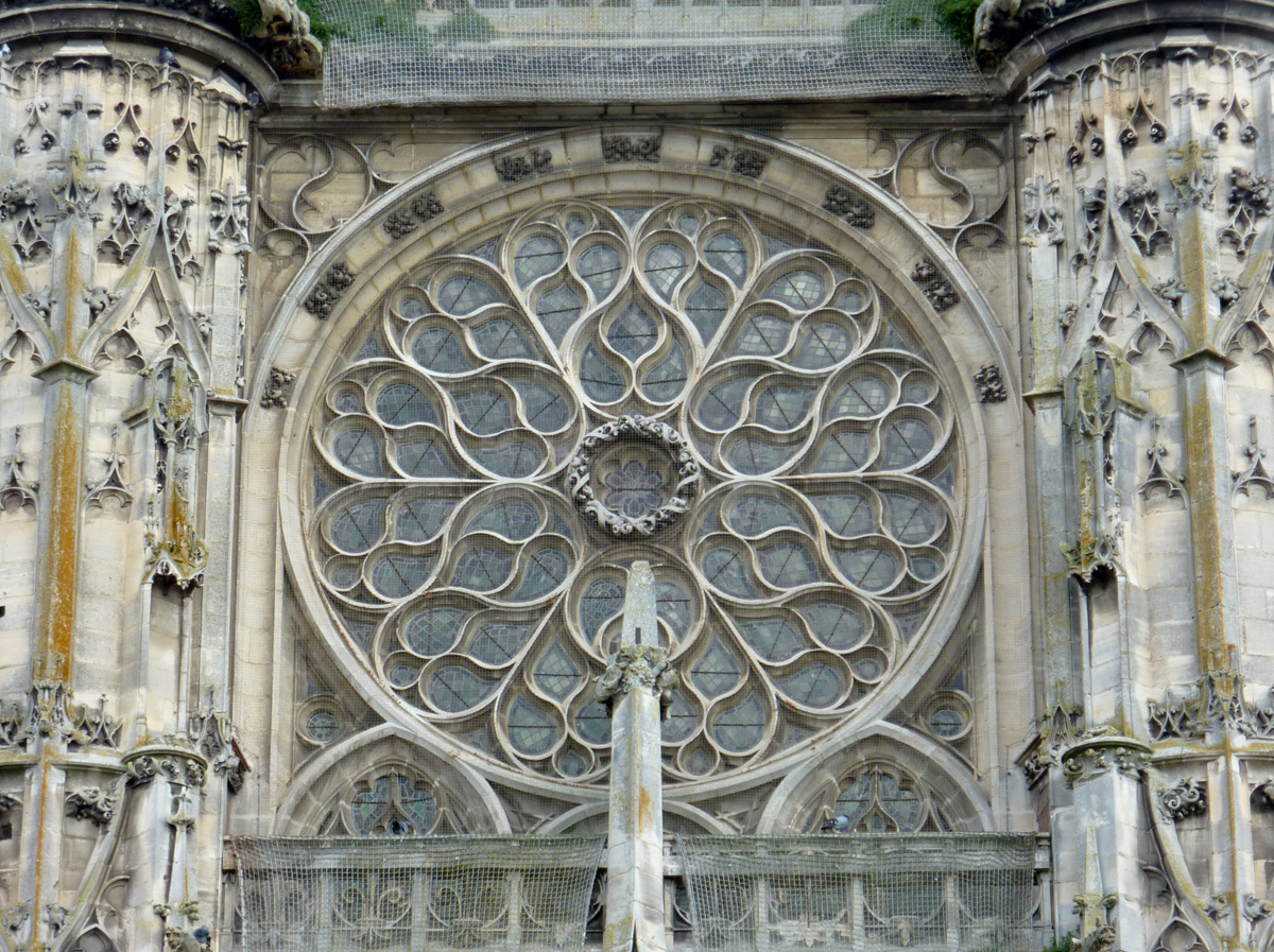 Mais c’est surtout le transept – et singulièrement celui du sud – qui fait l’objet de toutes les attentions. Construit dans les années 1530 sous l’impulsion de l’évêque Guillaume Parvi, par Pierre Chambiges, il compte parmi les réalisations majeures de son époque. Comme les autres chefs d’oeuvre des Chambiges (Sens, Beauvais, Troyes), la façade méridionale vaut à la fois par la netteté de sa composition et l’exubérance de son décor. Les deux tourelles d’escalier et la balustrade supérieure délimitent fermement le cadre à l’intérieur duquel une galerie à jour sépare, en une composition rigoureusement symétrique, le portail et l’étage de la rose. Les ébrasements et les archivoltes du portail sont ornés de niches et de clefs pendantes qui abritaient autrefois des statues. Parmi ce décor foisonnant d’où toute surface nue est proscrite, on remarquera notamment, encadrant le portail, les deux hautes colonnes torsadées, surprenant piédestal de statues disparues comme les autres.