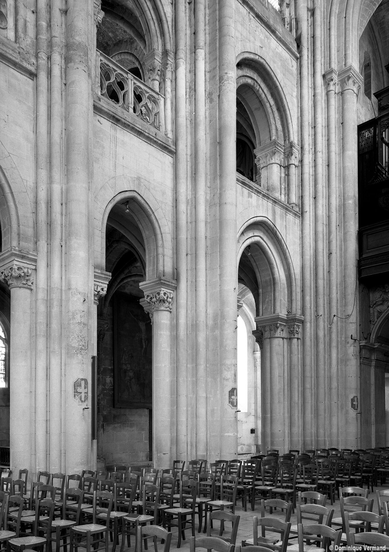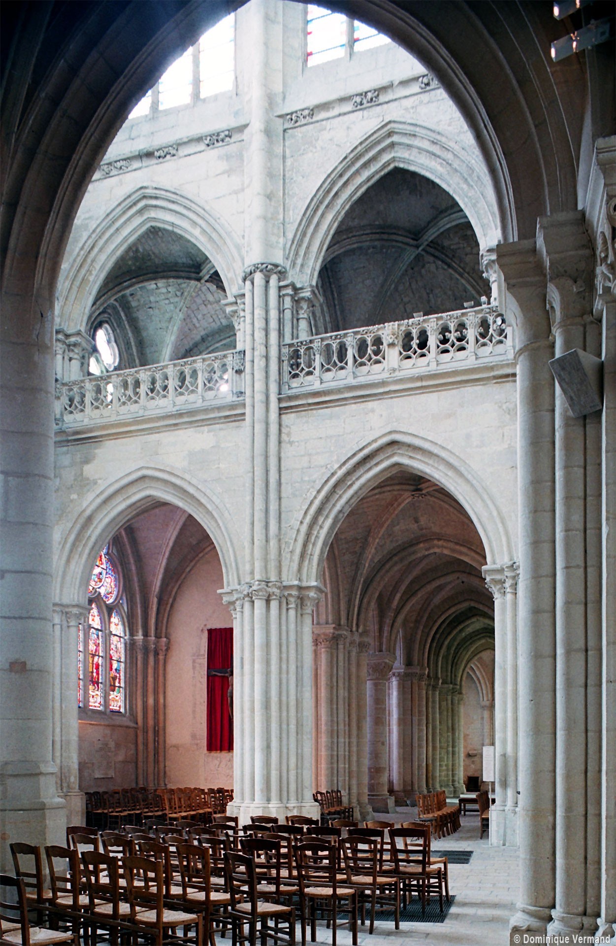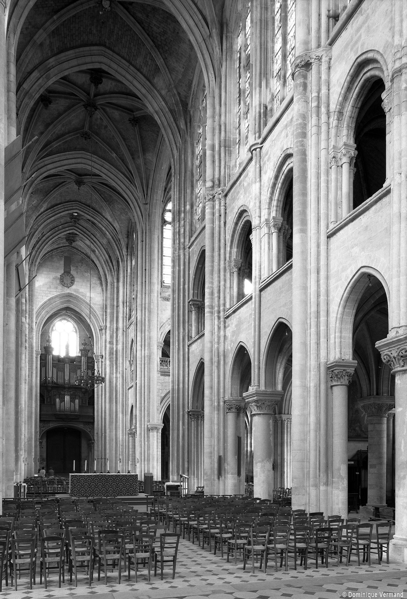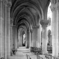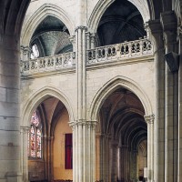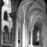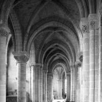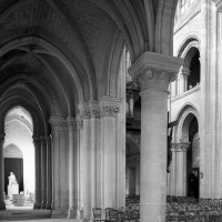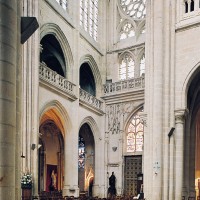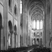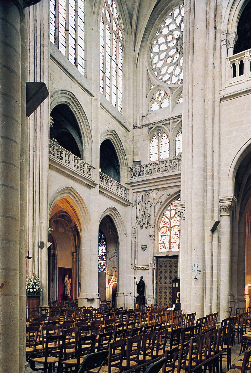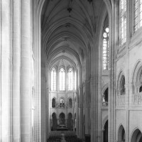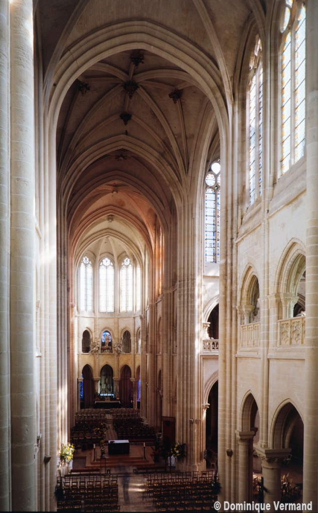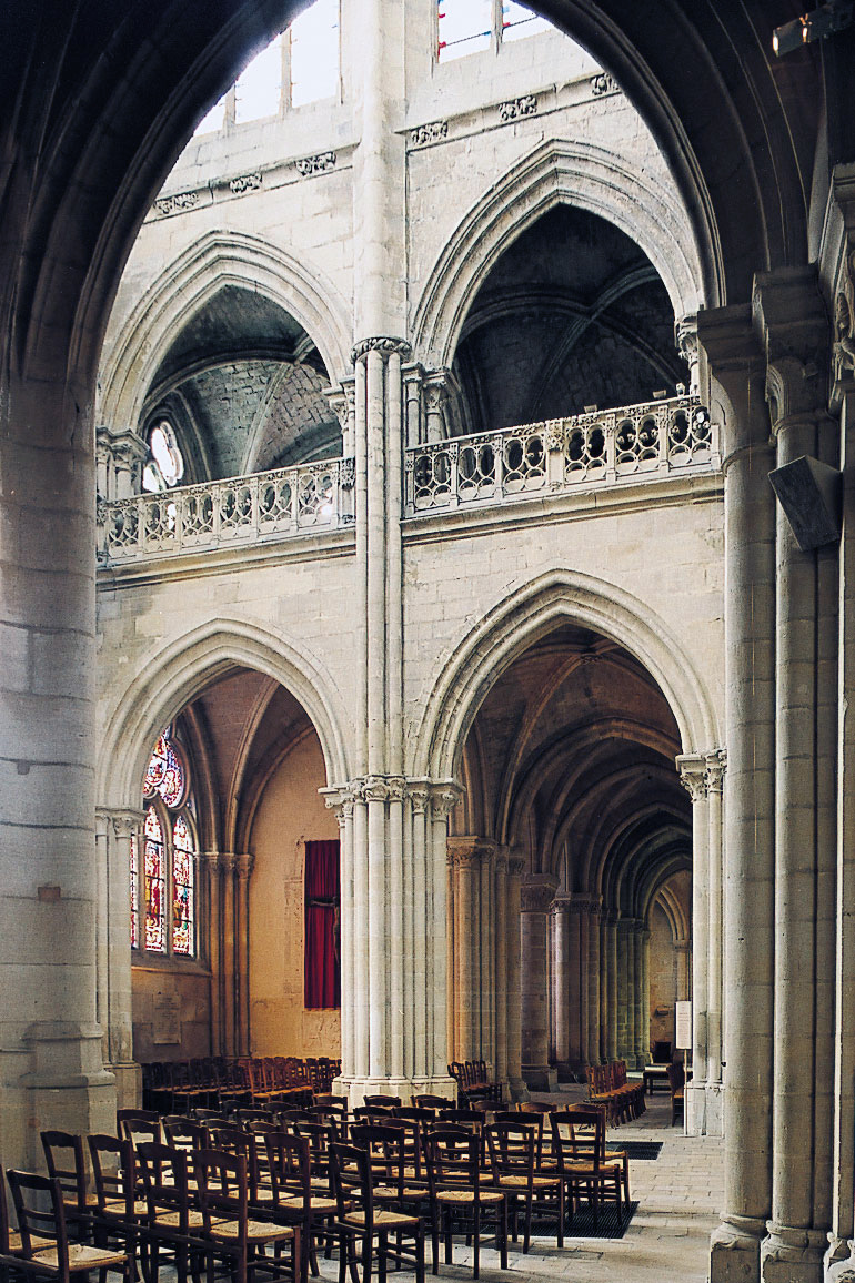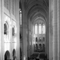 Si l’on excepte les trois premières travées, dotées de piles plus fortes – en raison de la présence des tours – et de voûtes quadripartites, la nef s’étendait en une perspective continue de cinq travées double couvertes de voûtes sexpartites en correspondance avec une alternance de piles fortes, composées de colonnes et de colonnettes, et de piles faibles, composées d’une simple colonne. Ce parti se voit encore très bien dans le choeur actuel.