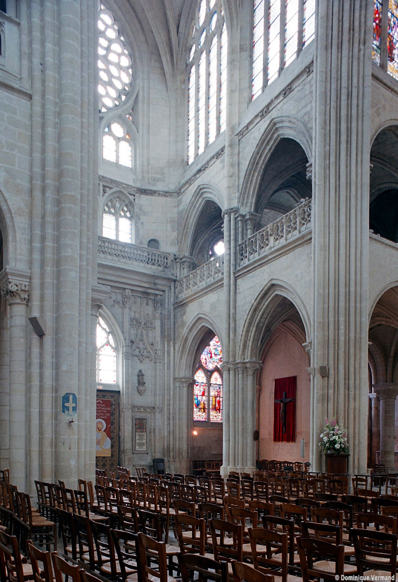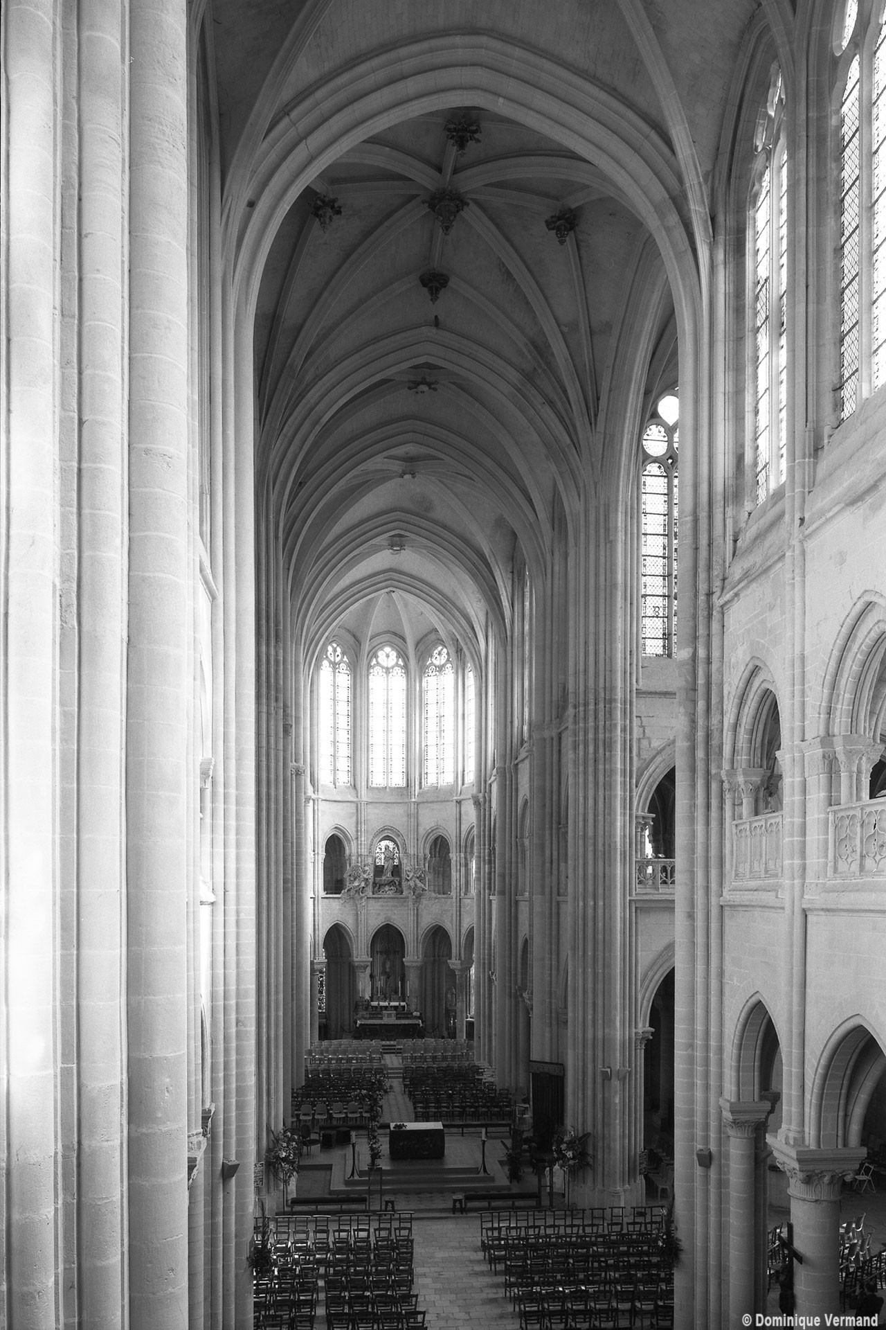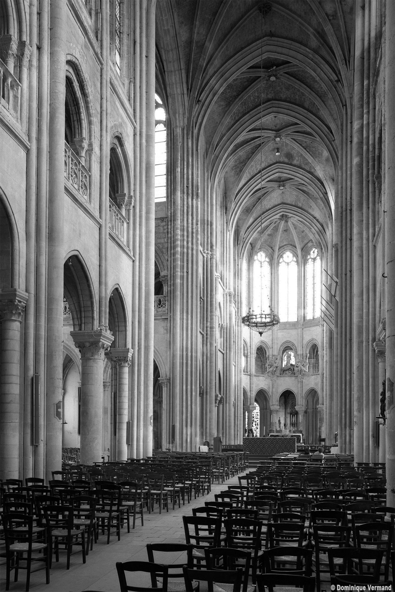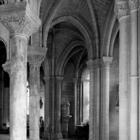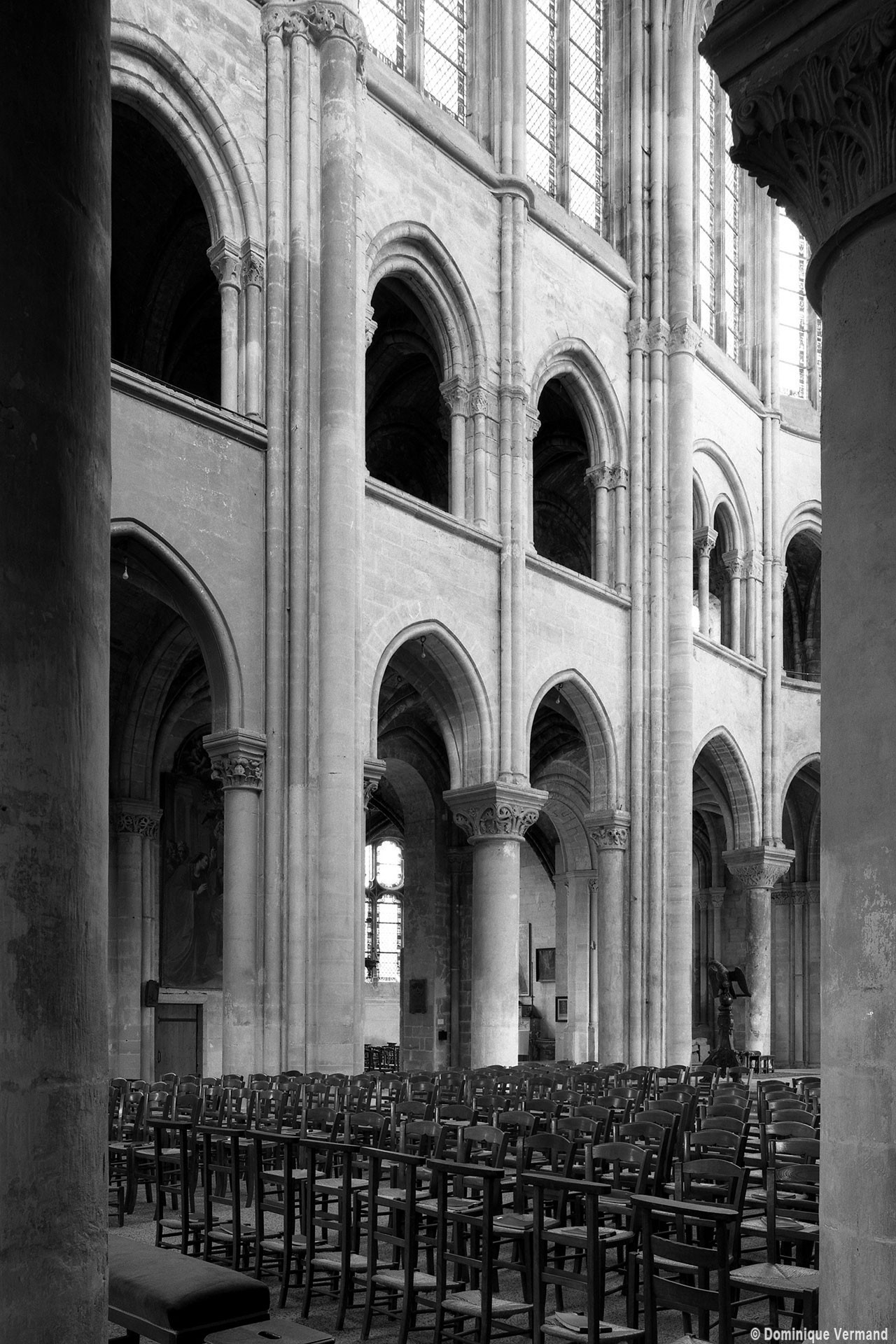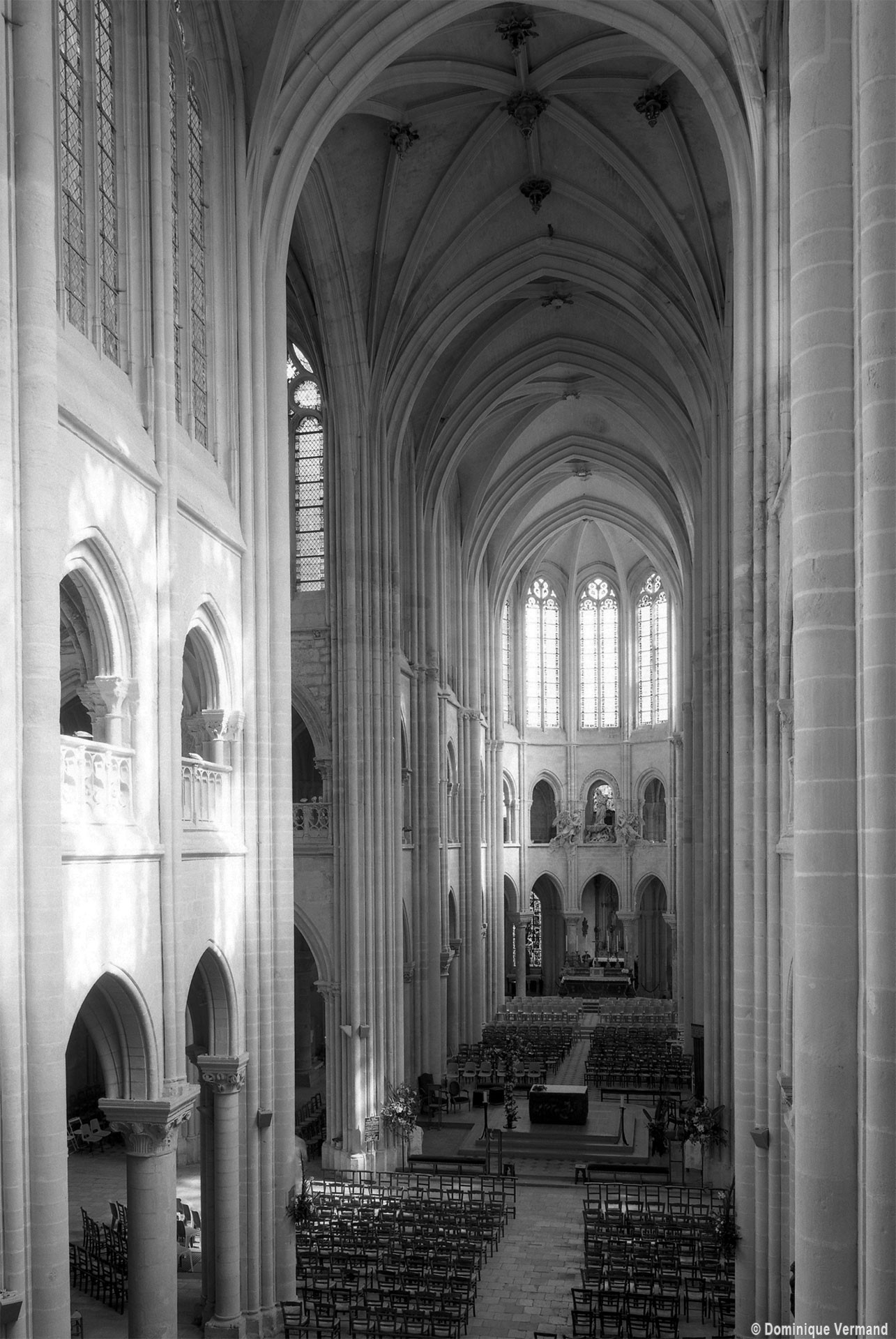 Si l’on excepte les trois premières travées, dotées de piles plus fortes – en raison de la présence des tours – et de voûtes quadripartites, la nef s’étendait en une perspective continue de cinq travées double couvertes de voûtes sexpartites en correspondance avec une alternance de piles fortes, composées de colonnes et de colonnettes, et de piles faibles, composées d’une simple colonne. Ce parti se voit encore très bien dans le choeur actuel.