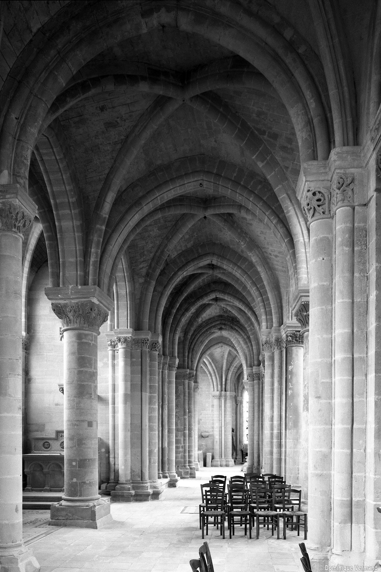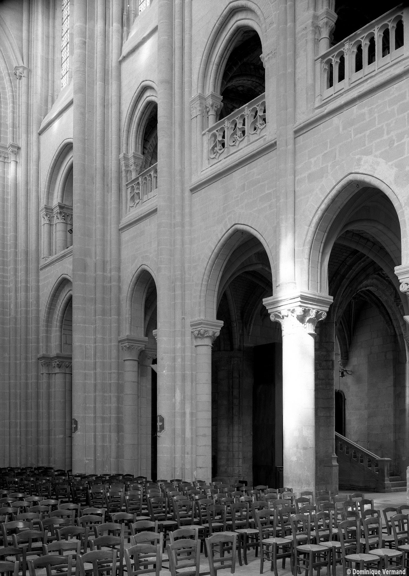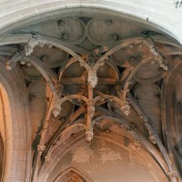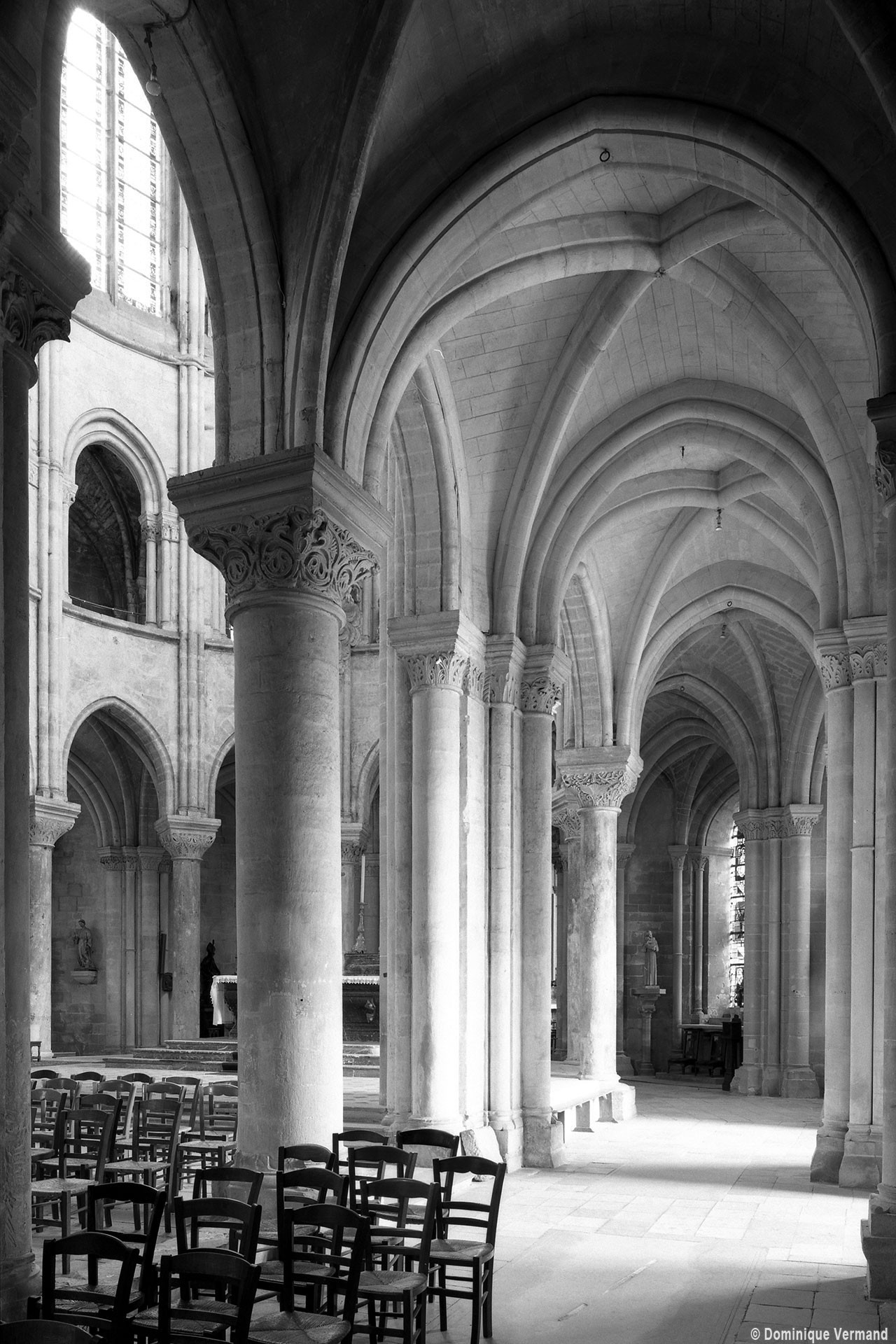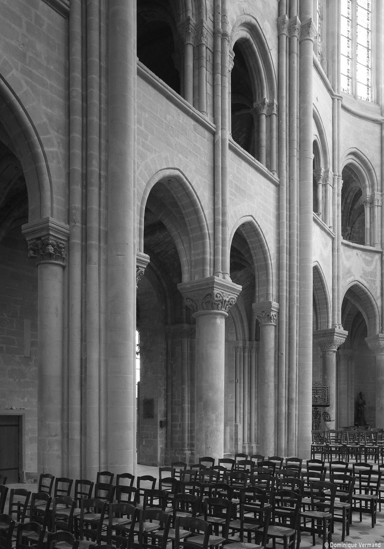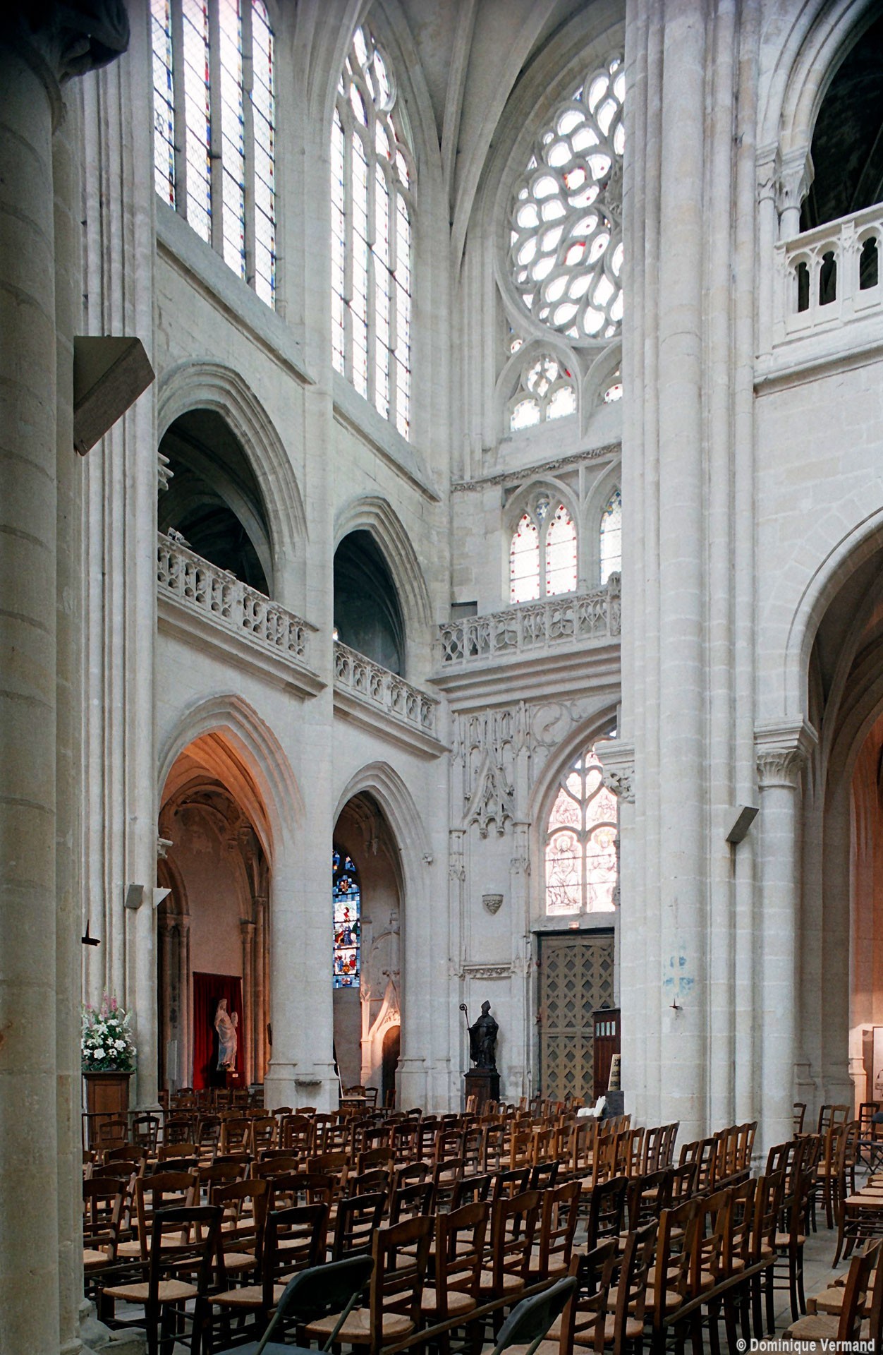 Si l’on excepte les trois premières travées, dotées de piles plus fortes – en raison de la présence des tours – et de voûtes quadripartites, la nef s’étendait en une perspective continue de cinq travées double couvertes de voûtes sexpartites en correspondance avec une alternance de piles fortes, composées de colonnes et de colonnettes, et de piles faibles, composées d’une simple colonne. Ce parti se voit encore très bien dans le choeur actuel.