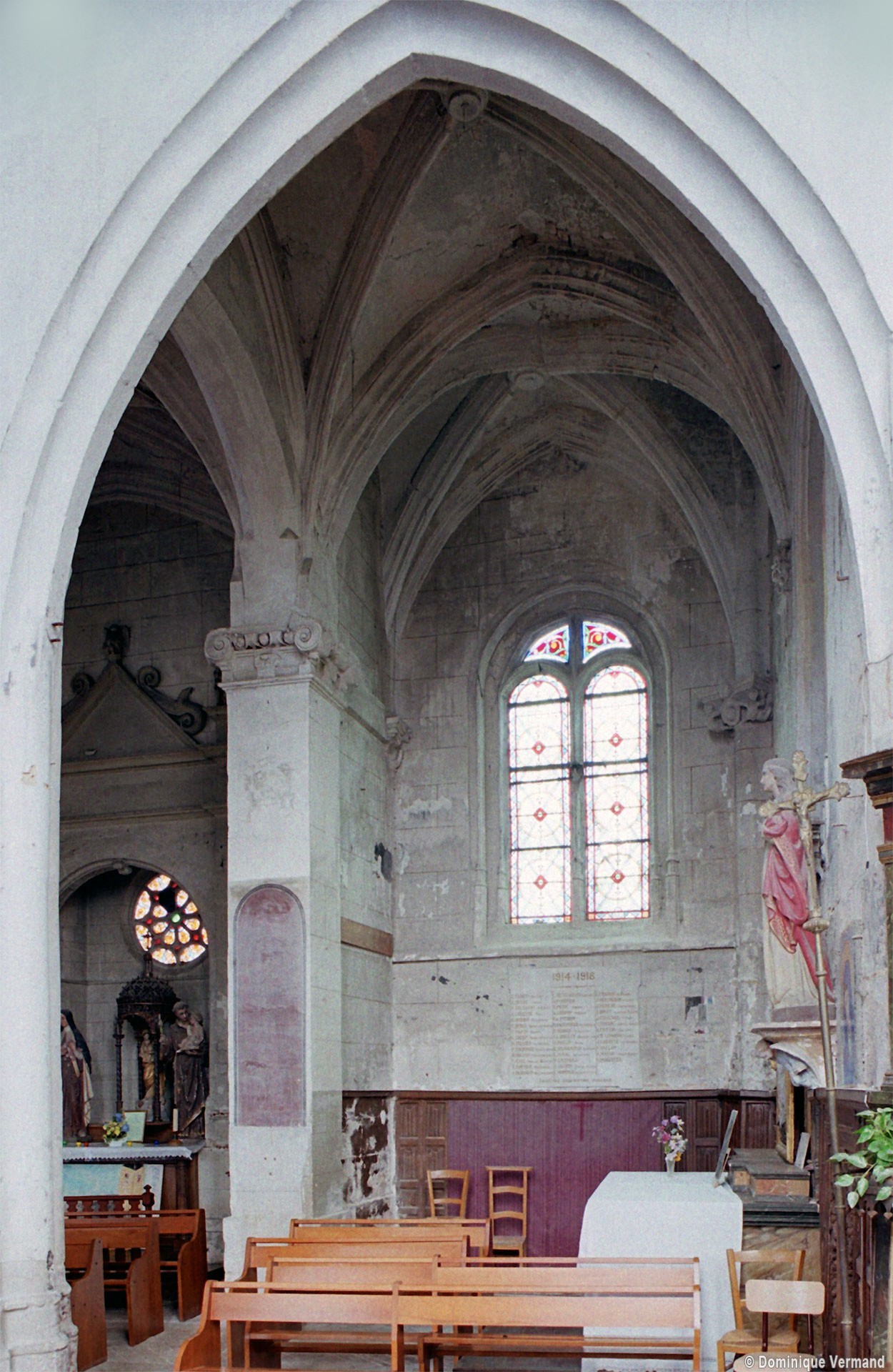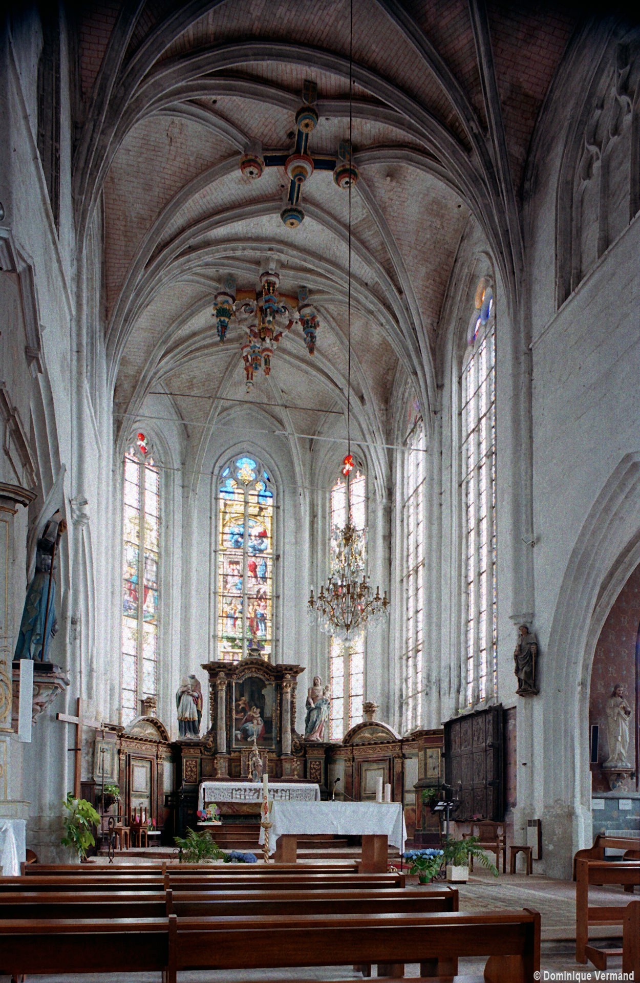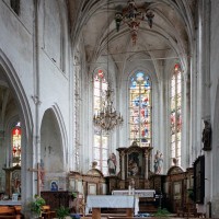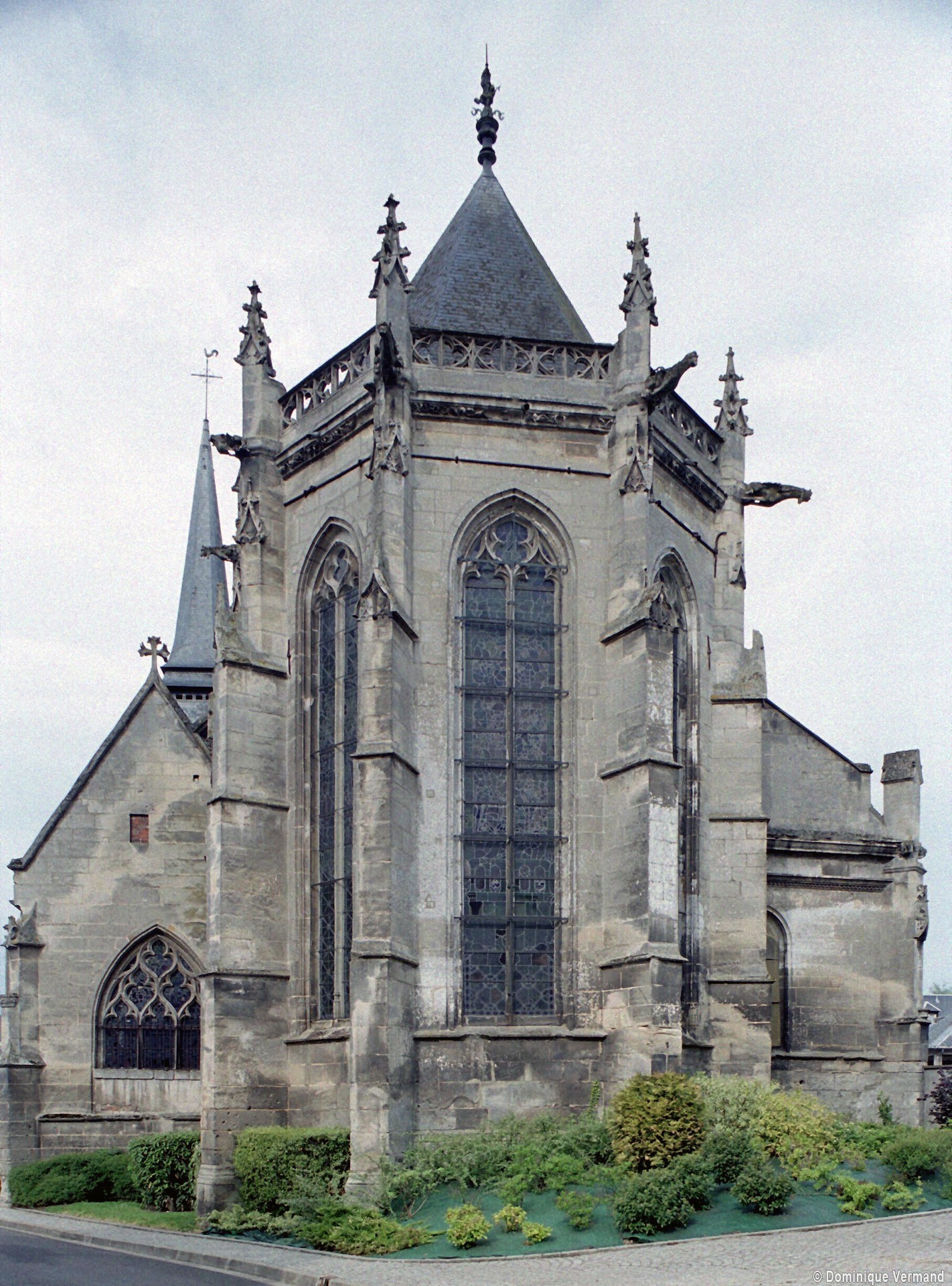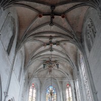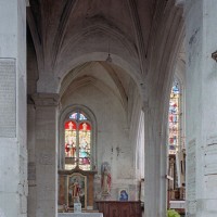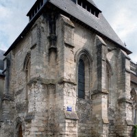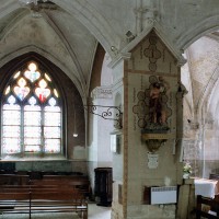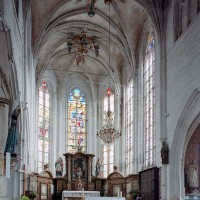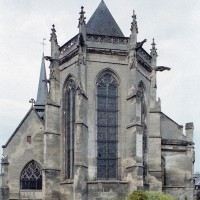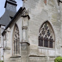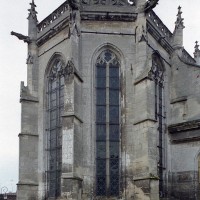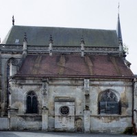 Le 16ème siècle voit la reconstruction, sur une grande échelle et en plusieurs campagnes, du choeur. La première campagne, de style gothique flamboyant, concerne les trois travées droites – dont les fenêtres hautes sont aujourd’hui bouchées -, la chapelle greffée au sud des deux premières travées et l’abside à cinq pans. La première travée n’est pas voûtée, mais les deux autres et l’abside reçoivent des voûtes ne comportant que des liernes et des tiercerons, agrémentées de clefs pendantes richement décorées dans l’abside. A l’extérieur, on appréciera le beau volume du chevet avec ses contreforts ouvragés en partie supérieure – celle-ci très restaurée cependant – et les hautes et étroites fenêtres à remplage flamboyant.