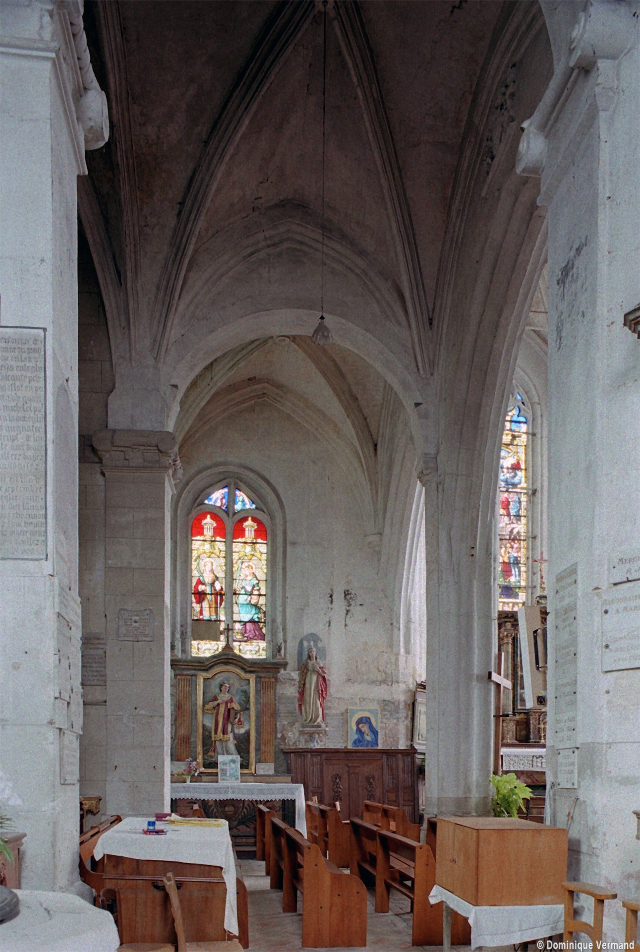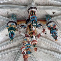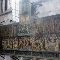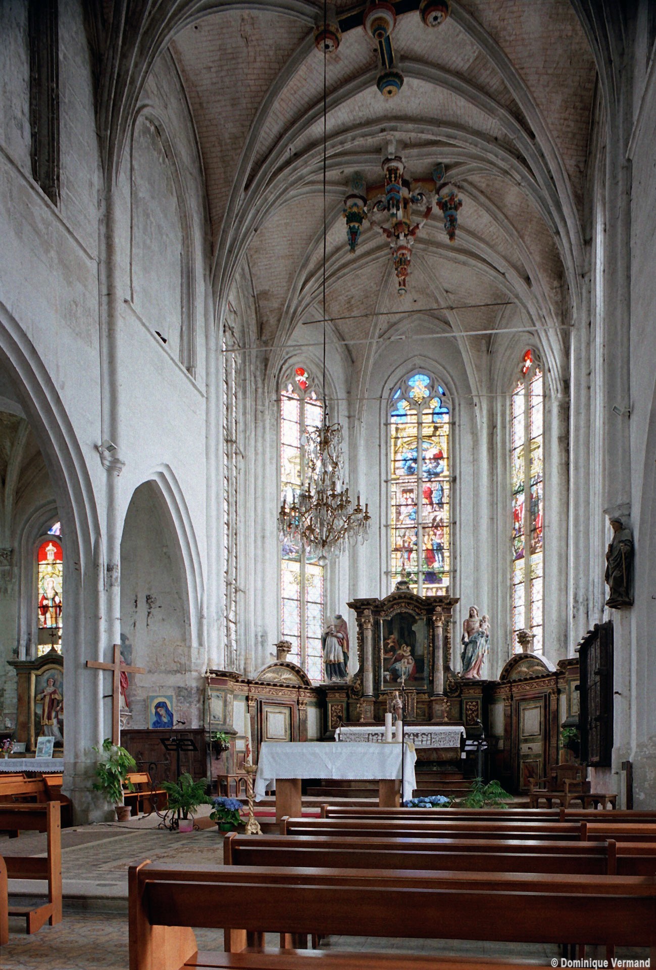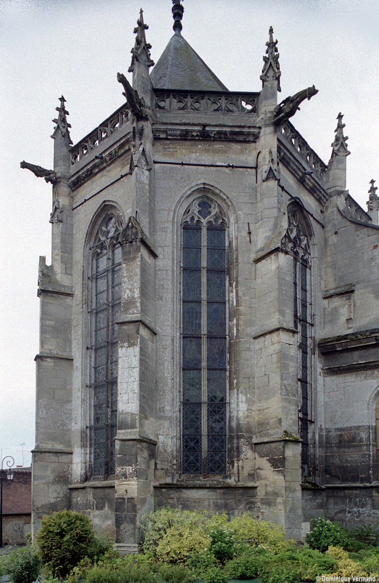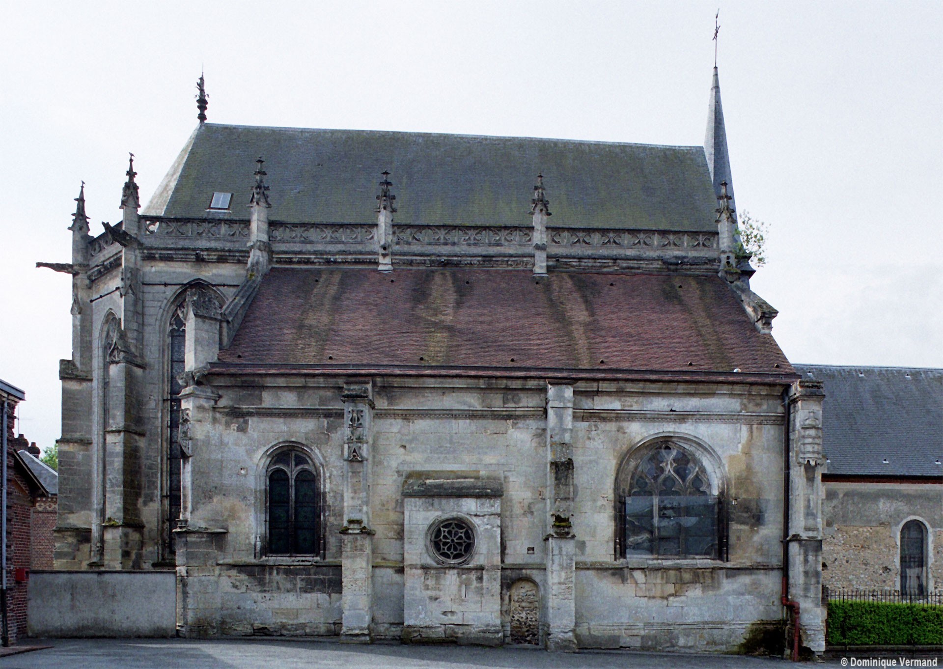 Le 16ème siècle voit la reconstruction, sur une grande échelle et en plusieurs campagnes, du choeur. La première campagne, de style gothique flamboyant, concerne les trois travées droites – dont les fenêtres hautes sont aujourd’hui bouchées -, la chapelle greffée au sud des deux premières travées et l’abside à cinq pans. La première travée n’est pas voûtée, mais les deux autres et l’abside reçoivent des voûtes ne comportant que des liernes et des tiercerons, agrémentées de clefs pendantes richement décorées dans l’abside. A l’extérieur, on appréciera le beau volume du chevet avec ses contreforts ouvragés en partie supérieure – celle-ci très restaurée cependant – et les hautes et étroites fenêtres à remplage flamboyant.