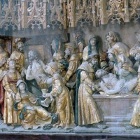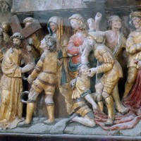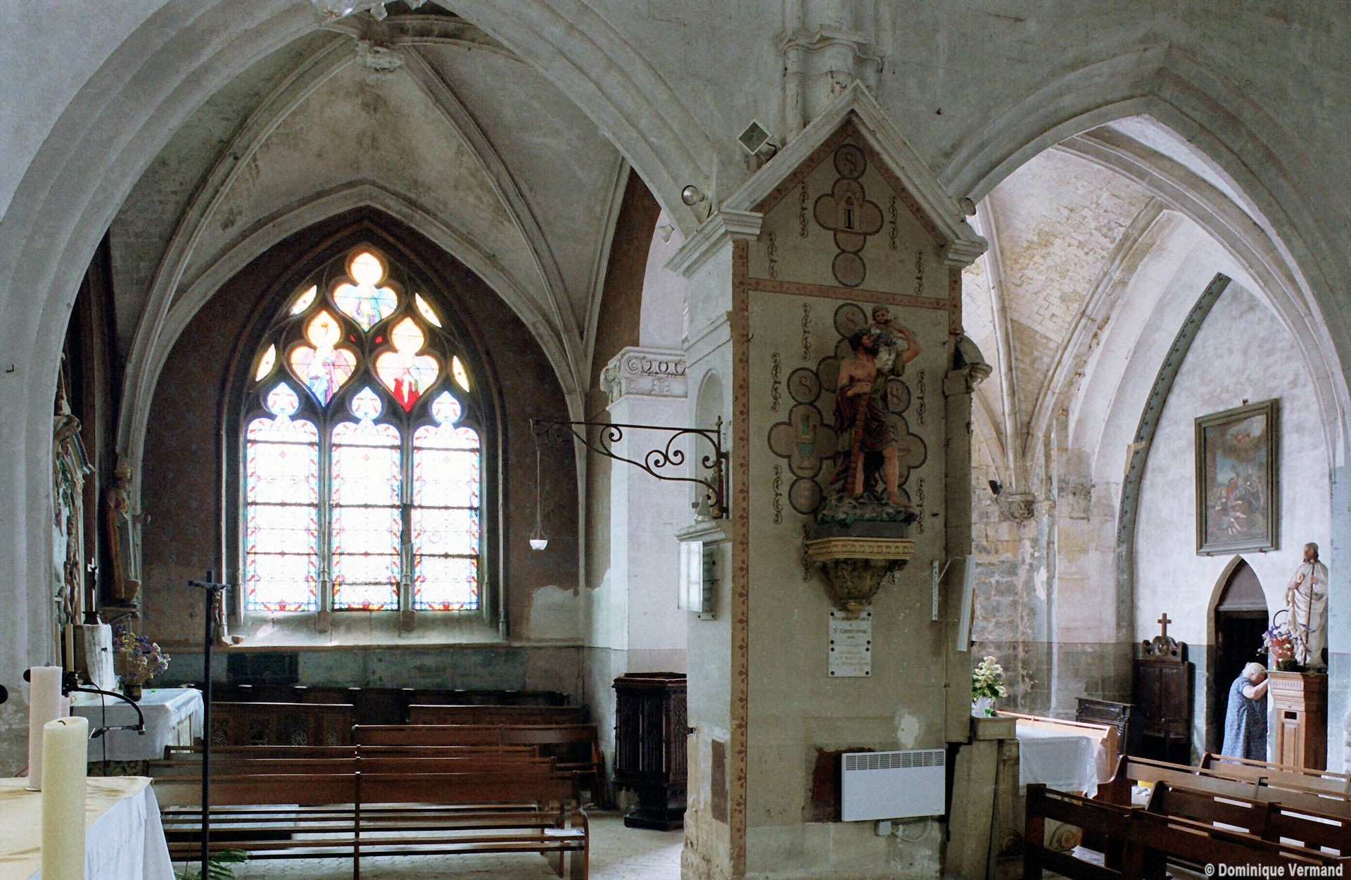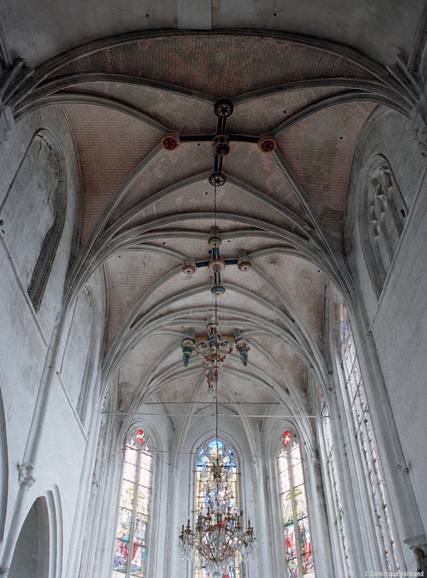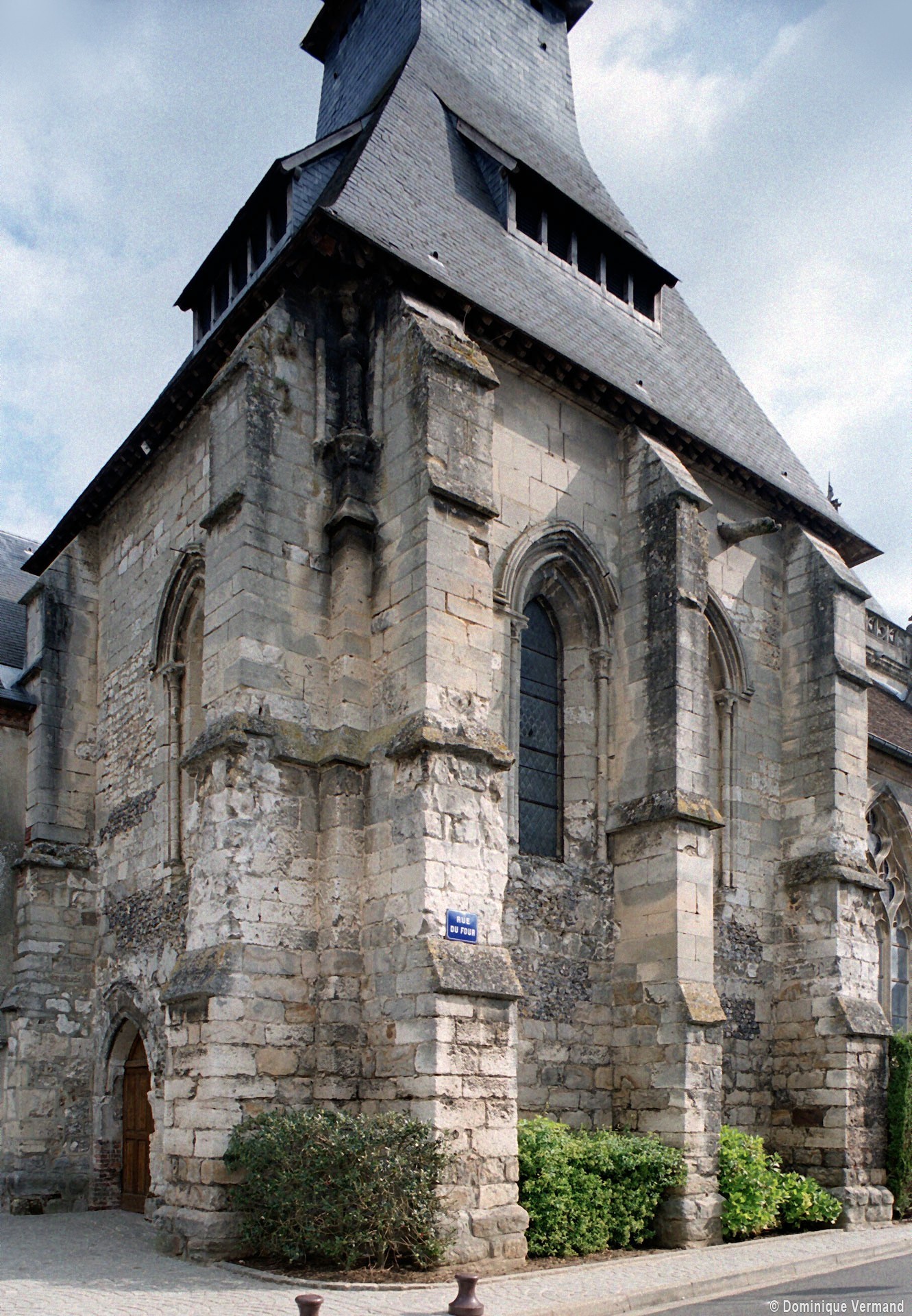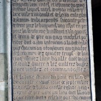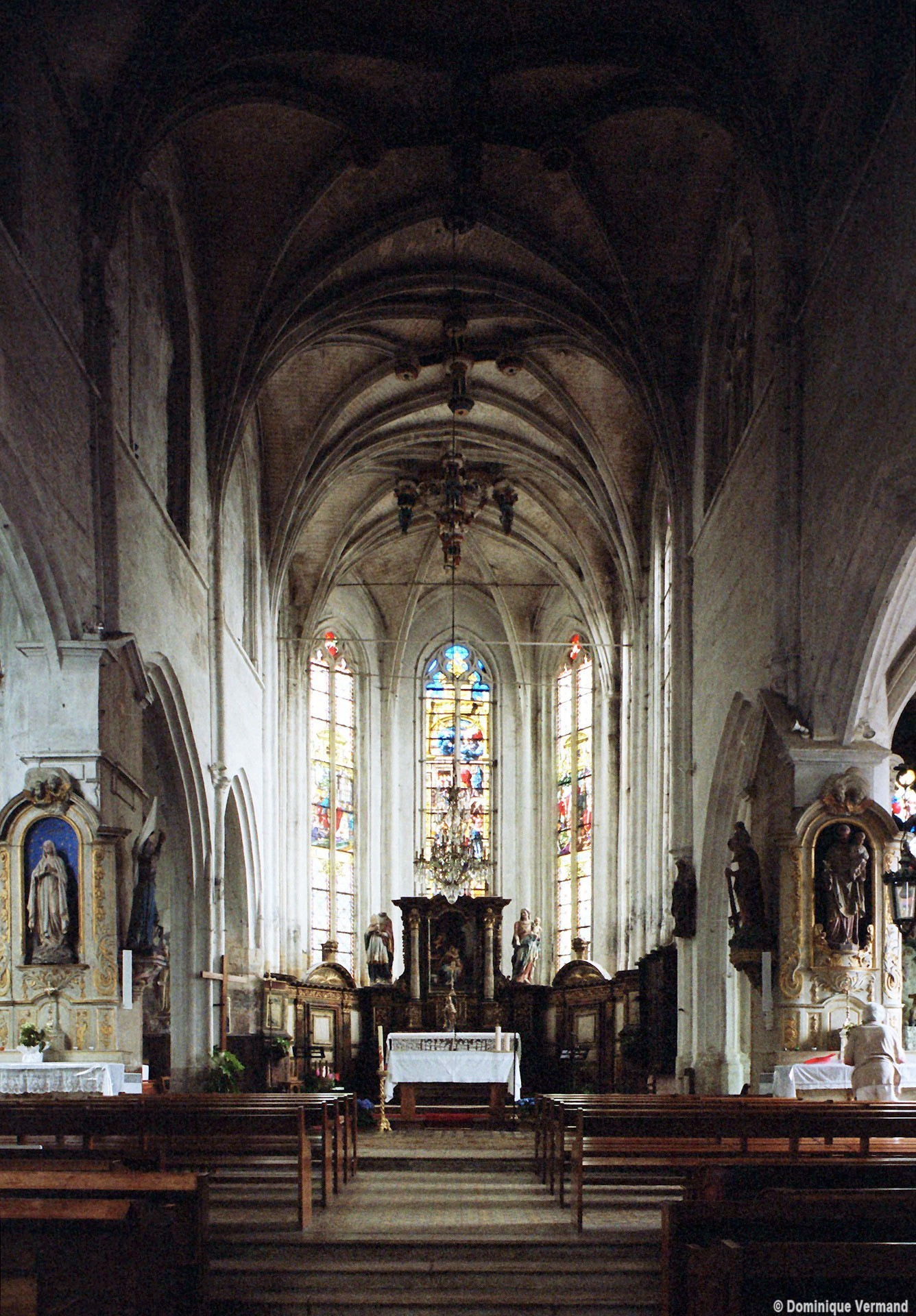 Le 16ème siècle voit la reconstruction, sur une grande échelle et en plusieurs campagnes, du choeur. La première campagne, de style gothique flamboyant, concerne les trois travées droites – dont les fenêtres hautes sont aujourd’hui bouchées -, la chapelle greffée au sud des deux premières travées et l’abside à cinq pans. La première travée n’est pas voûtée, mais les deux autres et l’abside reçoivent des voûtes ne comportant que des liernes et des tiercerons, agrémentées de clefs pendantes richement décorées dans l’abside. A l’extérieur, on appréciera le beau volume du chevet avec ses contreforts ouvragés en partie supérieure – celle-ci très restaurée cependant – et les hautes et étroites fenêtres à remplage flamboyant.