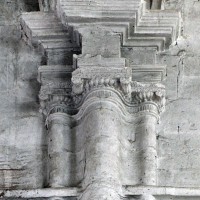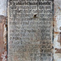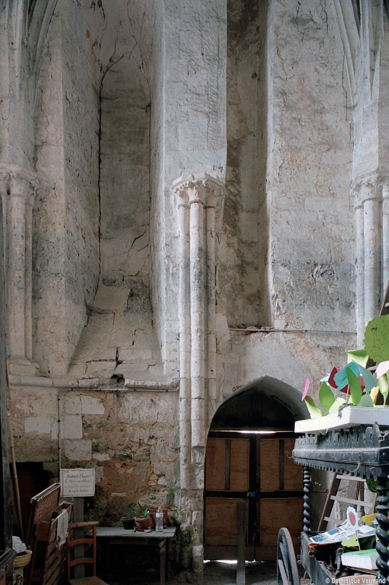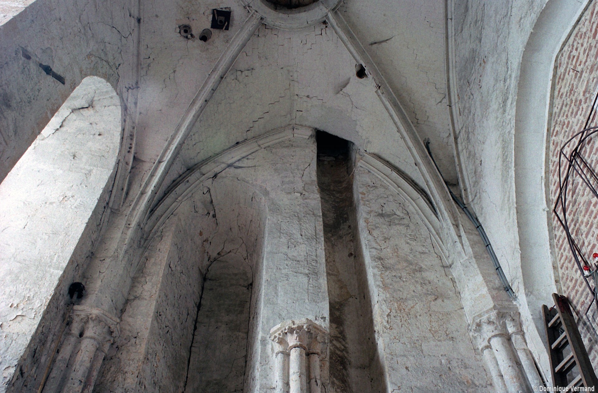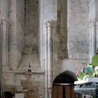 La nef est la partie la plus ancienne comme le suggère le mur nord en moellons, qui n’a cependant pas conservé d’éléments significatifs. Très remaniée, la façade montre une élégante fenêtre du milieu du 12ème siècle encadrée par deux colonnettes mais le portail et le pignon ne sont pas antérieurs aux 17ème/18ème siècles. A la fin du 12ème siècle, un imposant clocher est bâti contre le flanc sud-est de la nef. Il n’en reste aujourd’hui que la base, l’étage supérieur ayant disparu au profit d’un simple couronnement en charpente recouverte d’ardoises. C’est une construction de grande qualité comme en témoignent les hautes fenêtres encadrées de colonnettes et dont l’archivolte présente une riche mouluration. Des puissants contreforts à quatre larmiers l’épaule aux angles. L’intérieur a reçu une nouvelle voûte au 16ème siècle. La disposition des colonnettes et chapiteaux du 12ème siècle encore conservés suggère l’existence, à l’origine, d’une voûte sexpartite ou octopartite, avec formerets.