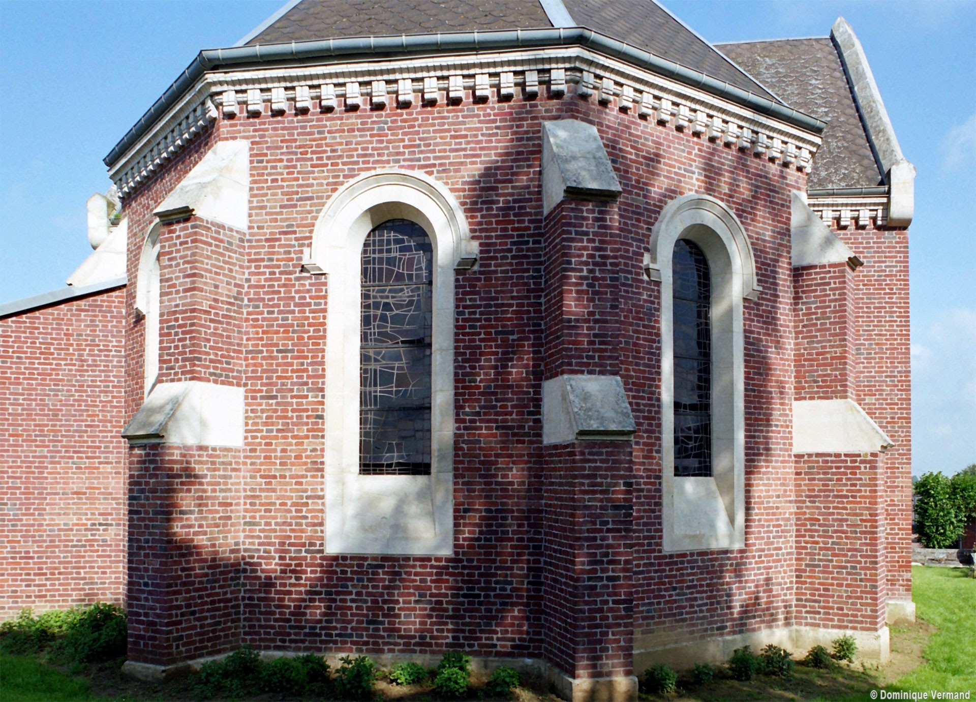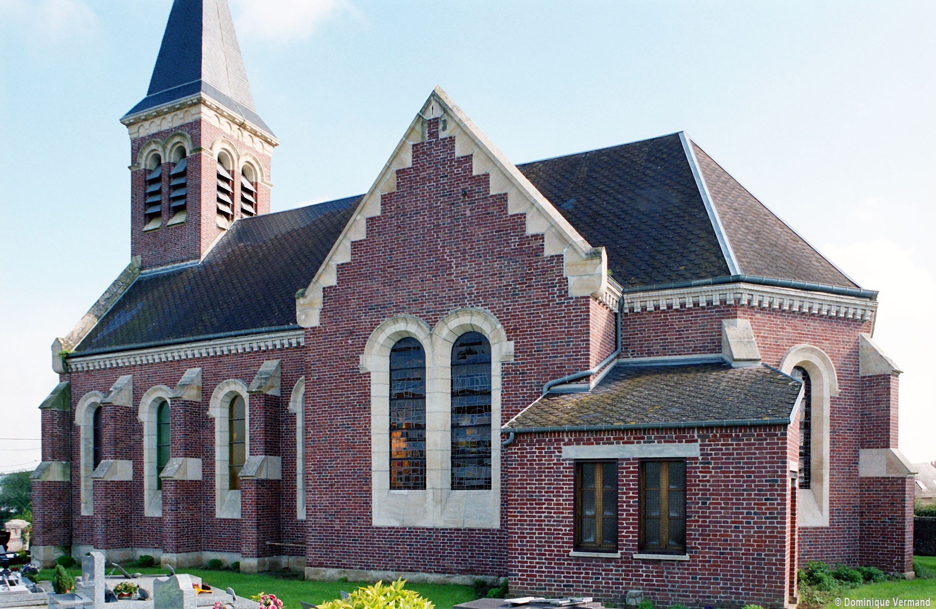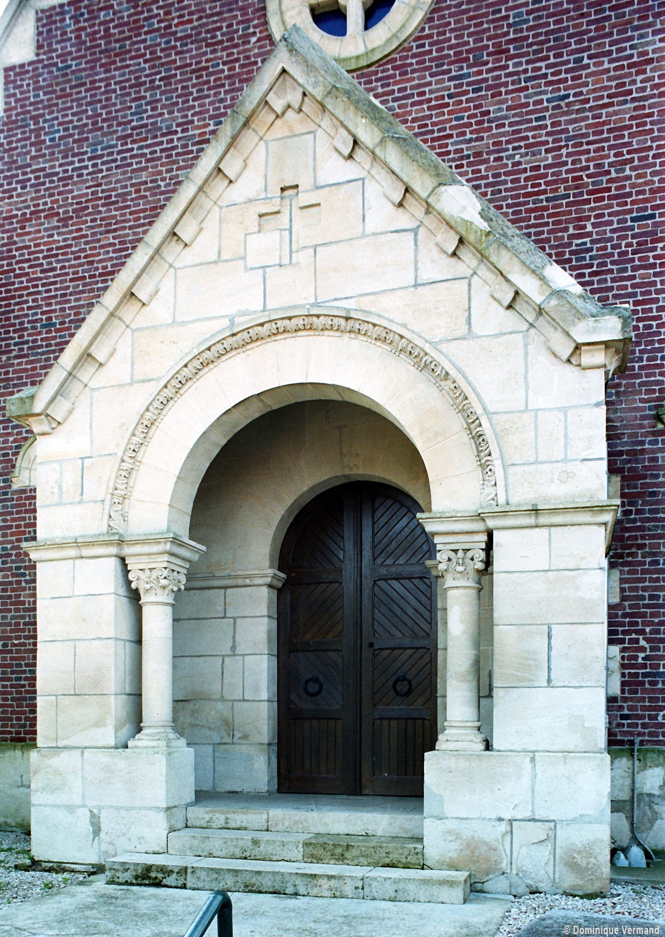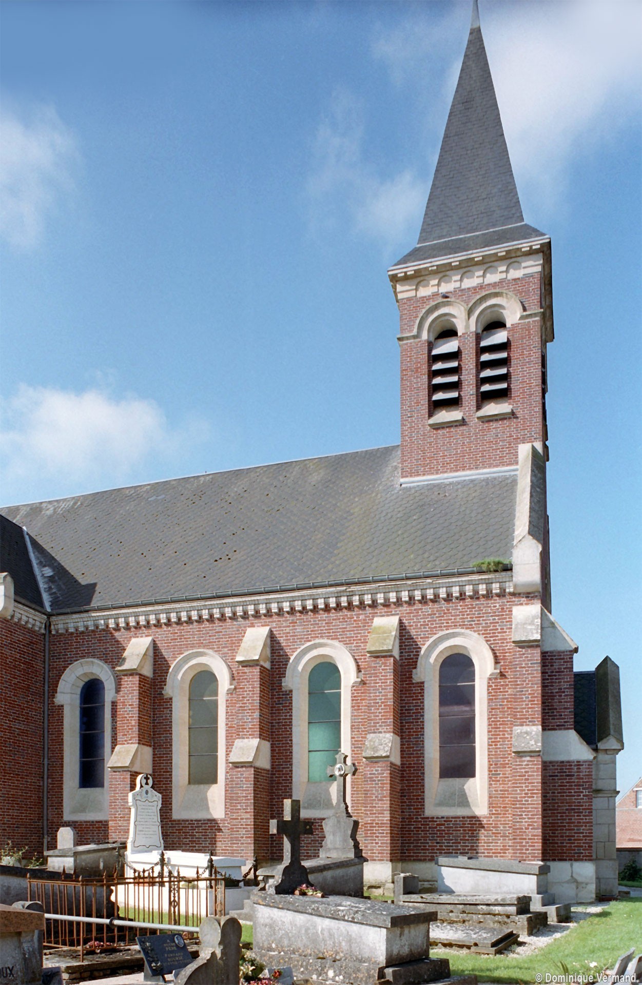 Saint-Jean-Baptiste a été reconstruite dans les années 1920 après sa destruction totale durant la Guerre 14-18, dernière des tragédies incessantes qui ont marqué cette partie de la Picardie depuis la Guerre de Cent ans. Edifié en briques et pierre – cette dernière réservée aux ouvertures, corniches et larmiers des contreforts -, c’est un édifice sans grande originalité s’inspirant, comme beaucoup, du style néo-roman.