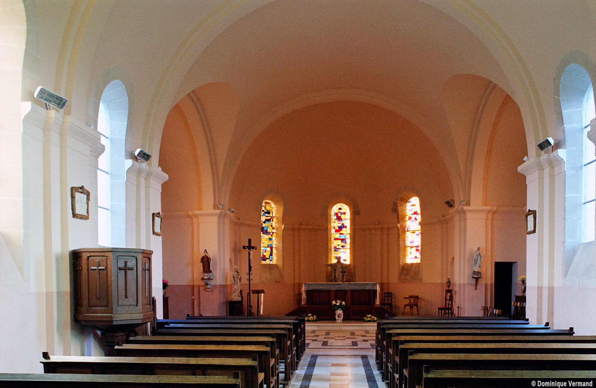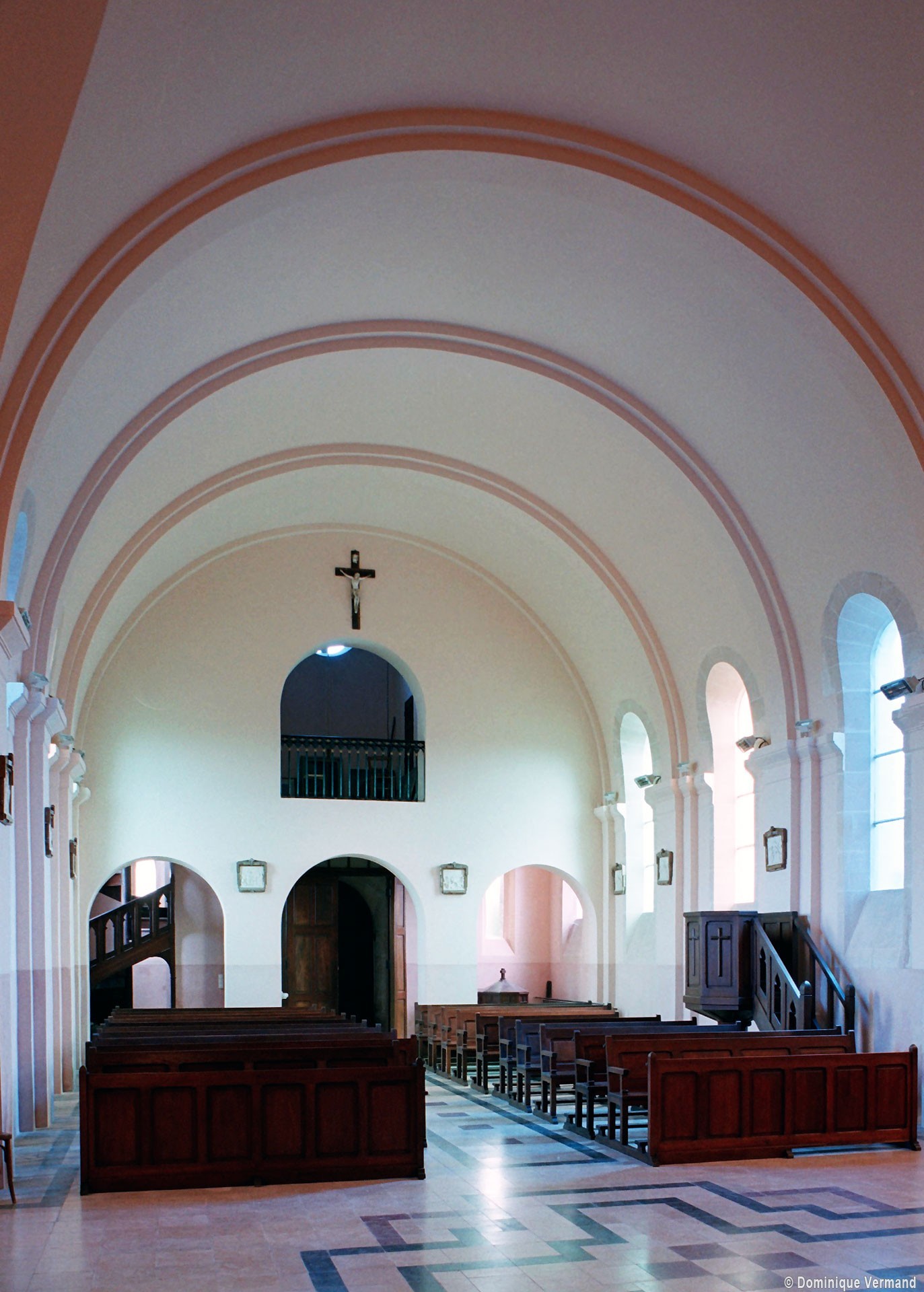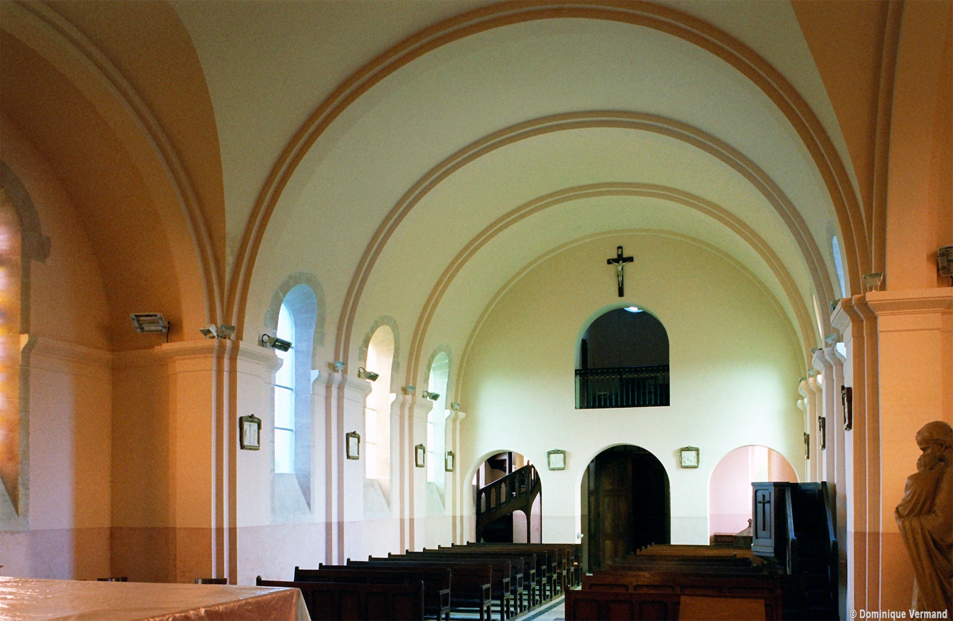 Son plan est aussi des plus classiques : une nef unique de trois travées, un transept saillant et une abside pentagonale. La nef et les croisillons reçoivent des voûtes en berceau et l’abside une voûte en cul-de-four. La nef est précédée par l’incontournable massif de façade avec tribune et clocher. Au rez-de-chaussée, trois arcades correspondent au baptistère, à l’accès à la nef et à celui à la tribune. A l’extérieur, la voussure du portail en plein cintre est reçue sur deux colonnettes indépendantes. Elle est surmontée d’un gâble et l’ensemble, légèrement détaché du mur de façade, forme un petit porche (2008).