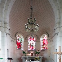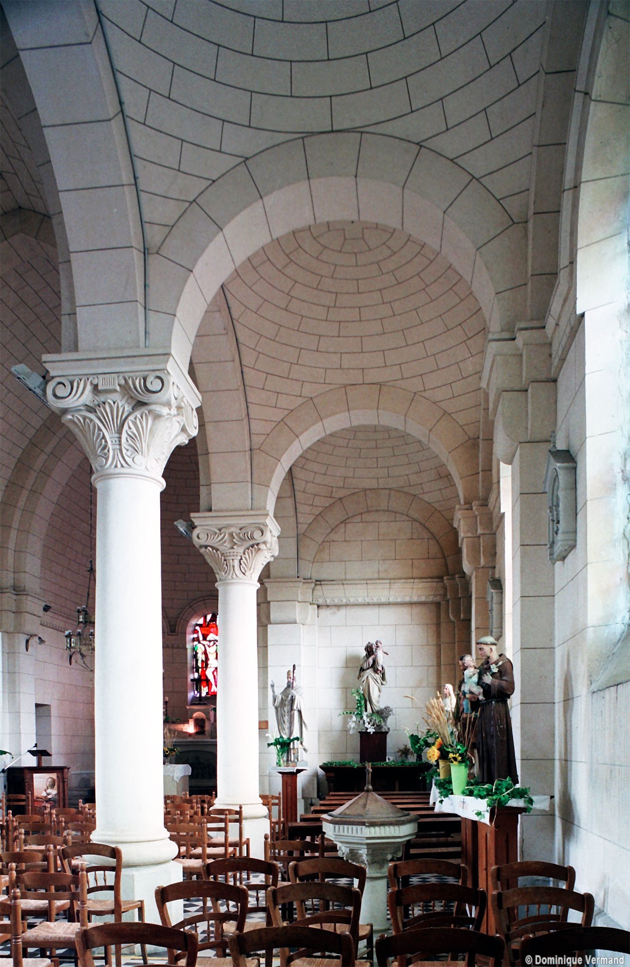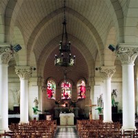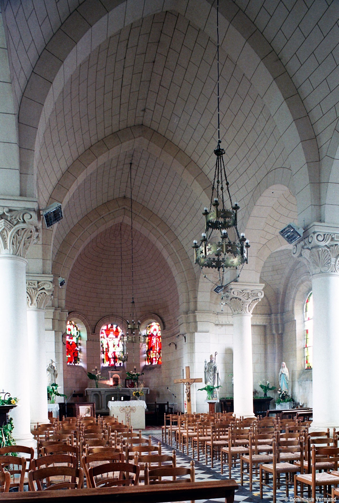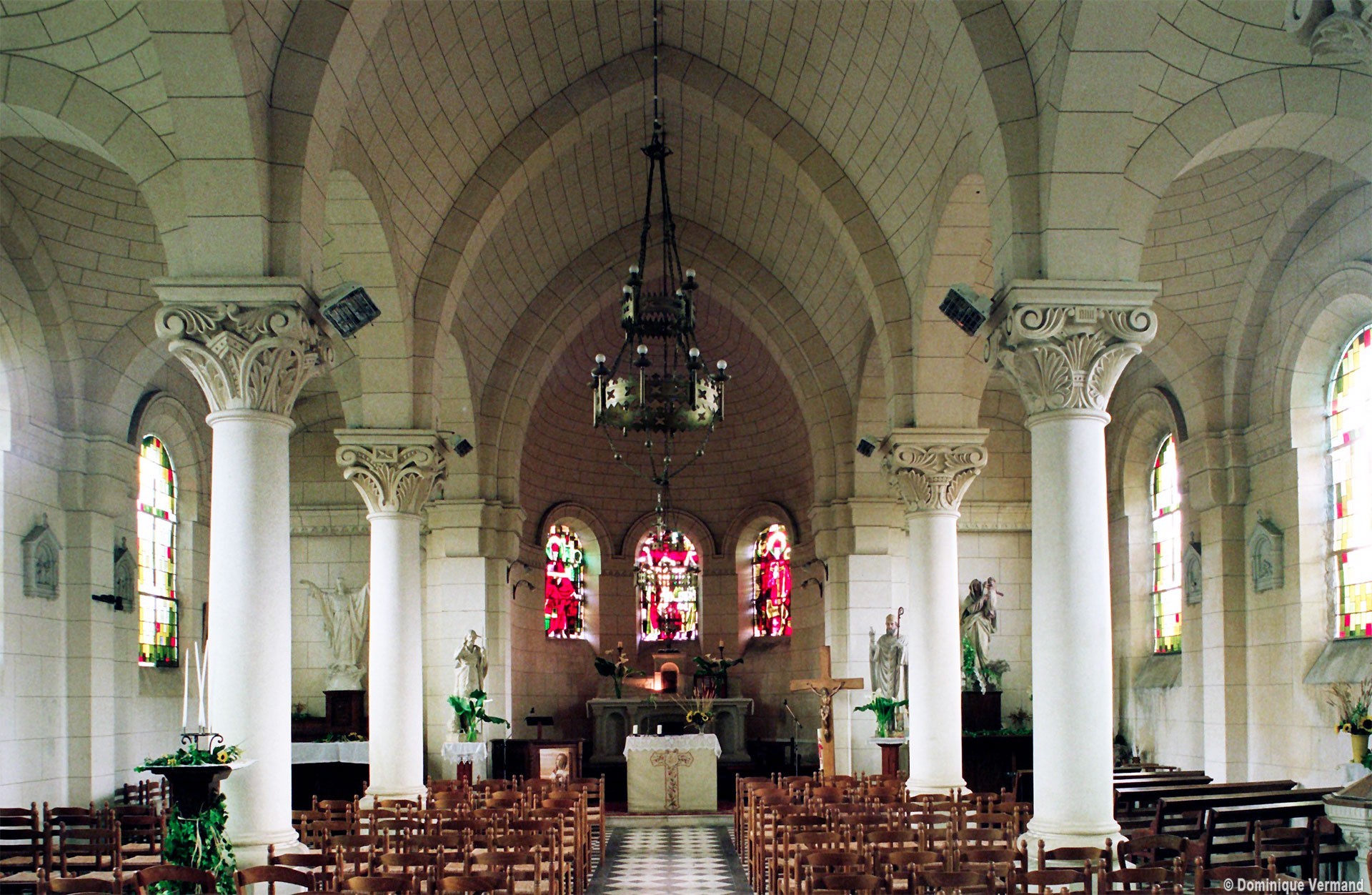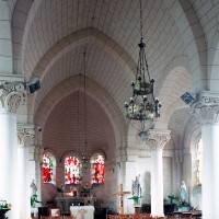 A l’intérieur, les quatre travées de la nef sont couvertes d’une voûte en berceau brisée pour la partie centrale et de petites coupoles pour les bas-côtés. Grâce aux piles circulaires qui les reçoivent, l’ensemble forme un espace très ouvert. Le choeur est couvert, pour sa part, d’un cul-de-four et ses trois fenêtres sont garnies de vitraux des années 1950 comparables à ceux de Larbroye (2008).