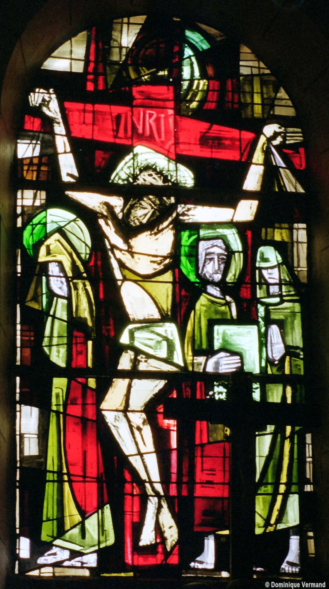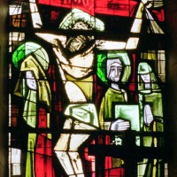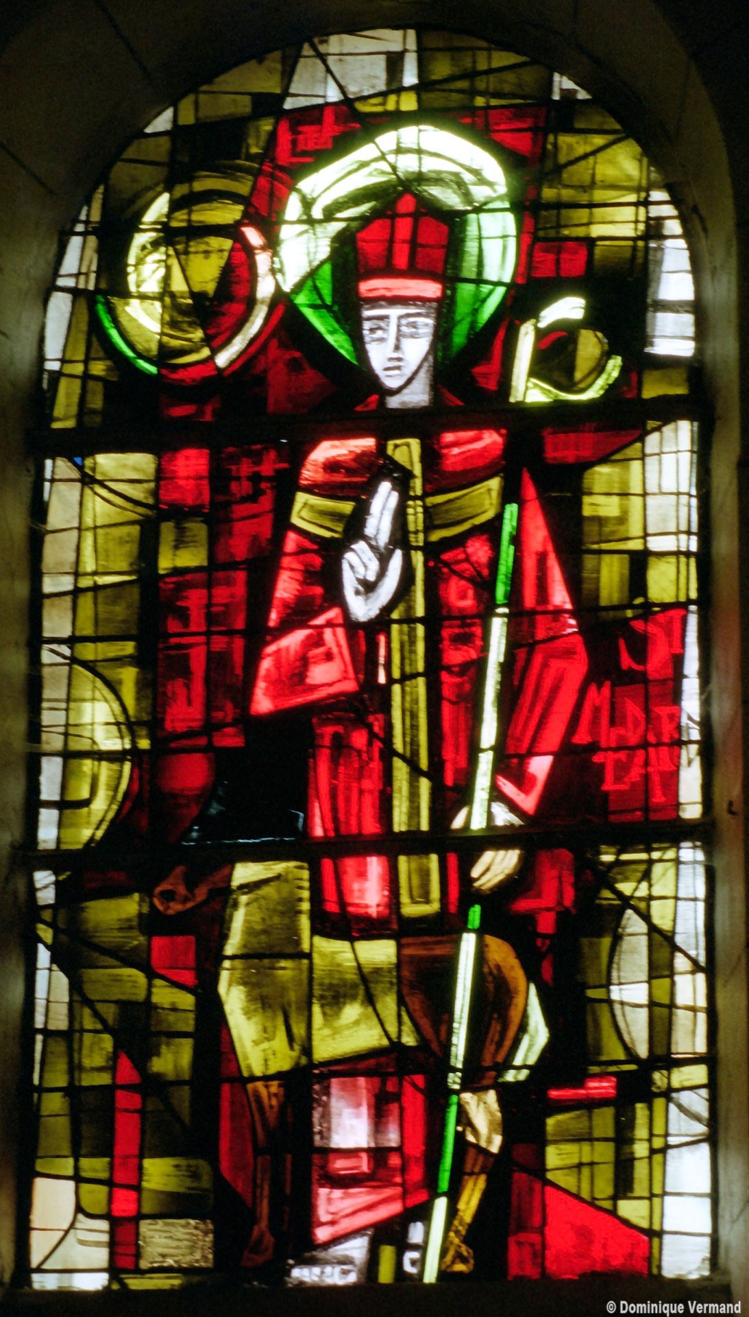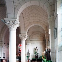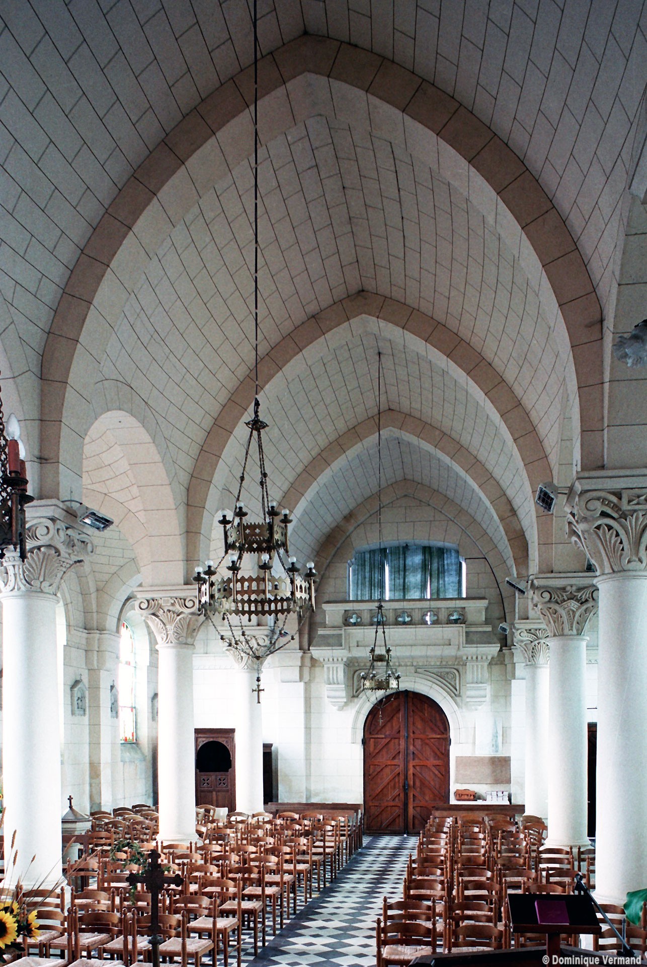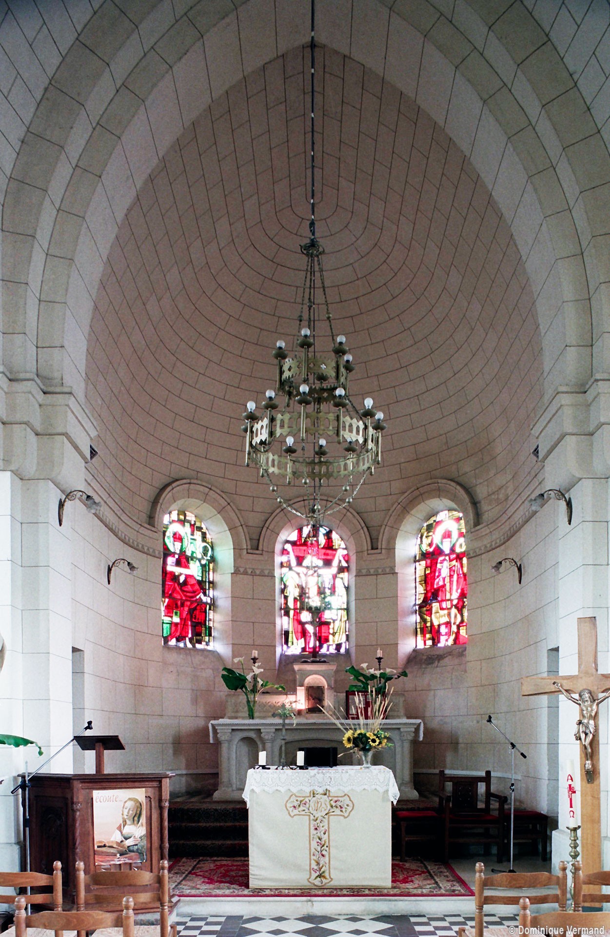 A l’intérieur, les quatre travées de la nef sont couvertes d’une voûte en berceau brisée pour la partie centrale et de petites coupoles pour les bas-côtés. Grâce aux piles circulaires qui les reçoivent, l’ensemble forme un espace très ouvert. Le choeur est couvert, pour sa part, d’un cul-de-four et ses trois fenêtres sont garnies de vitraux des années 1950 comparables à ceux de Larbroye (2008).