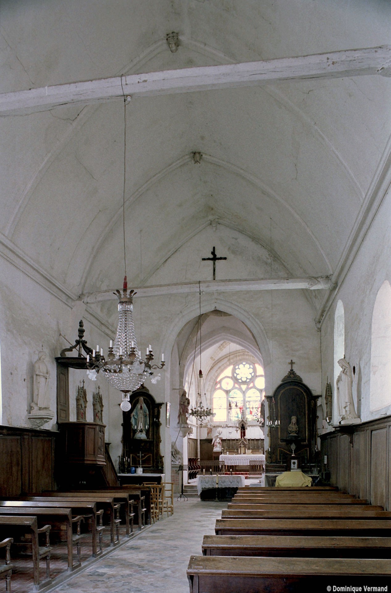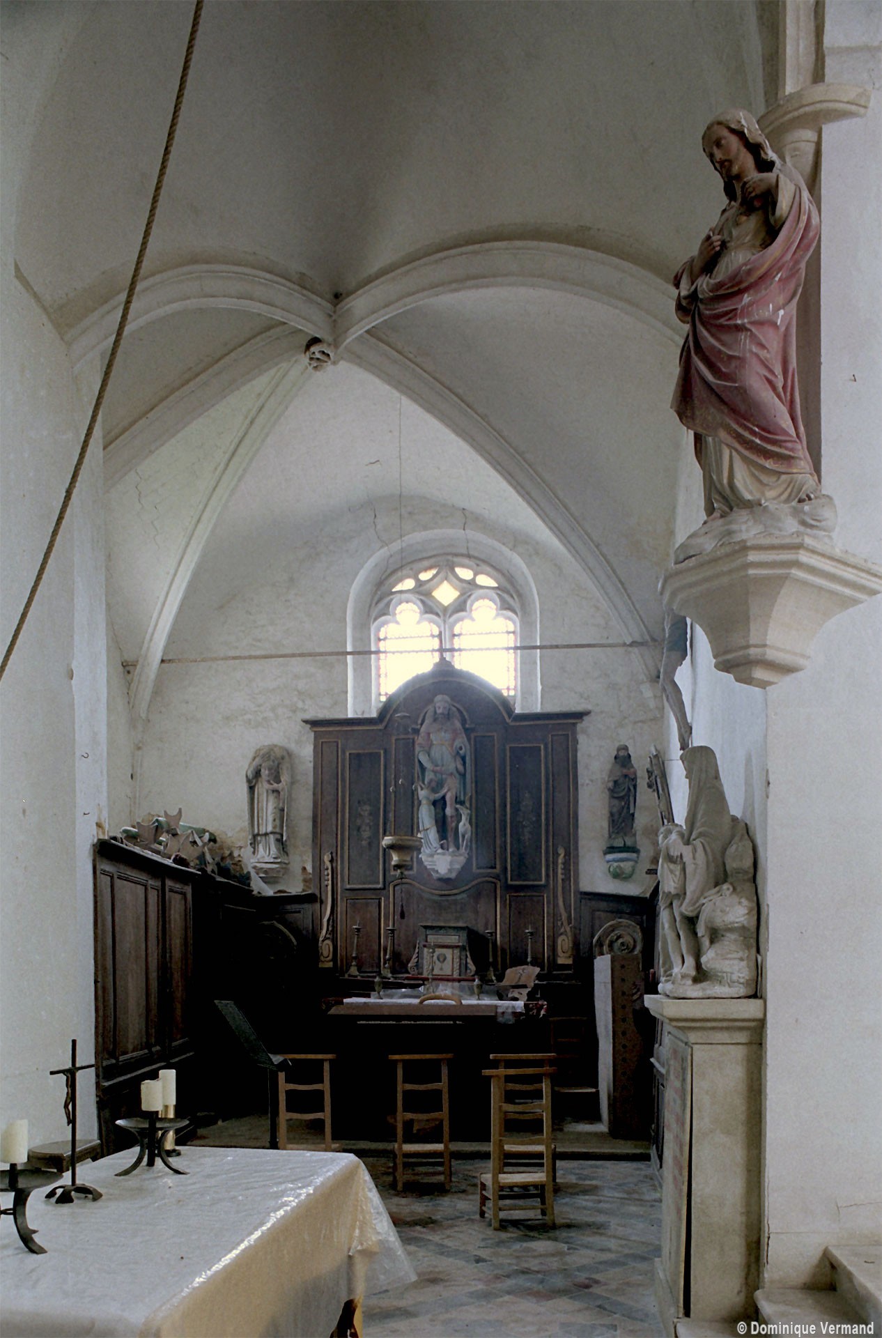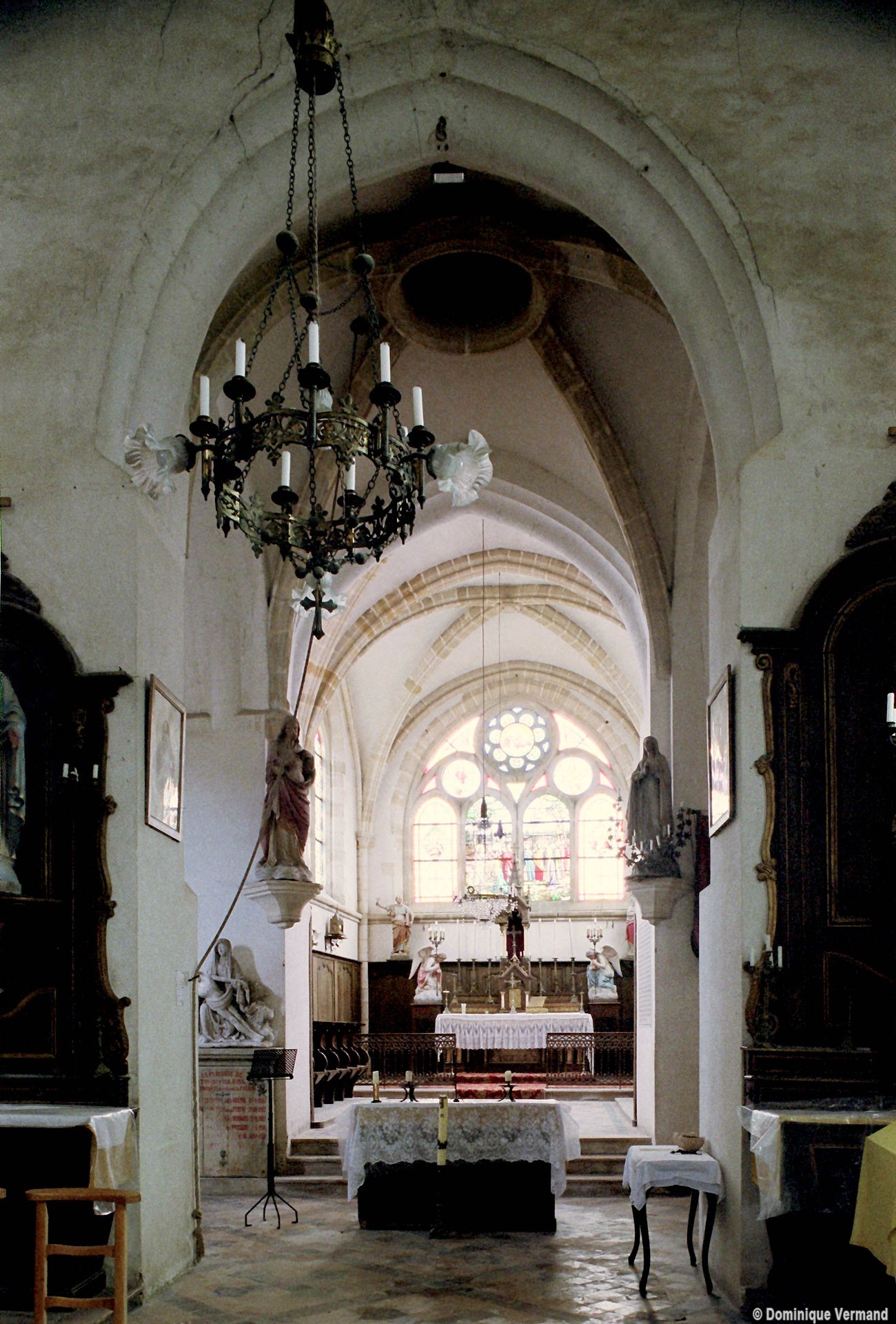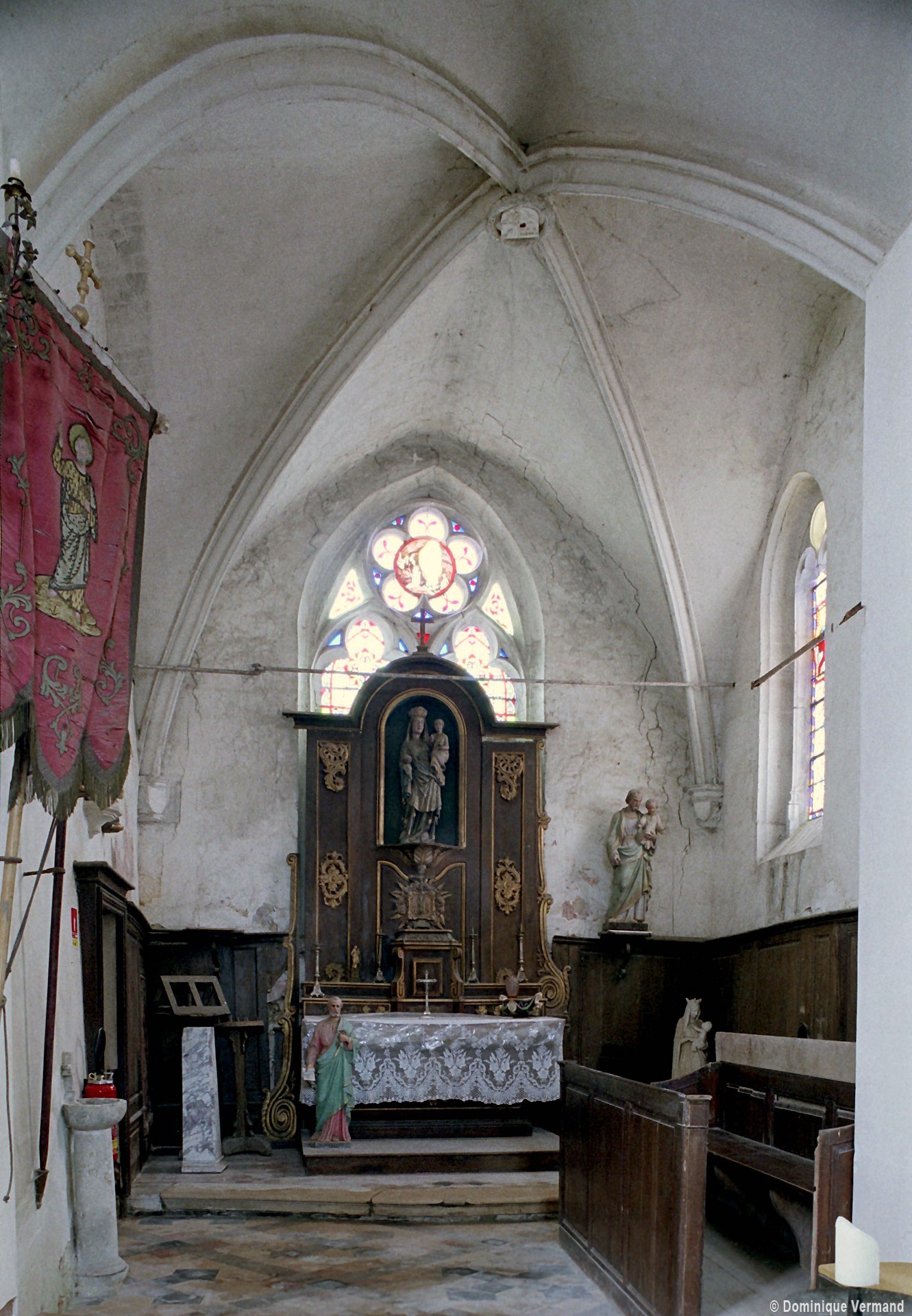 A une nef en silex d’origine ancienne – comme l’atteste une petite porte en plein cintre au nord – mais souvent réparée est venu s’ajouter, au début du 13ème siècle, un chœur de deux travées à chevet plat. Si les chapiteaux à crochets ou feuilles découpées ne laissent aucun doute sur la date de sa construction, une restauration effectuée à la fin du 19ème siècle l’a malheureusement privé de tout caractère d’authenticité comme on peut le voir notamment dans les fenêtres, refaites dans un style plus tardif.