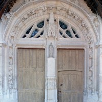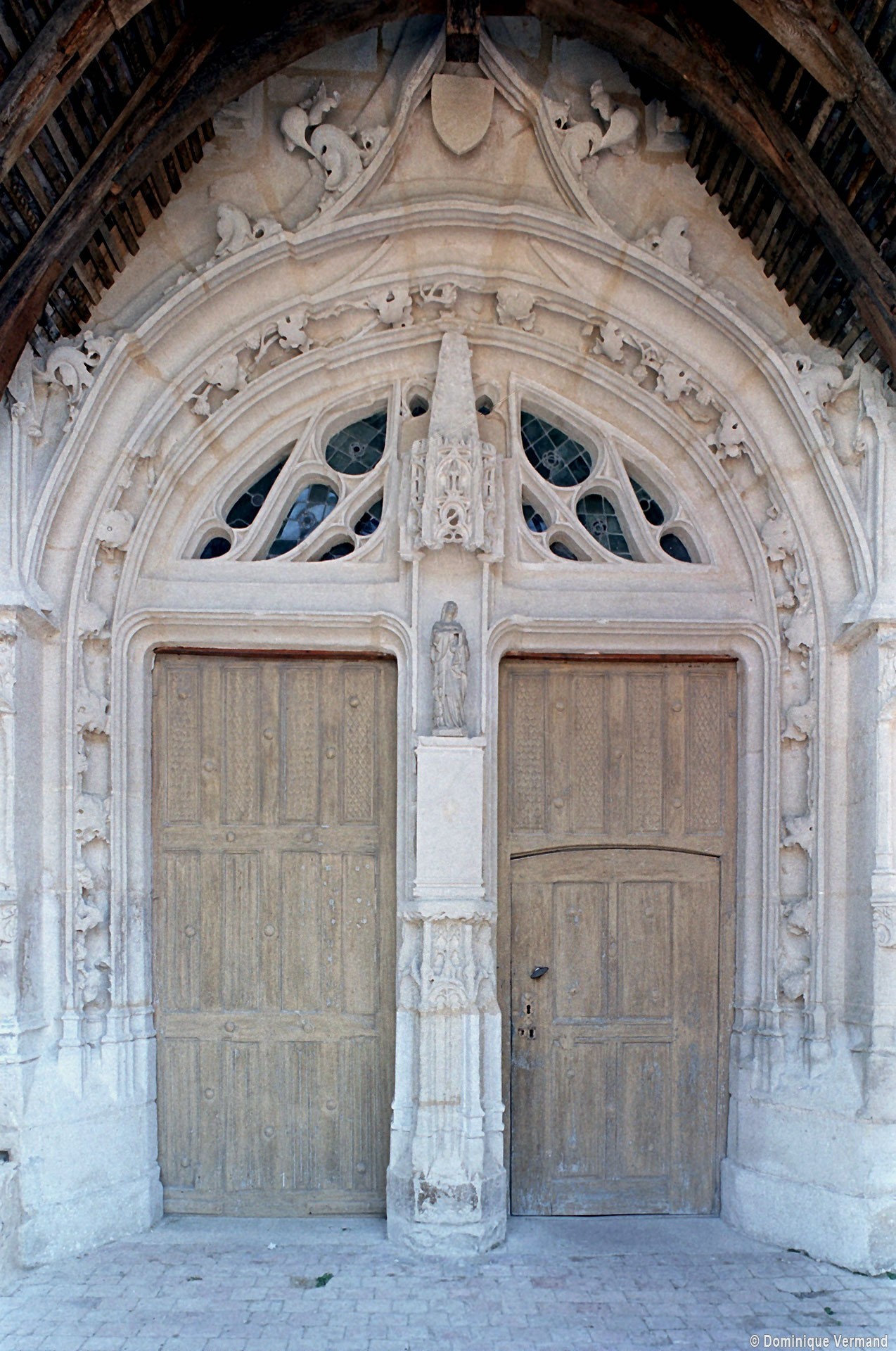 Masquée en partie par un petit porche de peu postérieur, cette façade montre une très belle composition qui n’est pas sans rappeler, mais en plus simple, celle de Boubiers. Le portail est divisé par un trumeau et son tympan est ajouré d’un réseau flamboyant. Deux piédroits, fortement saillants et comportant des niches aujourd’hui vierges de leur statue, l’encadre. Ils s’amortissent en pinacles qui viennent mordre sur le pignon, décoré de crochets sur les arêtes et percé d’une fenêtre au réseau flamboyant.