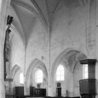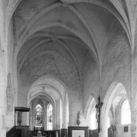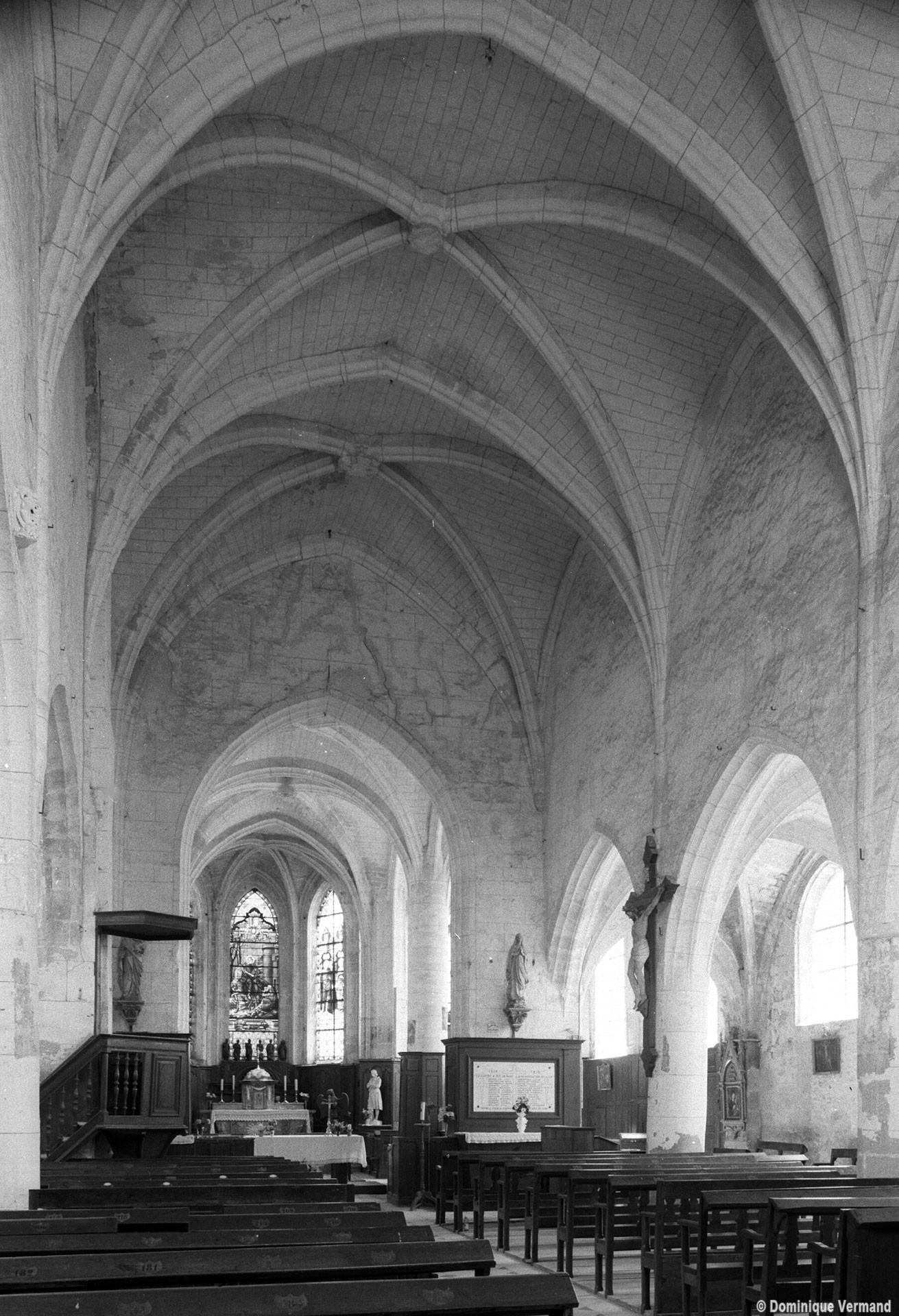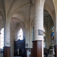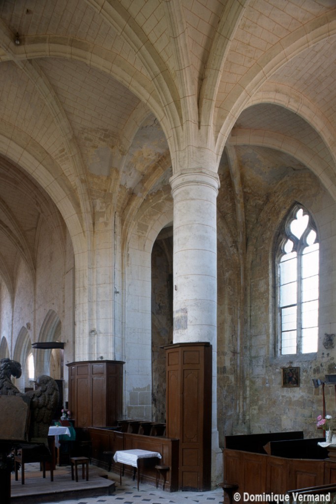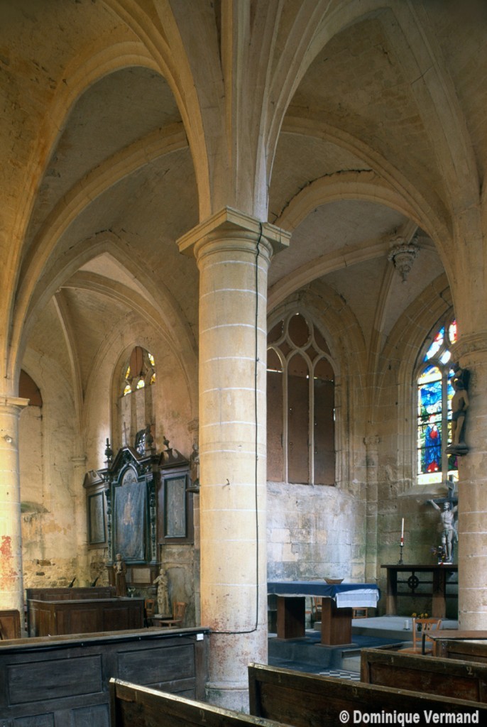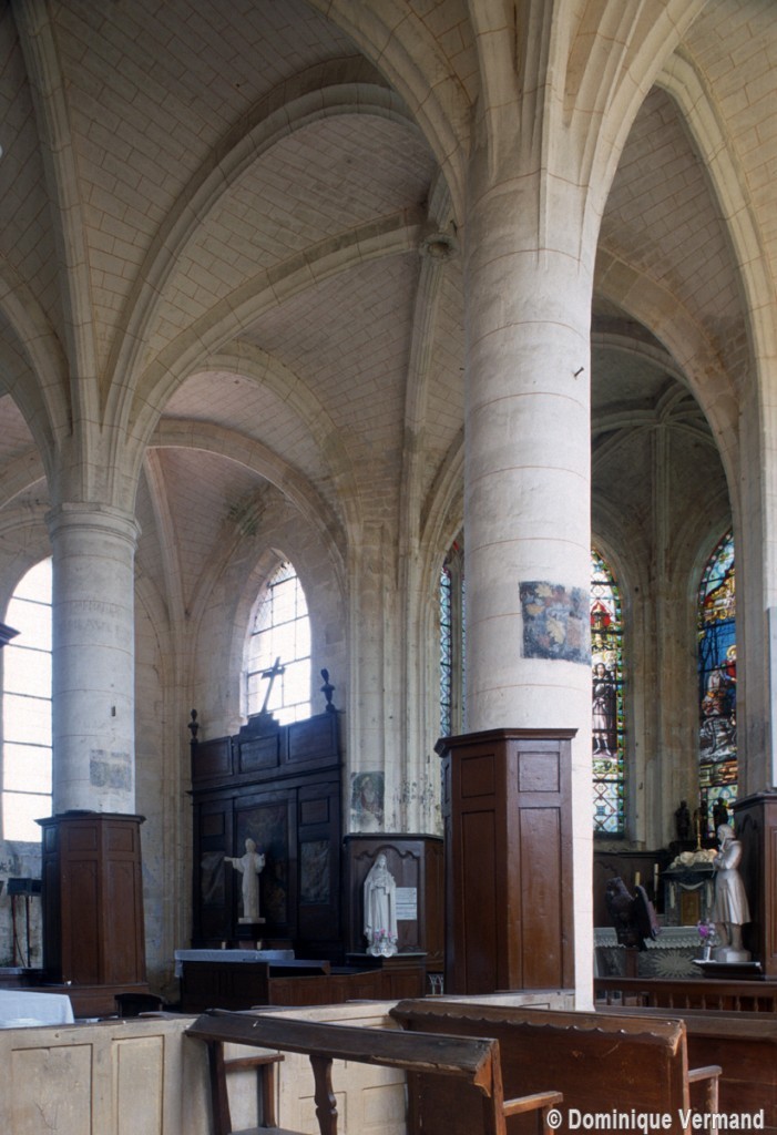 Le choeur-halle forme un ample volume et ses huit voûtes sont reçues vers le centre sur deux piles circulaires où se voient deux panneaux peints représentant des apôtres. En périphérie, les retombées se font sur des colonnettes à profil prismatique. Ce parti de choeur-halle se retrouve notamment à Cuvergnon et à Rouvres. On regrettera que la plupart des fenêtres aient perdu leur remplage, qui n’a subsisté qu’à quatre d’entre elles, où il est flamboyant. L’abside, couverte d’une unique voûte à six compartiments, est éclairée par de grandes fenêtres garnies de vitraux du 19ème siècle.