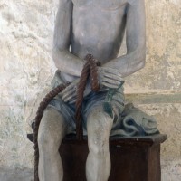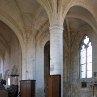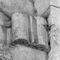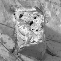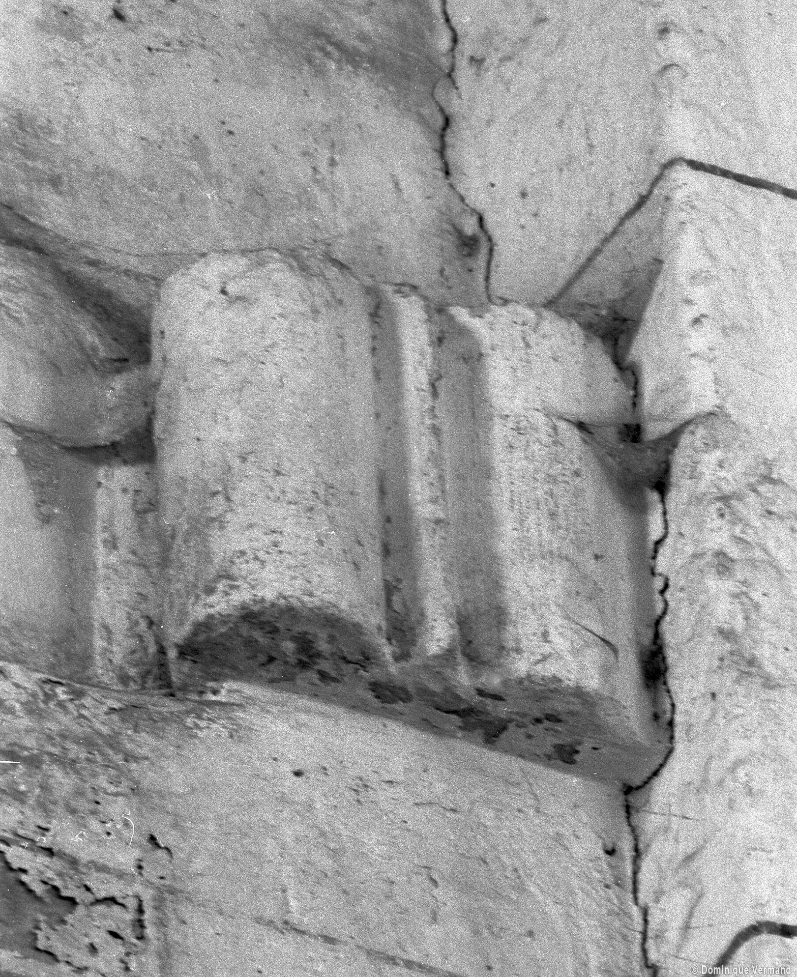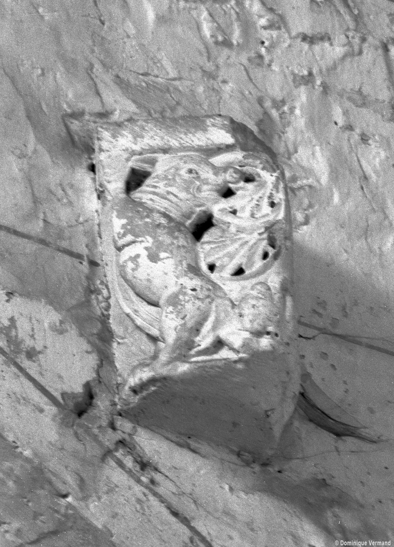 Un chapiteau décoré de deux chiens (ou loups ?) affrontés symétriquement et de feuilles d’acanthes a été remployé dans les maçonneries du mur gouttereau nord de la seconde travée. Il remonte au milieu du 12ème siècle et peut provenir de l’église précédente.