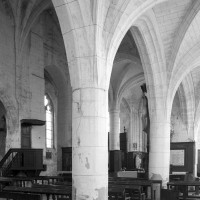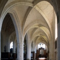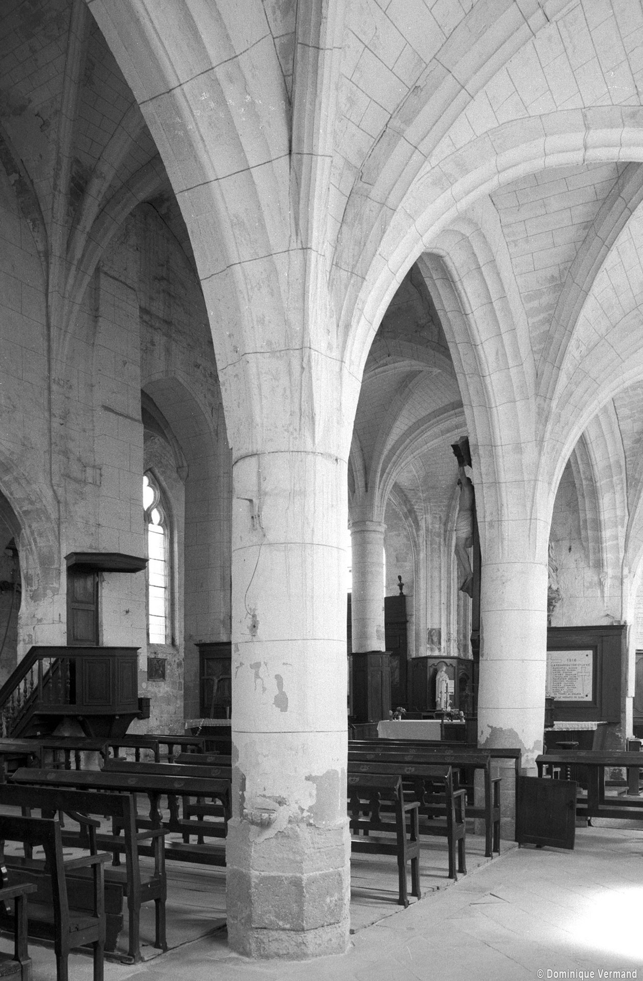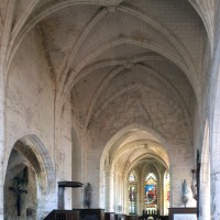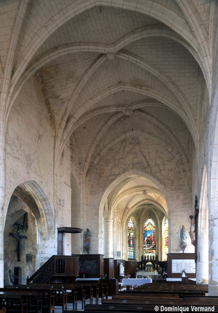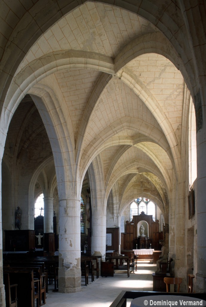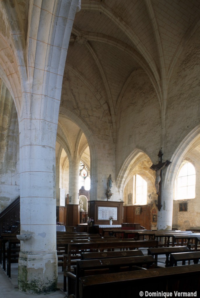 Son plan comprend une nef de quatre travées avec bas-côtés, un choeur-halle et une abside à cinq pans. Le clocher repose sur la dernière travée du bas-côté nord. Comme souvent à cette époque, la nef est aveugle, l’éclairage étant dévolu aux grandes fenêtres ouvertes dans les collatéraux. Les nervures de la voûte, à profil prismatique, viennent se fondre dans une demi-colonne à peine saillante qui disparaît au droit des piles circulaires recevant les arcades, elles aussi à mouluration prismatique. Les clefs sont armoriées.