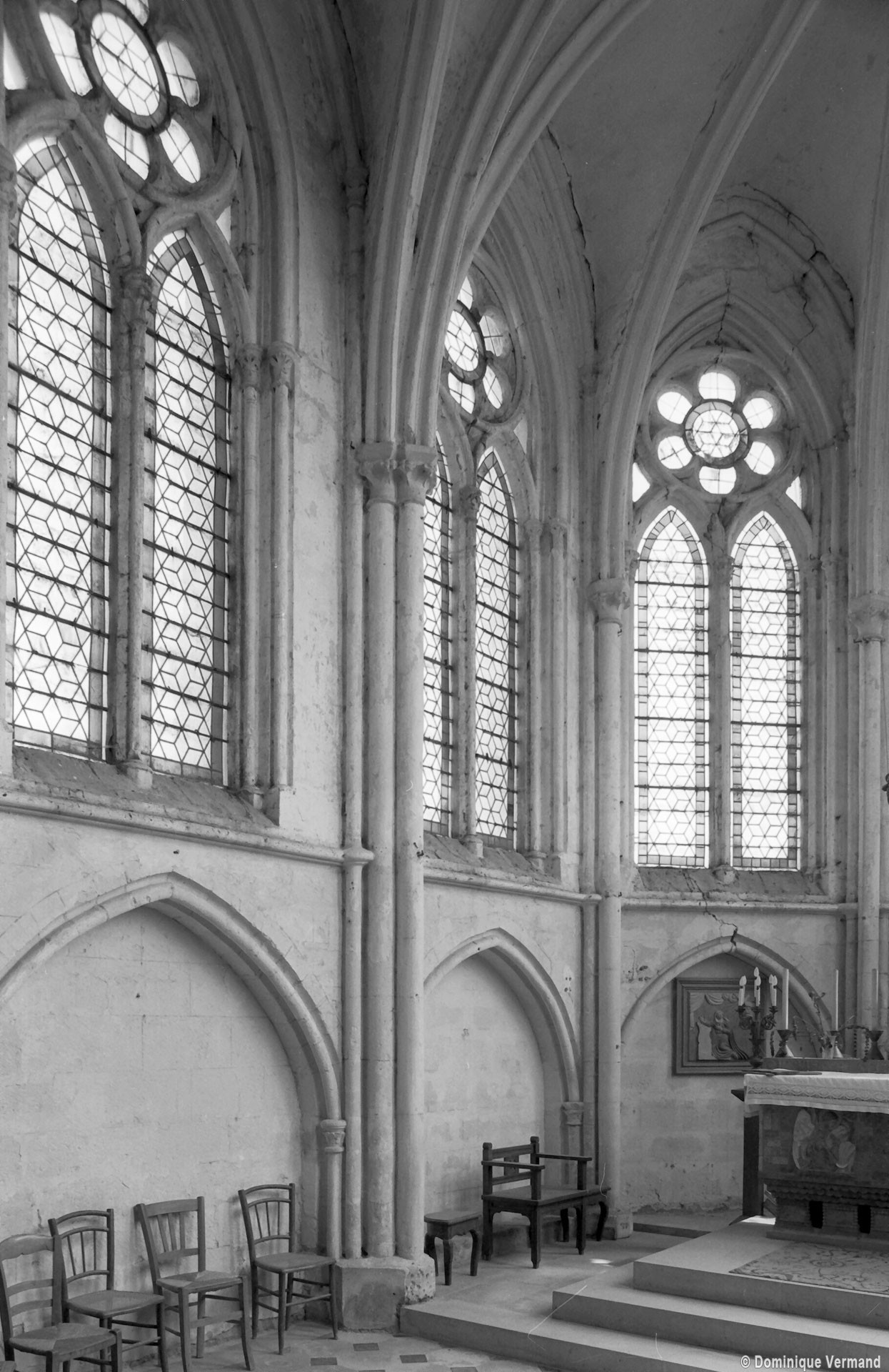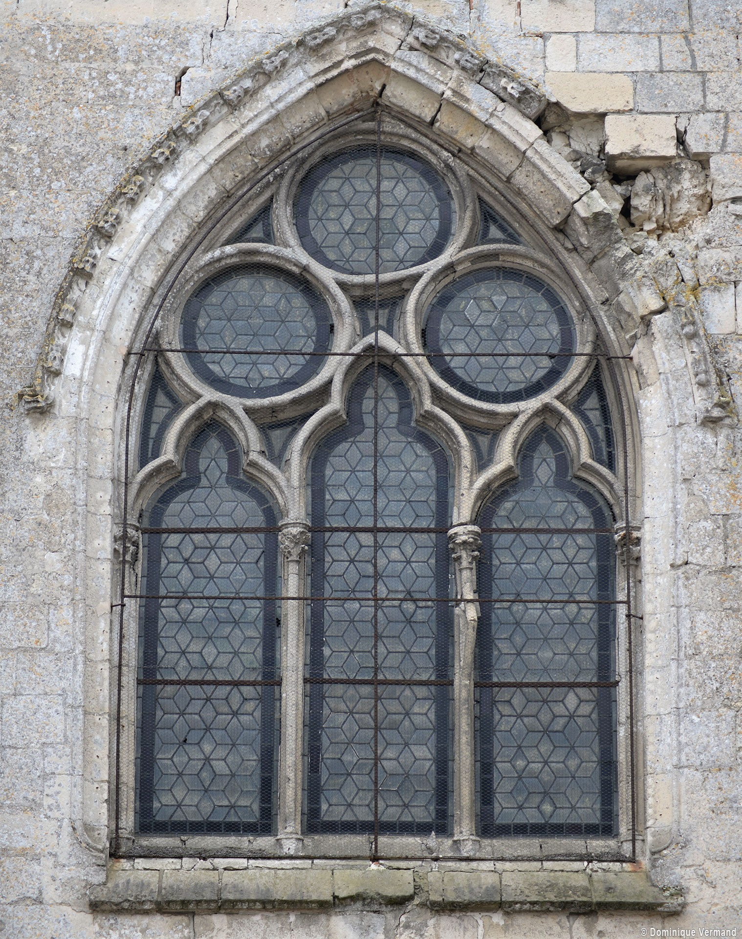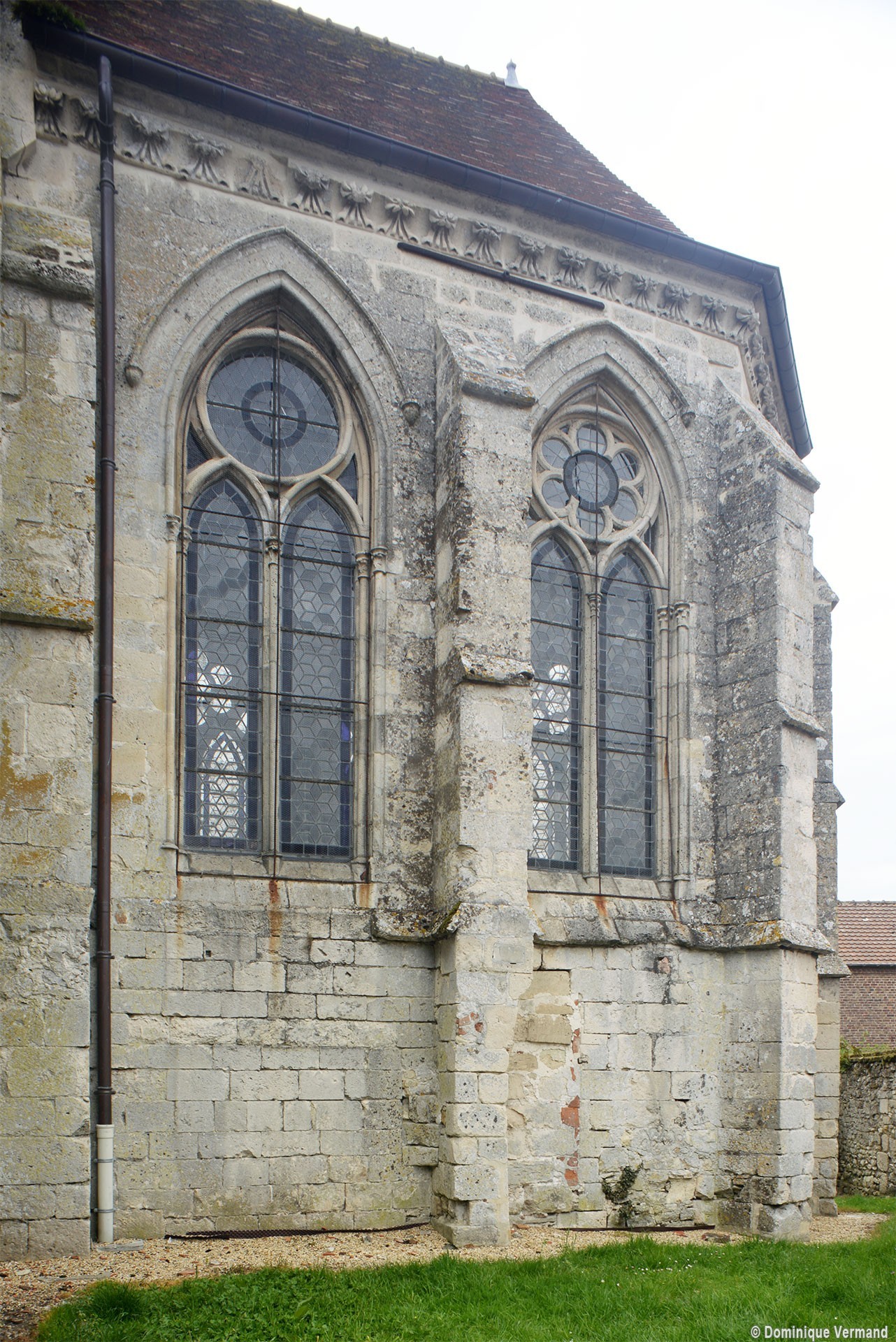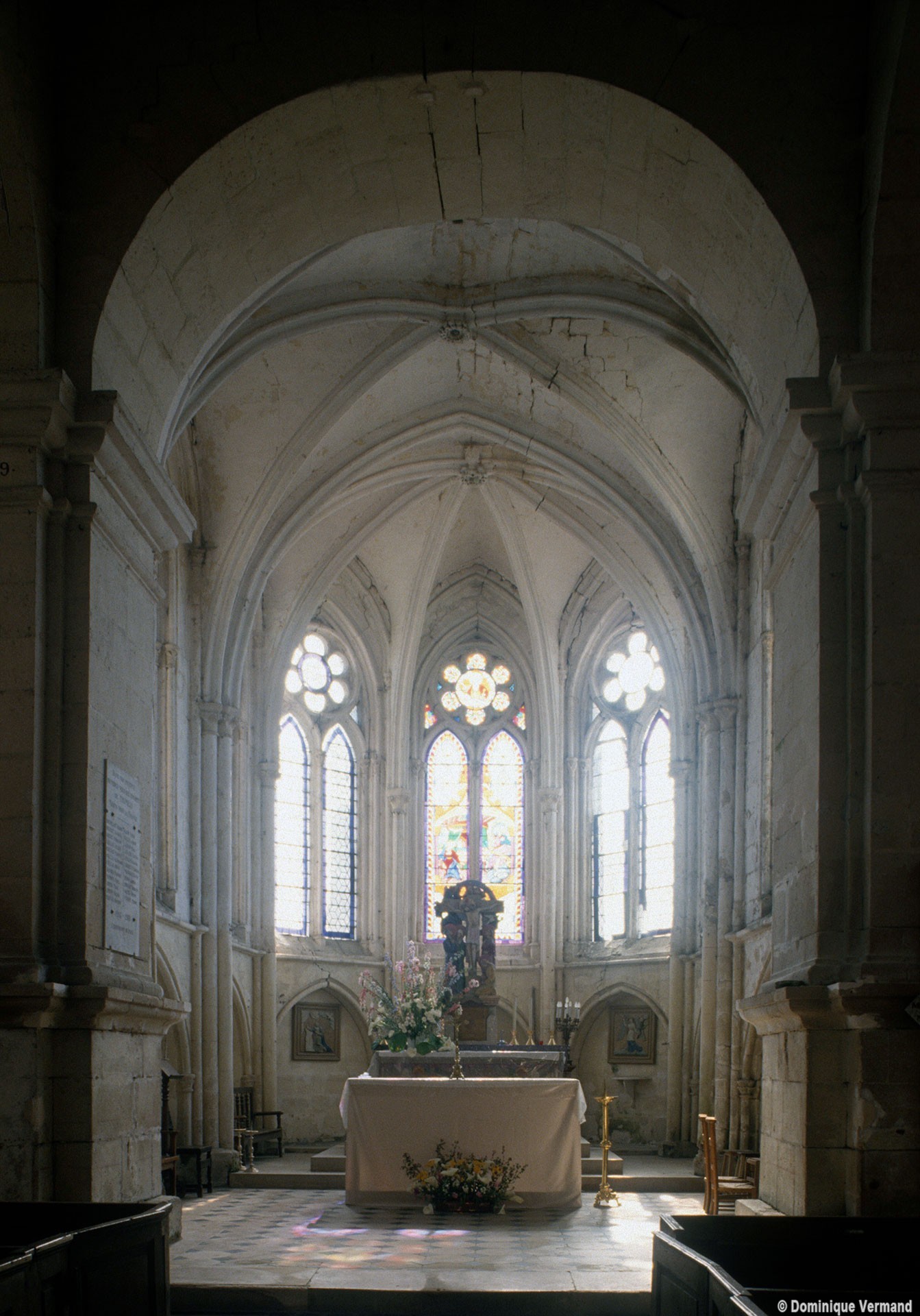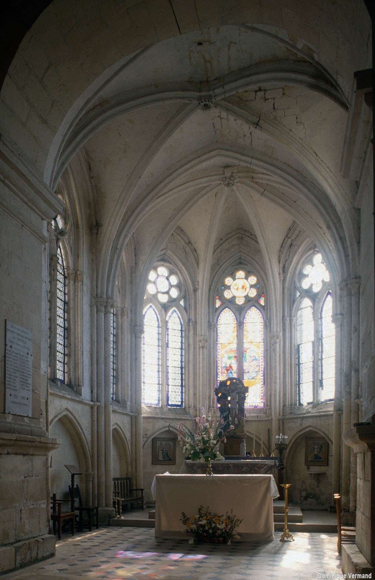 C’est au milieu du 13ème siècle que l’église fut dotée d’un nouveau choeur qui, malgré ses dimensions modestes, est une oeuvre architecturale élégante et raffinée, bien représentative de la période dite “rayonnante” qui caractérise le gothique à partir des années 1230. Constitué d’une travée droite et d’une abside à cinq pans, il est largement ajouré de fenêtres composées de deux lancettes surmontées d’une rose à six lobes, qui prennent appui sur un soubassement animé d’arcatures aveugles en arc brisé. Par sa conception et la qualité de son exécution, ce choeur s’inscrit donc dans le courant architectural le plus novateur qui accompagne le règne de saint Louis.