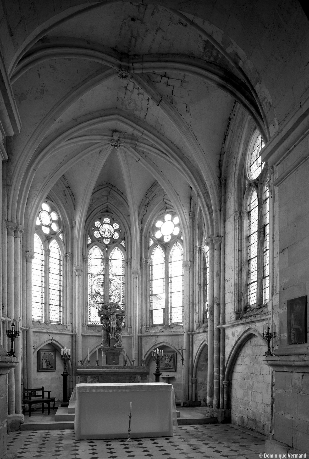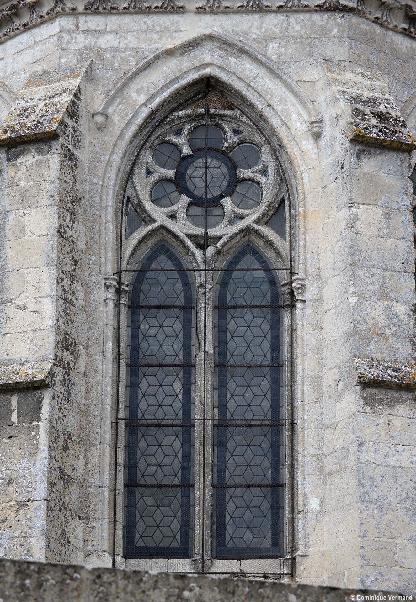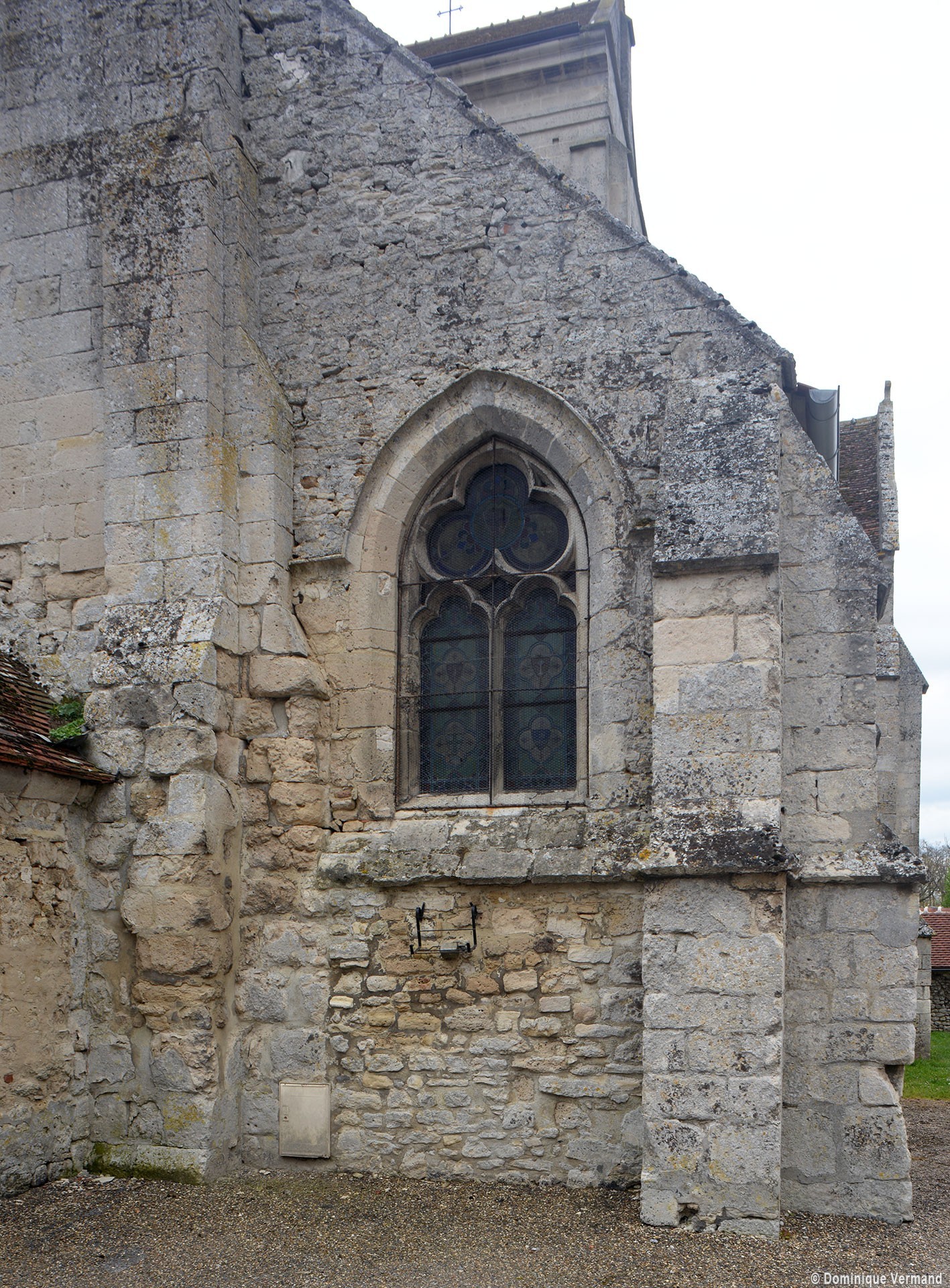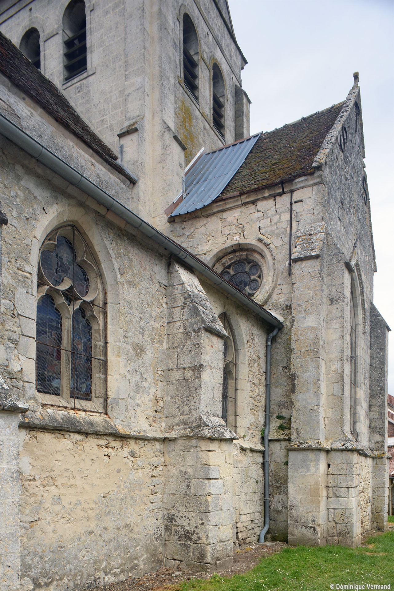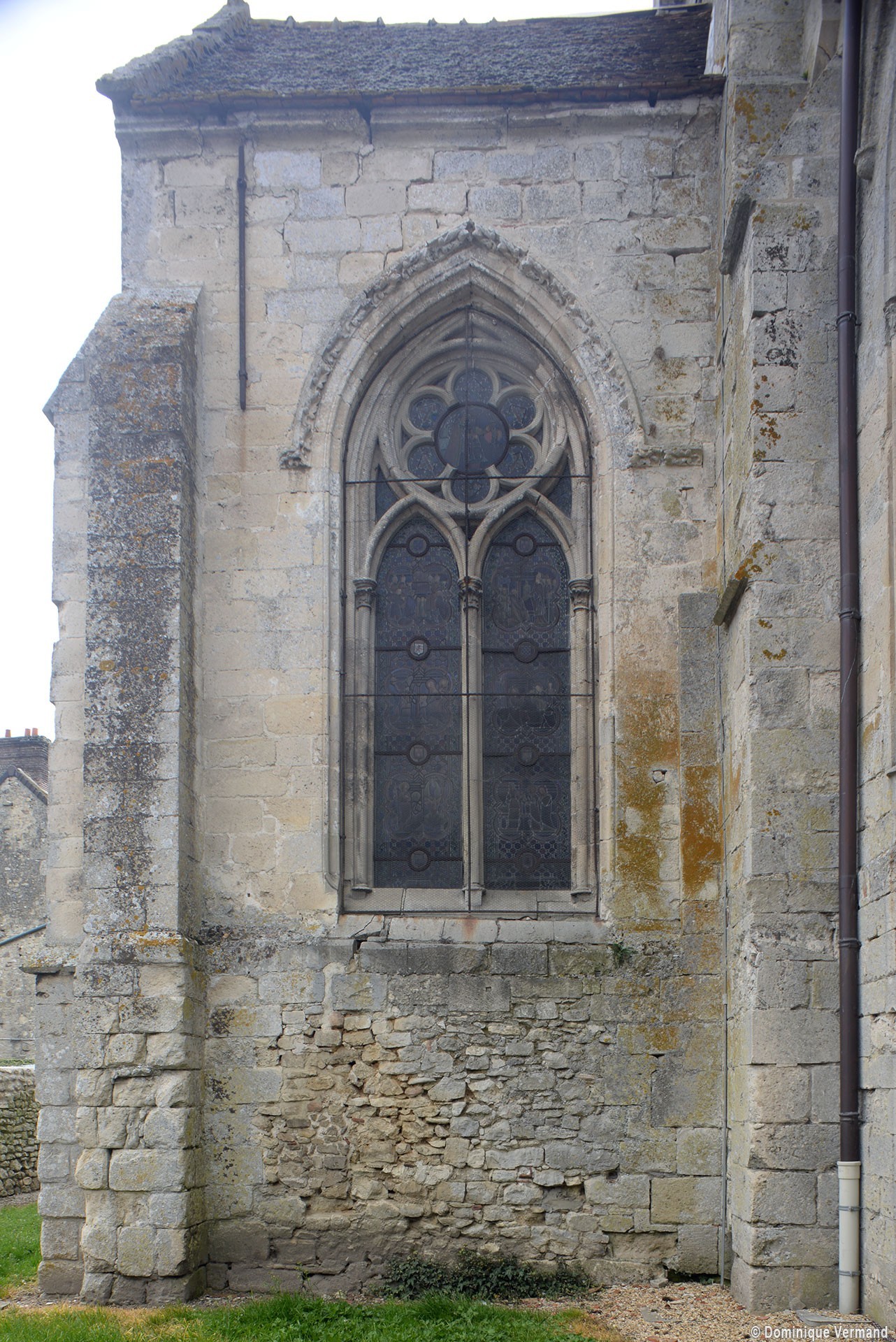 C’est au milieu du 13ème siècle que l’église fut dotée d’un nouveau choeur qui, malgré ses dimensions modestes, est une oeuvre architecturale élégante et raffinée, bien représentative de la période dite “rayonnante” qui caractérise le gothique à partir des années 1230. Constitué d’une travée droite et d’une abside à cinq pans, il est largement ajouré de fenêtres composées de deux lancettes surmontées d’une rose à six lobes, qui prennent appui sur un soubassement animé d’arcatures aveugles en arc brisé. Par sa conception et la qualité de son exécution, ce choeur s’inscrit donc dans le courant architectural le plus novateur qui accompagne le règne de saint Louis.