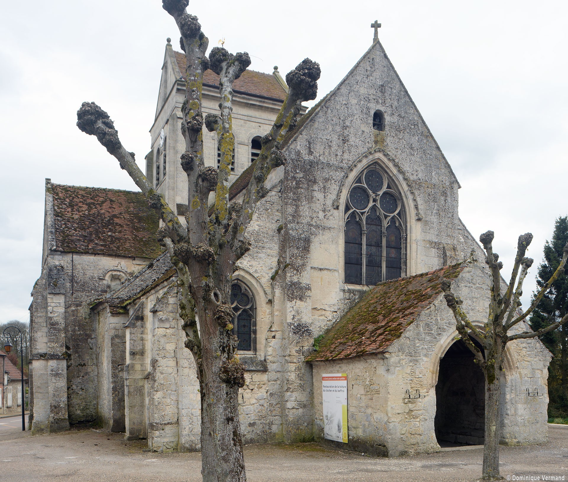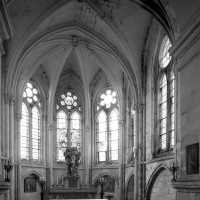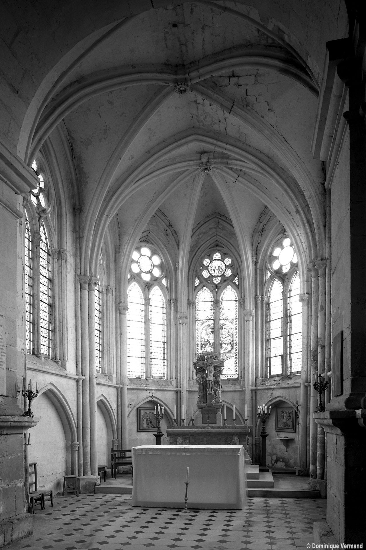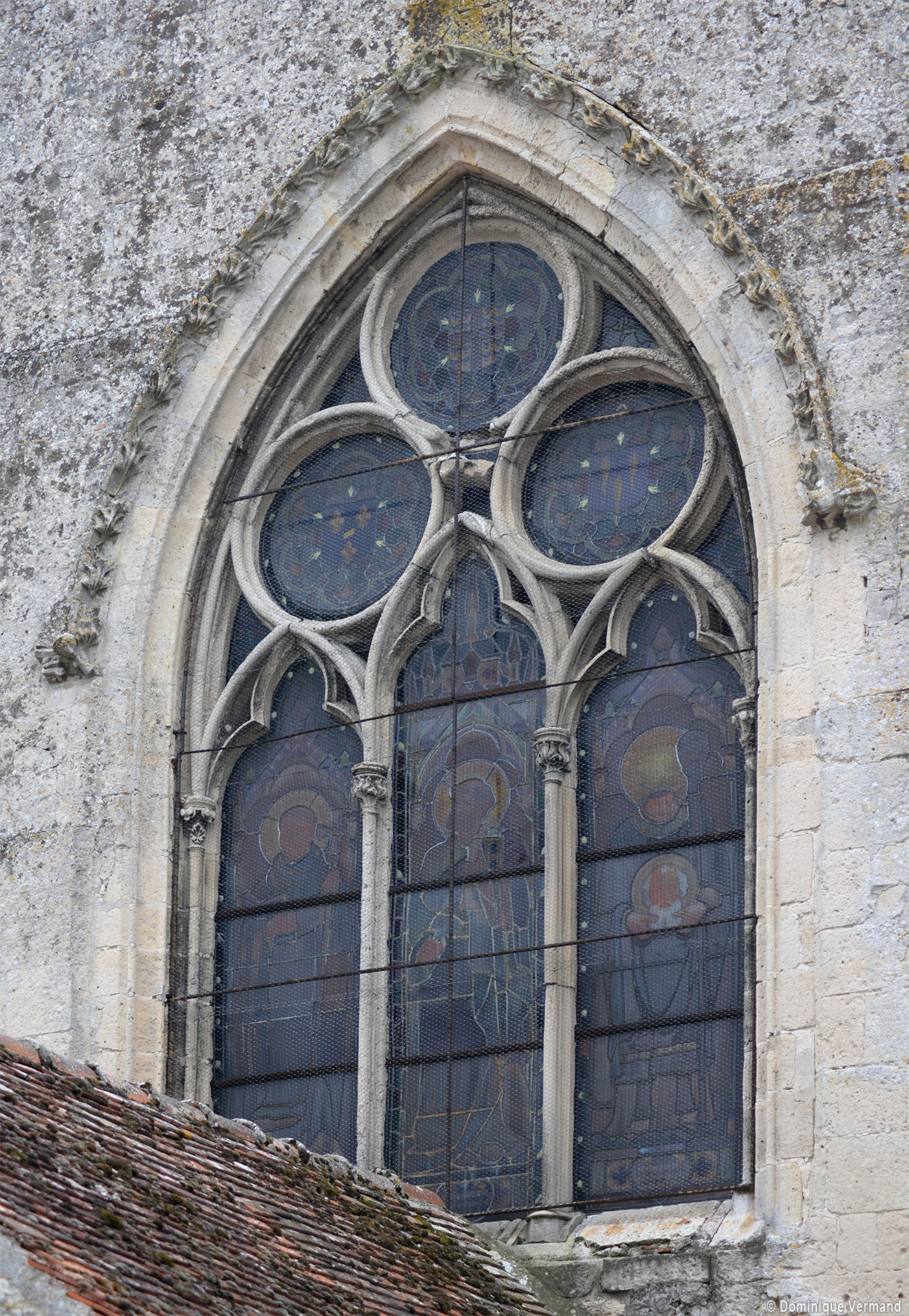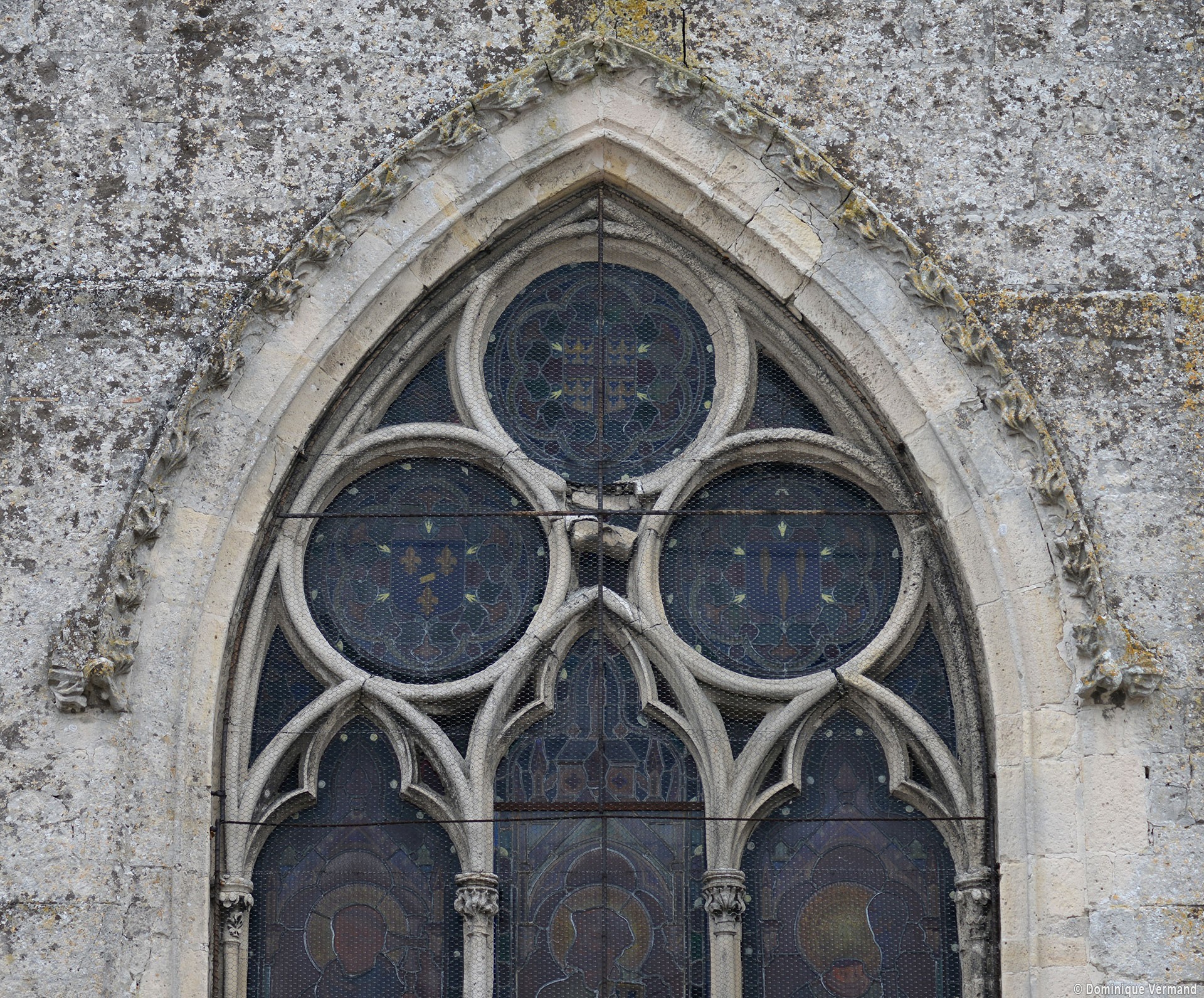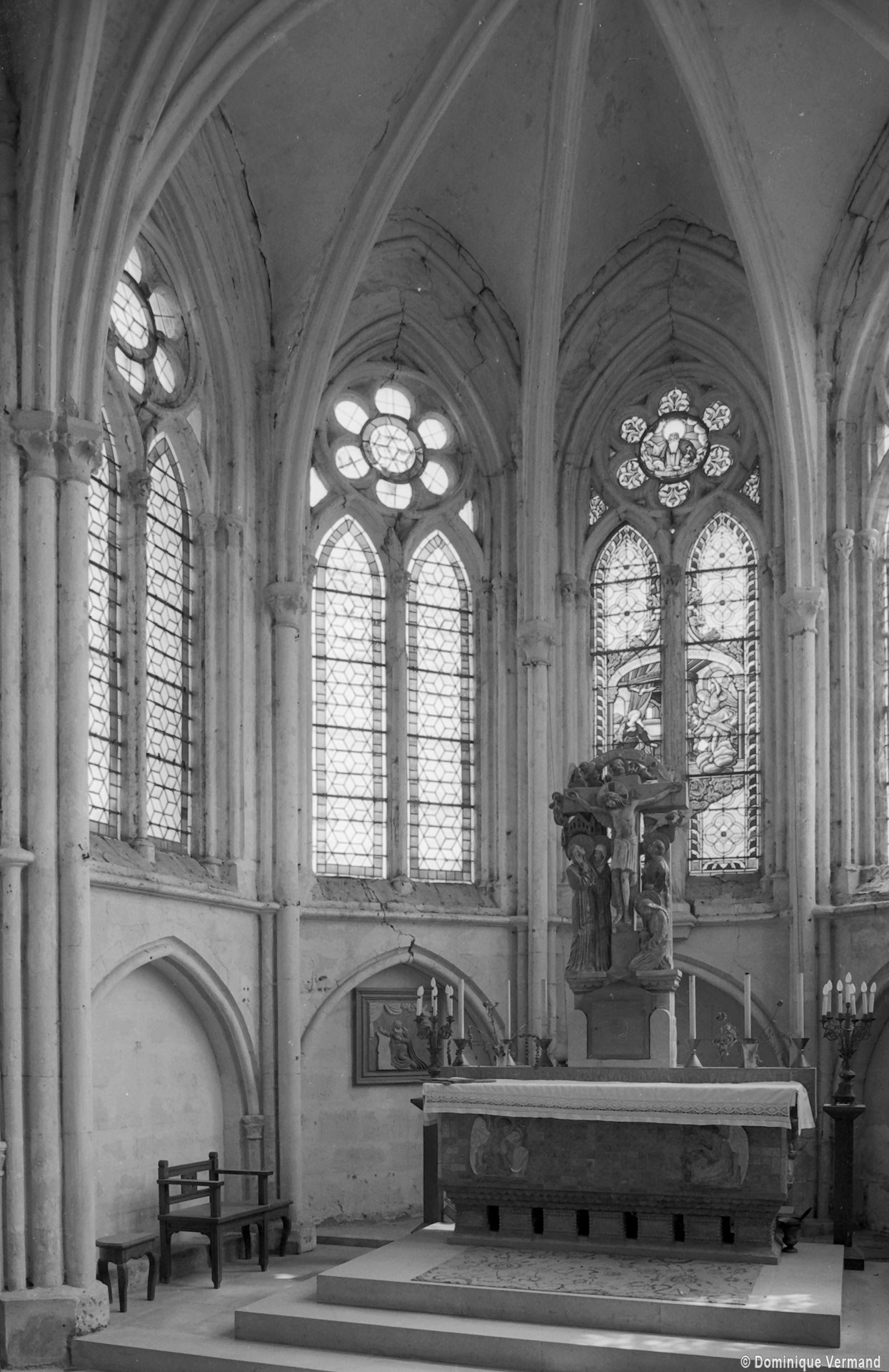 C’est au milieu du 13ème siècle que l’église fut dotée d’un nouveau choeur qui, malgré ses dimensions modestes, est une oeuvre architecturale élégante et raffinée, bien représentative de la période dite “rayonnante” qui caractérise le gothique à partir des années 1230. Constitué d’une travée droite et d’une abside à cinq pans, il est largement ajouré de fenêtres composées de deux lancettes surmontées d’une rose à six lobes, qui prennent appui sur un soubassement animé d’arcatures aveugles en arc brisé. Par sa conception et la qualité de son exécution, ce choeur s’inscrit donc dans le courant architectural le plus novateur qui accompagne le règne de saint Louis.