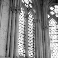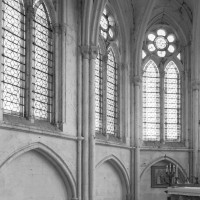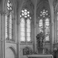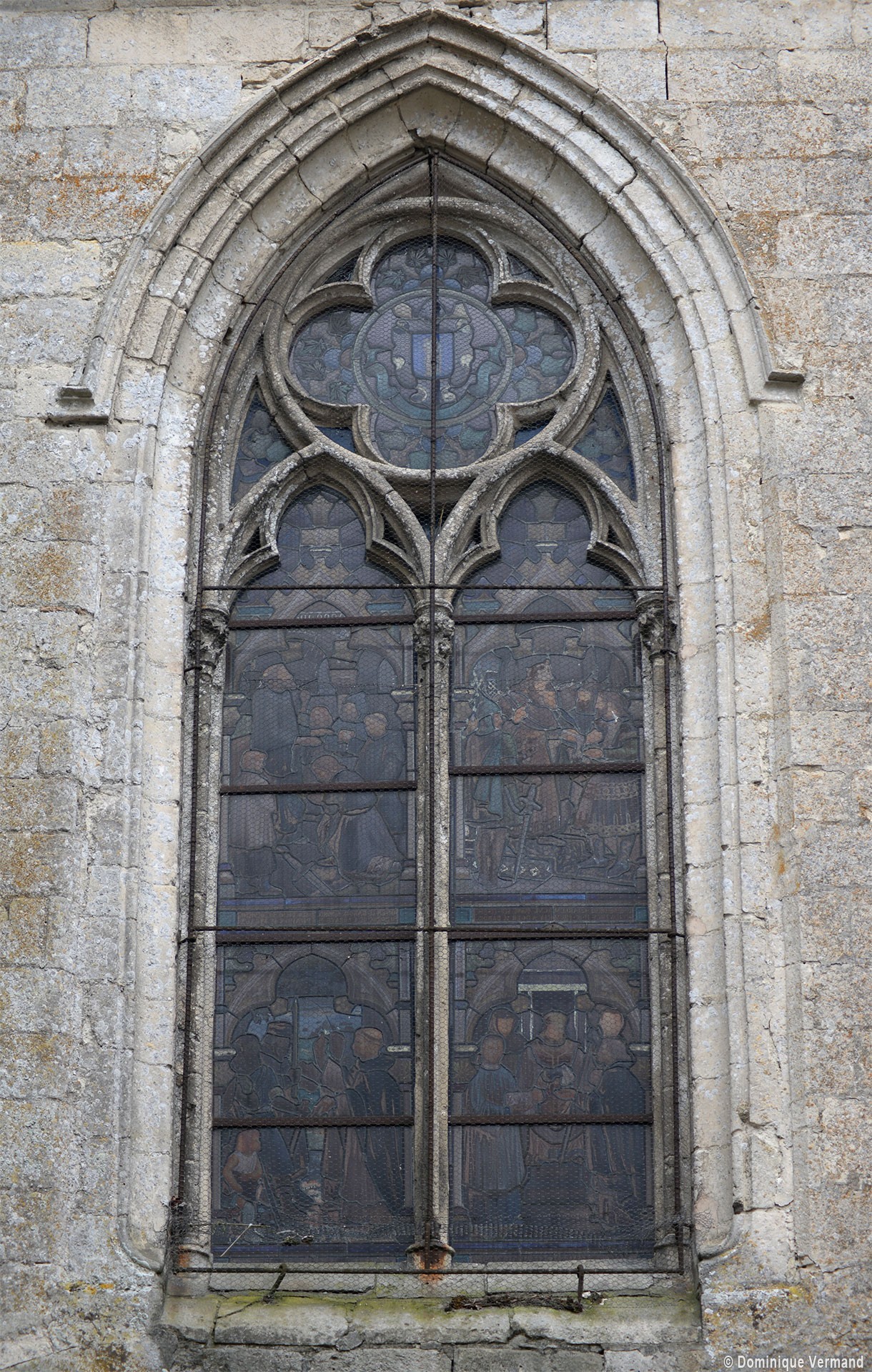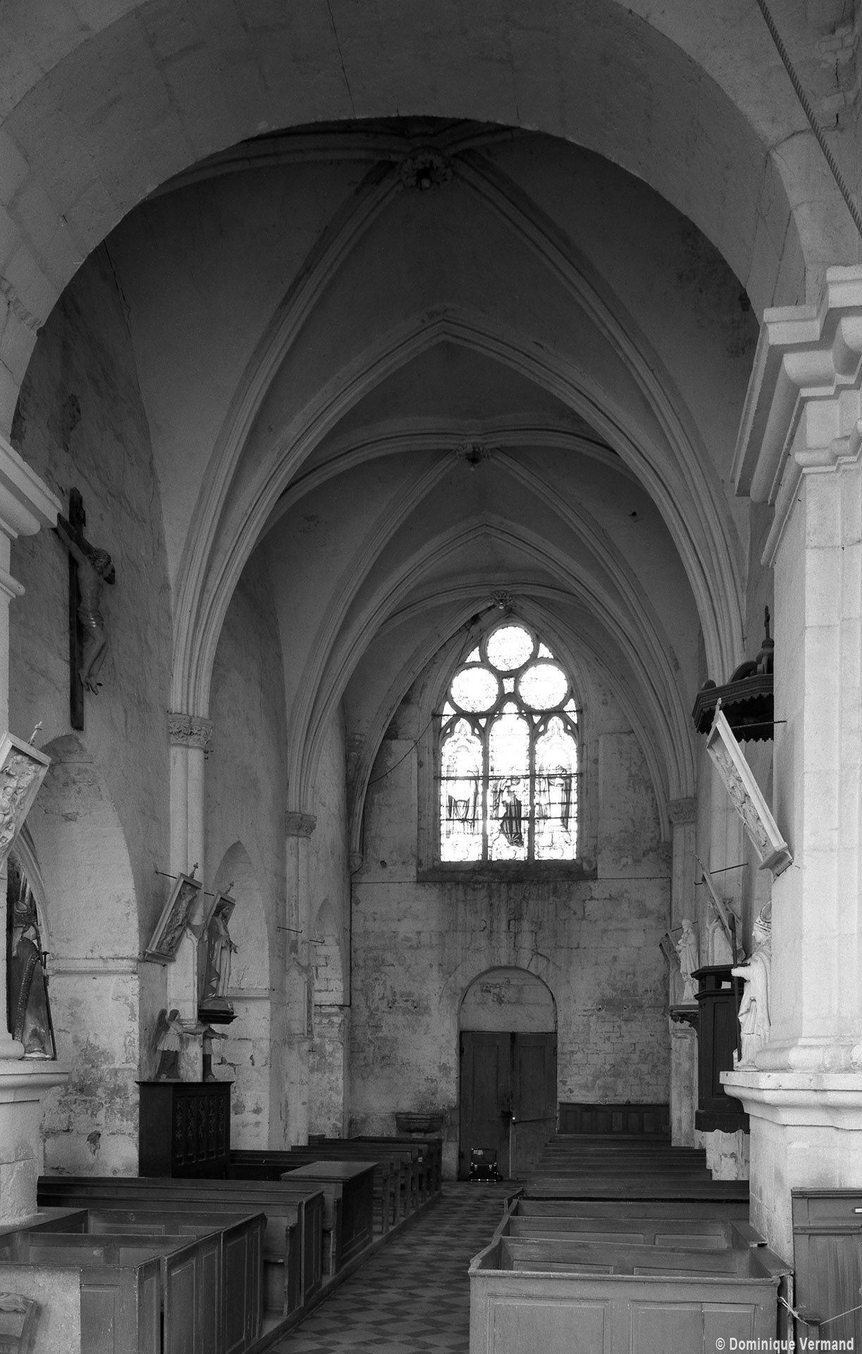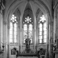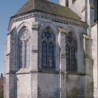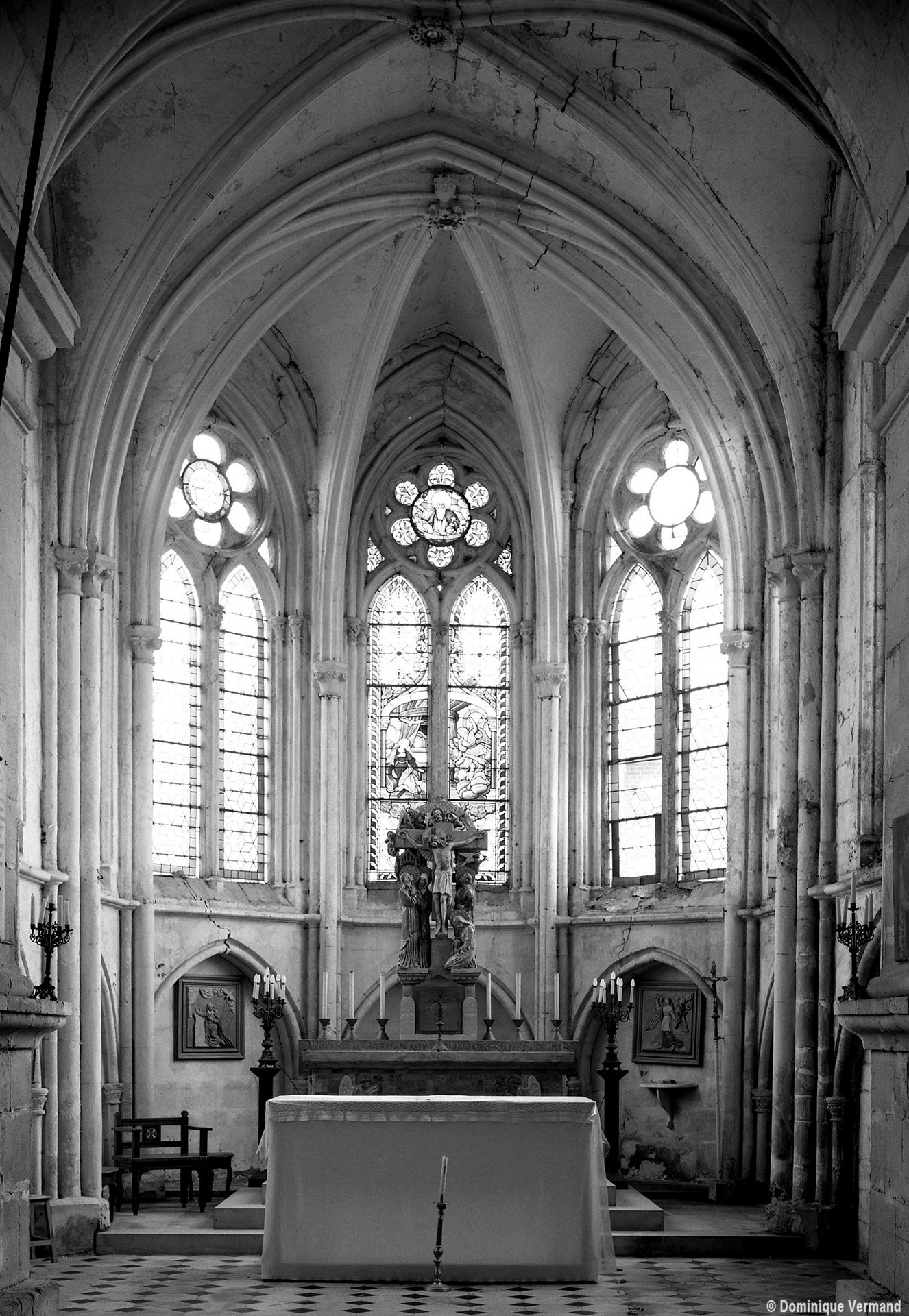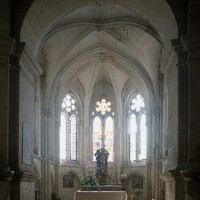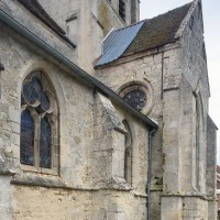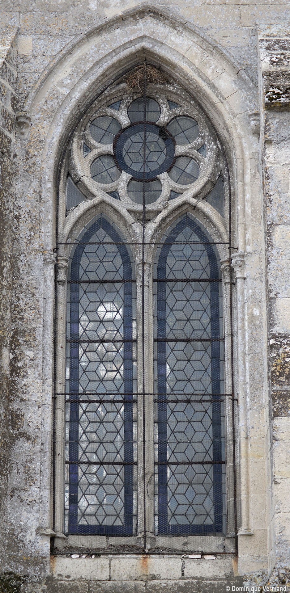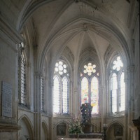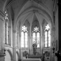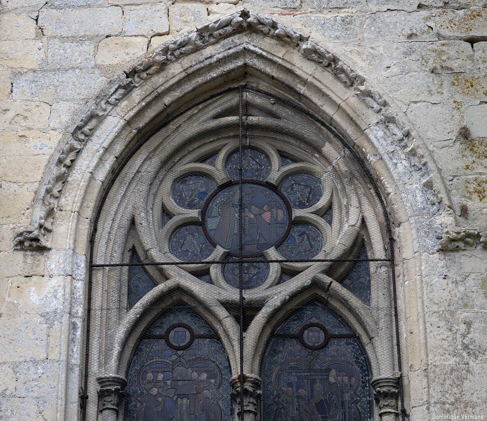C’est au milieu du 13ème siècle que l’église fut dotée d’un nouveau choeur qui, malgré ses dimensions modestes, est une oeuvre architecturale élégante et raffinée, bien représentative de la période dite “rayonnante” qui caractérise le gothique à partir des années 1230. Constitué d’une travée droite et d’une abside à cinq pans, il est largement ajouré de fenêtres composées de deux lancettes surmontées d’une rose à six lobes, qui prennent appui sur un soubassement animé d’arcatures aveugles en arc brisé. Par sa conception et la qualité de son exécution, ce choeur s’inscrit donc dans le courant architectural le plus novateur qui accompagne le règne de saint Louis.