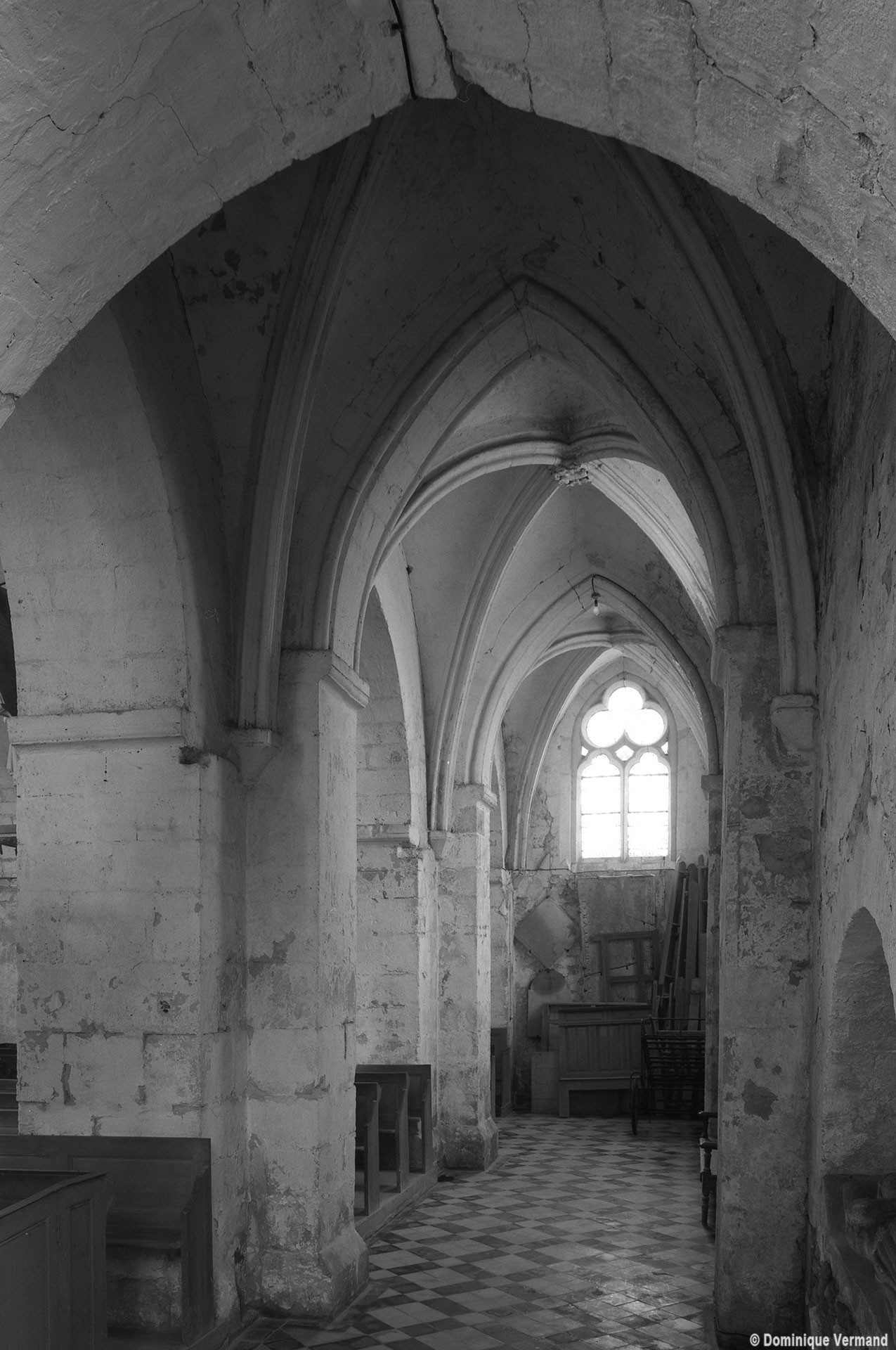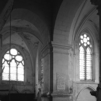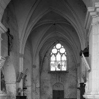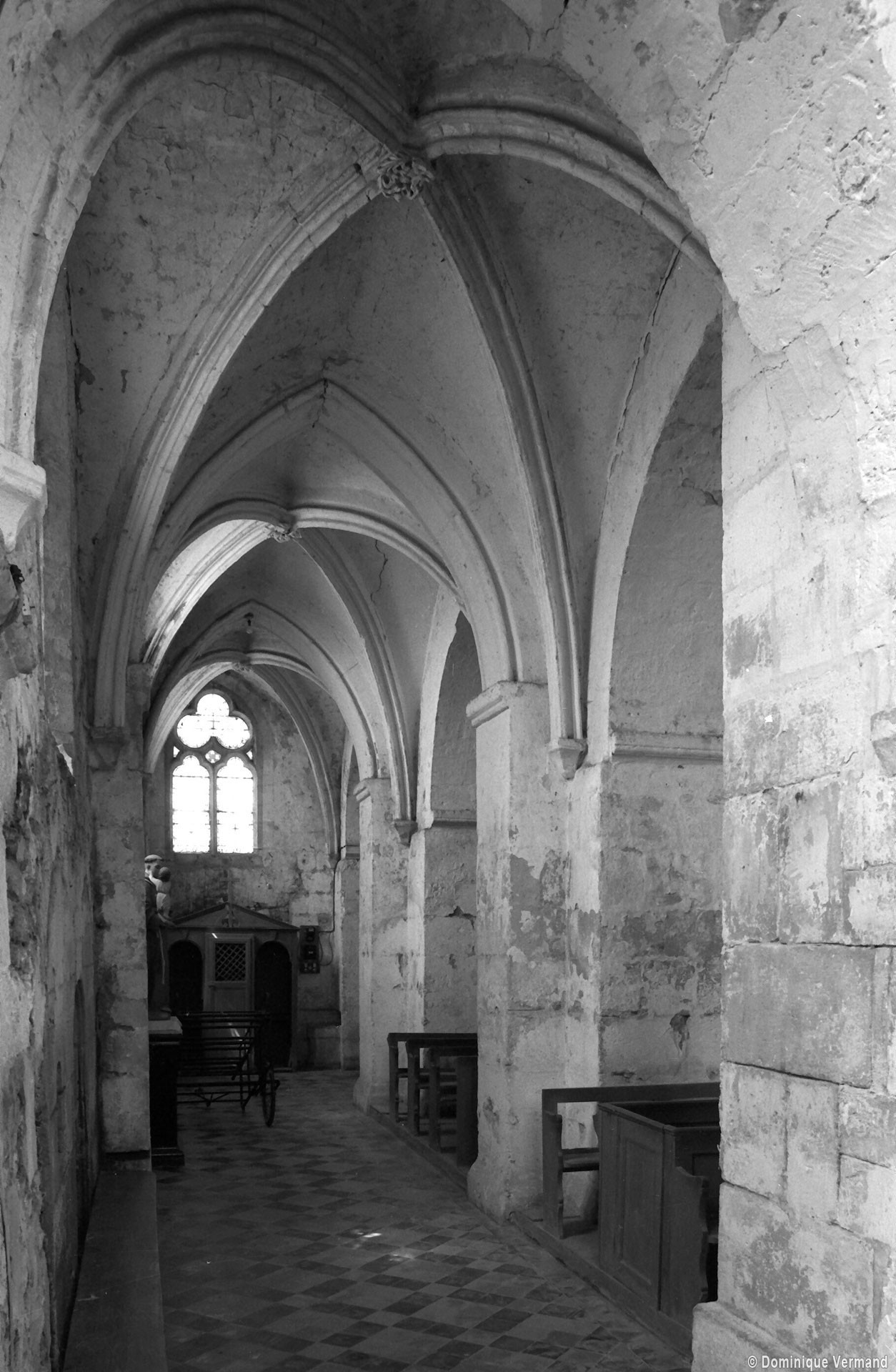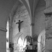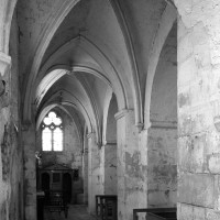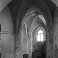 Les murs gouttereaux de la nef unique du 12ème siècle furent ainsi percés de trois arcades brisées pour assurer la communication avec les collatéraux, puis surhaussés de plus de deux mètres pour permettre la greffe de trois voûtes d’ogives. Les retombées de celles-ci s’effectuent selon un parti très original, le faisceau de colonnettes recevant la voûte étant interrompu à mi-hauteur par un ensemble de trois petits panneaux surmontés d’arcatures trilobées, réservés dans la pierre et sans doute peints à l’origine des figures des apôtres comme leur nombre total – douze – pourrait le suggérer.