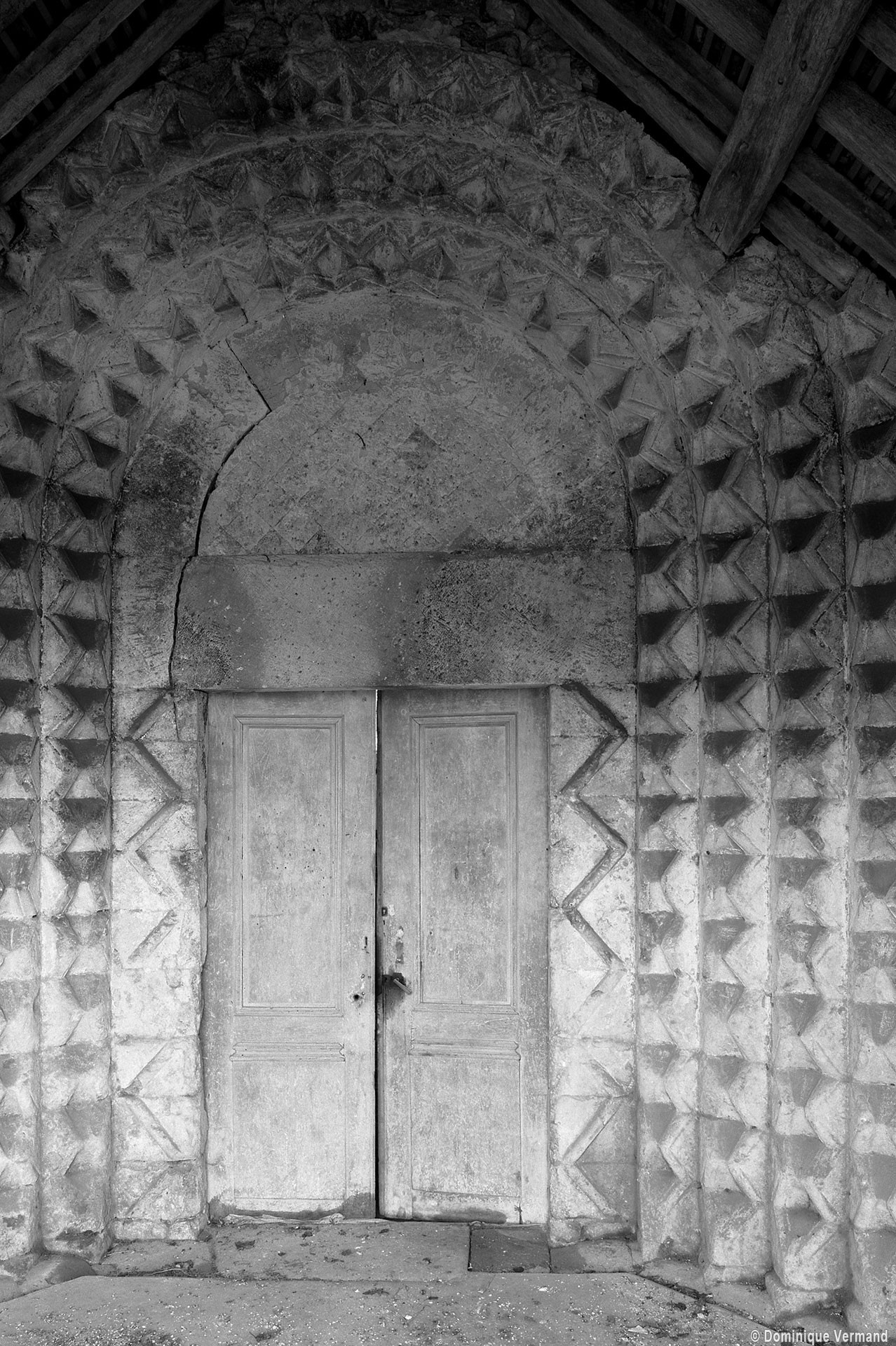 La nef, fortement remaniée par la suite, remonte au premier quart du 12ème siècle. Elle ne comportait pas alors de bas-côtés comme l’attestent les contreforts encore visibles en retour de la partie centrale de la façade, noyés ensuite dans les maçonneries des bas-côtés. Deux fenêtres, condamnées au 13ème siècle par le voûtement de la nef, éclairaient chacun des murs gouttereaux. En façade s’est conservé un spectaculaire portail à quatre voussures décorées de bâtons brisés formant comme des grosses pointes de diamant, qui est identique à celui de Saint-Vaast-de-Longmont. Un petit porche le protège depuis la fin du 13ème siècle.